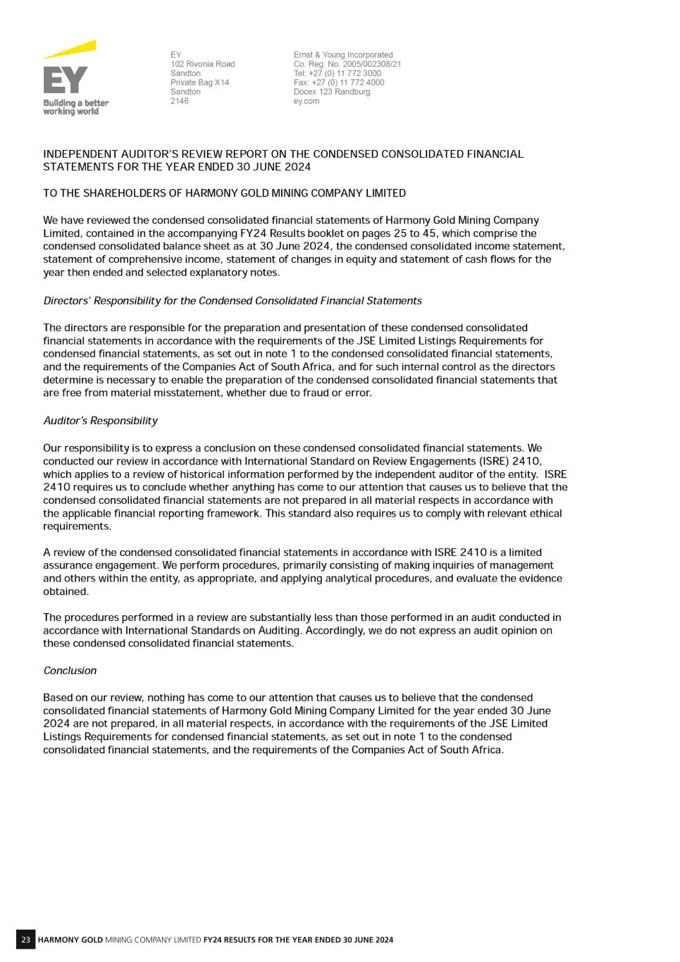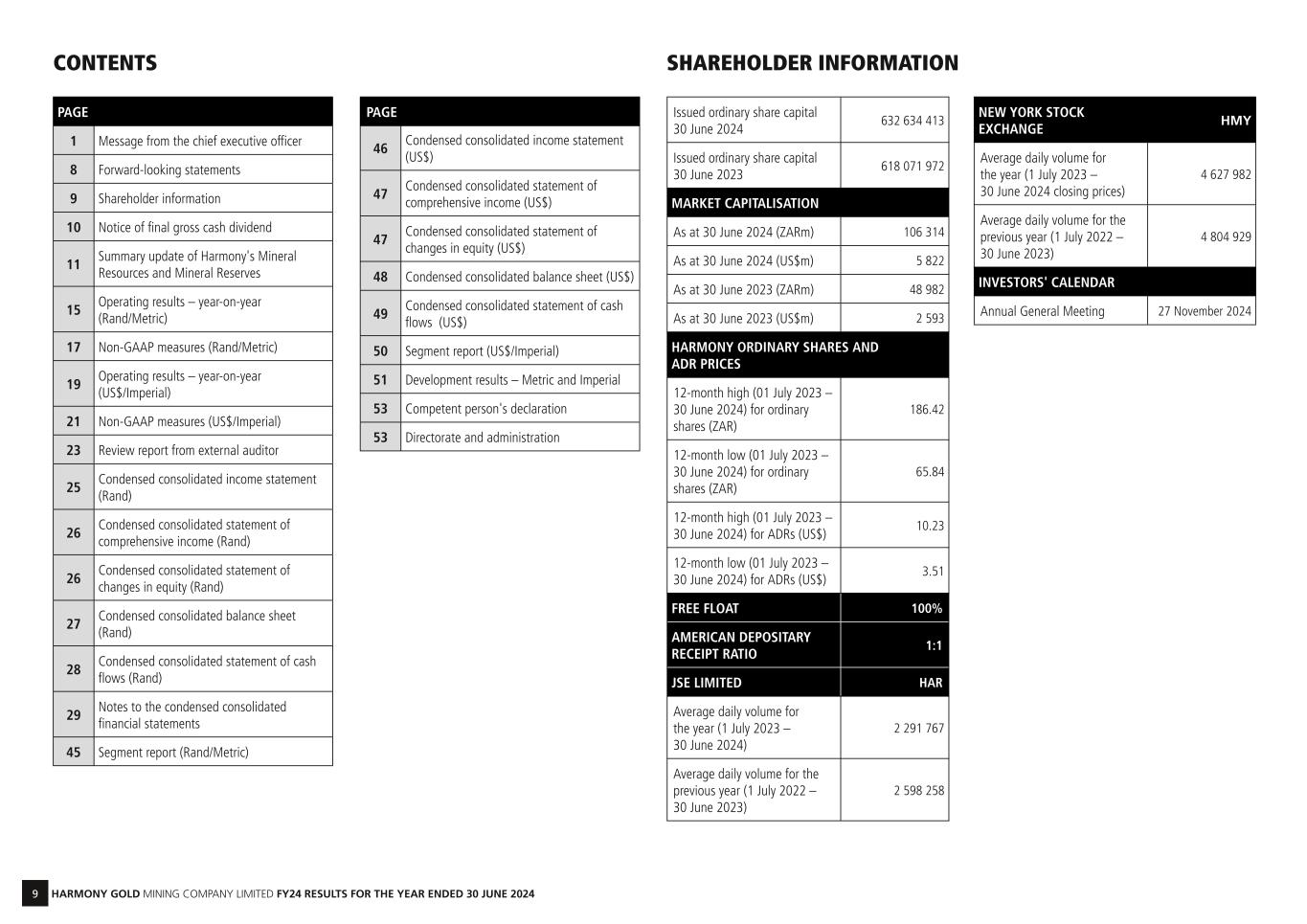 9 HARMONY GOLD MINING COMPANY LIMITED FY24 RESULTS FOR THE YEAR ENDED 30 JUNE 2024 PAGE 1 Message from the chief executive officer 8 Forward-looking statements 9 Shareholder information 10 Notice of final gross cash dividend 11 Summary update of Harmony's Mineral Resources and Mineral Reserves 15 Operating results – year-on-year (Rand/Metric) 17 Non-GAAP measures (Rand/Metric) 19 Operating results – year-on-year (US$/Imperial) 21 Non-GAAP measures (US$/Imperial) 23 Review report from external auditor 25 Condensed consolidated income statement (Rand) 26 Condensed consolidated statement of comprehensive income (Rand) 26 Condensed consolidated statement of changes in equity (Rand) 27 Condensed consolidated balance sheet (Rand) 28 Condensed consolidated statement of cash flows (Rand) 29 Notes to the condensed consolidated financial statements 45 Segment report (Rand/Metric) 46 Condensed consolidated income statement (US$) 47 Condensed consolidated statement of comprehensive income (US$) 47 Condensed consolidated statement of changes in equity (US$) 48 Condensed consolidated balance sheet (US$) 49 Condensed consolidated statement of cash flows (US$) 50 Segment report (US$/Imperial) 51 Development results – Metric and Imperial 53 Competent person's declaration 53 Directorate and administration PAGE CONTENTS Issued ordinary share capital 30 June 2024 632 634 413 Issued ordinary share capital 30 June 2023 618 071 972 MARKET CAPITALISATION As at 30 June 2024 (ZARm) 106 314 As at 30 June 2024 (US$m) 5 822 As at 30 June 2023 (ZARm) 48 982 As at 30 June 2023 (US$m) 2 593 HARMONY ORDINARY SHARES AND ADR PRICES 12-month high (01 July 2023 – 30 June 2024) for ordinary shares (ZAR) 186.42 12-month low (01 July 2023 – 30 June 2024) for ordinary shares (ZAR) 65.84 12-month high (01 July 2023 – 30 June 2024) for ADRs (US$) 10.23 12-month low (01 July 2023 – 30 June 2024) for ADRs (US$) 3.51 FREE FLOAT 100% AMERICAN DEPOSITARY RECEIPT RATIO 1:1 JSE LIMITED HAR Average daily volume for the year (1 July 2023 – 30 June 2024) 2 291 767 Average daily volume for the previous year (1 July 2022 – 30 June 2023) 2 598 258 SHAREHOLDER INFORMATION NEW YORK STOCK EXCHANGE HMY Average daily volume for the year (1 July 2023 – 30 June 2024 closing prices) 4 627 982 Average daily volume for the previous year (1 July 2022 – 30 June 2023) 4 804 929 INVESTORS' CALENDAR Annual General Meeting 27 November 2024