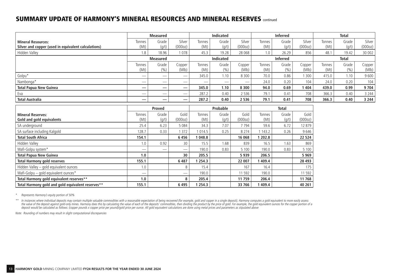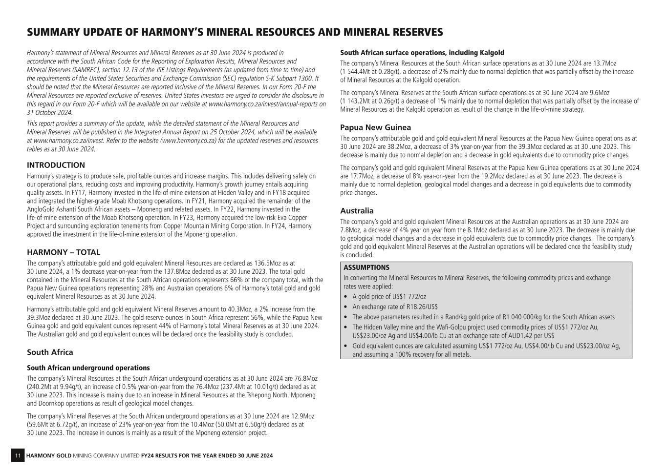 11 HARMONY GOLD MINING COMPANY LIMITED FY24 RESULTS FOR THE YEAR ENDED 30 JUNE 2024 Harmony’s statement of Mineral Resources and Mineral Reserves as at 30 June 2024 is produced in accordance with the South African Code for the Reporting of Exploration Results, Mineral Resources and Mineral Reserves (SAMREC), section 12.13 of the JSE Listings Requirements (as updated from time to time) and the requirements of the United States Securities and Exchange Commission (SEC) regulation S-K Subpart 1300. It should be noted that the Mineral Resources are reported inclusive of the Mineral Reserves. In our Form 20-F the Mineral Resources are reported exclusive of reserves. United States investors are urged to consider the disclosure in this regard in our Form 20-F which will be available on our website at www.harmony.co.za/invest/annual-reports on 31 October 2024. This report provides a summary of the update, while the detailed statement of the Mineral Resources and Mineral Reserves will be published in the Integrated Annual Report on 25 October 2024, which will be available at www.harmony.co.za/invest. Refer to the website (www.harmony.co.za) for the updated reserves and resources tables as at 30 June 2024. INTRODUCTION Harmony’s strategy is to produce safe, profitable ounces and increase margins. This includes delivering safely on our operational plans, reducing costs and improving productivity. Harmony’s growth journey entails acquiring quality assets. In FY17, Harmony invested in the life-of-mine extension at Hidden Valley and in FY18 acquired and integrated the higher-grade Moab Khotsong operations. In FY21, Harmony acquired the remainder of the AngloGold Ashanti South African assets – Mponeng and related assets. In FY22, Harmony invested in the life-of-mine extension of the Moab Khotsong operation. In FY23, Harmony acquired the low-risk Eva Copper Project and surrounding exploration tenements from Copper Mountain Mining Corporation. In FY24, Harmony approved the investment in the life-of-mine extension of the Mponeng operation. HARMONY – TOTAL The company’s attributable gold and gold equivalent Mineral Resources are declared as 136.5Moz as at 30 June 2024, a 1% decrease year-on-year from the 137.8Moz declared as at 30 June 2023. The total gold contained in the Mineral Resources at the South African operations represents 66% of the company total, with the Papua New Guinea operations representing 28% and Australian operations 6% of Harmony’s total gold and gold equivalent Mineral Resources as at 30 June 2024. Harmony’s attributable gold and gold equivalent Mineral Reserves amount to 40.3Moz, a 2% increase from the 39.3Moz declared at 30 June 2023. The gold reserve ounces in South Africa represent 56%, while the Papua New Guinea gold and gold equivalent ounces represent 44% of Harmony’s total Mineral Reserves as at 30 June 2024. The Australian gold and gold equivalent ounces will be declared once the feasibility study is concluded. South Africa South African underground operations The company’s Mineral Resources at the South African underground operations as at 30 June 2024 are 76.8Moz (240.2Mt at 9.94g/t), an increase of 0.5% year-on-year from the 76.4Moz (237.4Mt at 10.01g/t) declared as at 30 June 2023. This increase is mainly due to an increase in Mineral Resources at the Tshepong North, Mponeng and Doornkop operations as result of geological model changes. The company’s Mineral Reserves at the South African underground operations as at 30 June 2024 are 12.9Moz (59.6Mt at 6.72g/t), an increase of 23% year-on-year from the 10.4Moz (50.0Mt at 6.50g/t) declared as at 30 June 2023. The increase in ounces is mainly as a result of the Mponeng extension project. South African surface operations, including Kalgold The company’s Mineral Resources at the South African surface operations as at 30 June 2024 are 13.7Moz (1 544.4Mt at 0.28g/t), a decrease of 2% mainly due to normal depletion that was partially offset by the increase of Mineral Resources at the Kalgold operation. The company’s Mineral Reserves at the South African surface operations as at 30 June 2024 are 9.6Moz (1 143.2Mt at 0.26g/t) a decrease of 1% mainly due to normal depletion that was partially offset by the increase of Mineral Resources at the Kalgold operation as result of the change in the life-of-mine strategy. Papua New Guinea The company’s attributable gold and gold equivalent Mineral Resources at the Papua New Guinea operations as at 30 June 2024 are 38.2Moz, a decrease of 3% year-on-year from the 39.3Moz declared as at 30 June 2023. This decrease is mainly due to normal depletion and a decrease in gold equivalents due to commodity price changes. The company’s gold and gold equivalent Mineral Reserves at the Papua New Guinea operations as at 30 June 2024 are 17.7Moz, a decrease of 8% year-on-year from the 19.2Moz declared as at 30 June 2023. The decrease is mainly due to normal depletion, geological model changes and a decrease in gold equivalents due to commodity price changes. Australia The company’s gold and gold equivalent Mineral Resources at the Australian operations as at 30 June 2024 are 7.8Moz, a decrease of 4% year on year from the 8.1Moz declared as at 30 June 2023. The decrease is mainly due to geological model changes and a decrease in gold equivalents due to commodity price changes. The company’s gold and gold equivalent Mineral Reserves at the Australian operations will be declared once the feasibility study is concluded. ASSUMPTIONS In converting the Mineral Resources to Mineral Reserves, the following commodity prices and exchange rates were applied: • A gold price of US$1 772/oz • An exchange rate of R18.26/US$ • The above parameters resulted in a Rand/kg gold price of R1 040 000/kg for the South African assets • The Hidden Valley mine and the Wafi-Golpu project used commodity prices of US$1 772/oz Au, US$23.00/oz Ag and US$4.00/lb Cu at an exchange rate of AUD1.42 per 