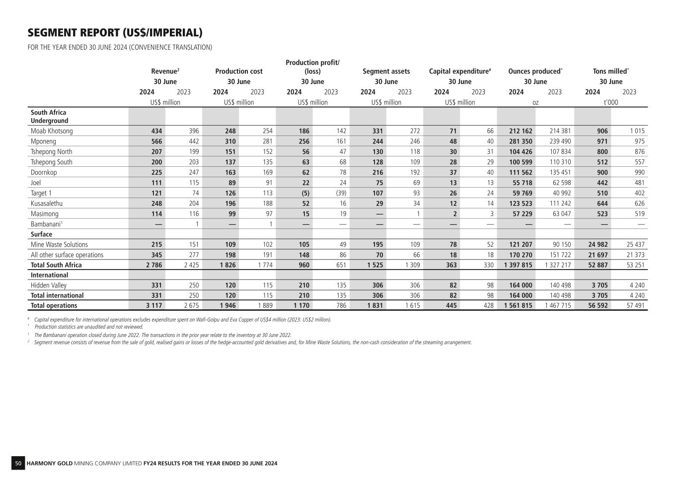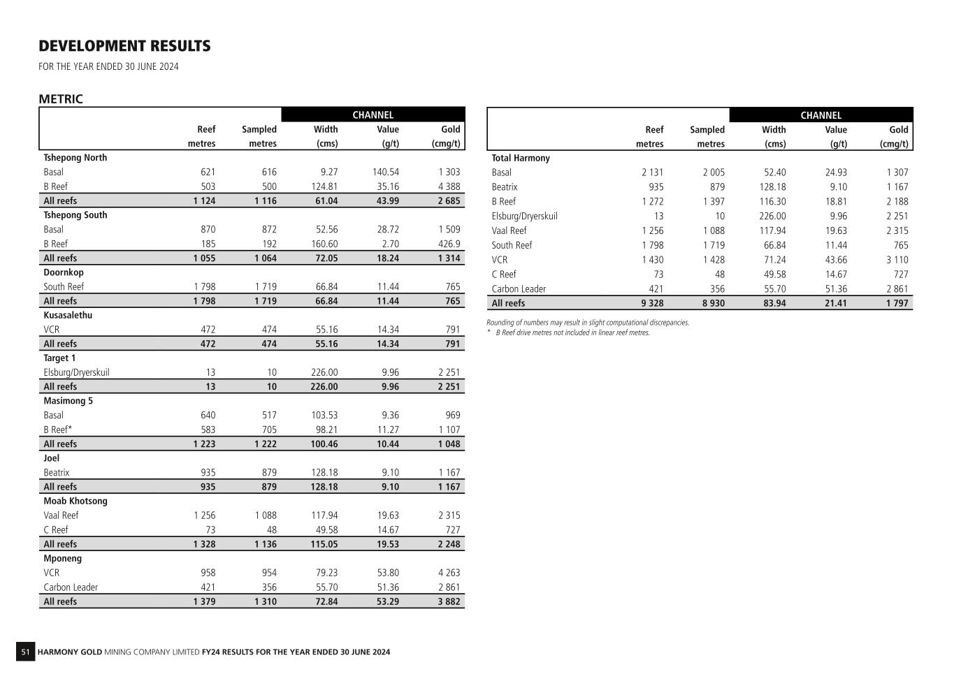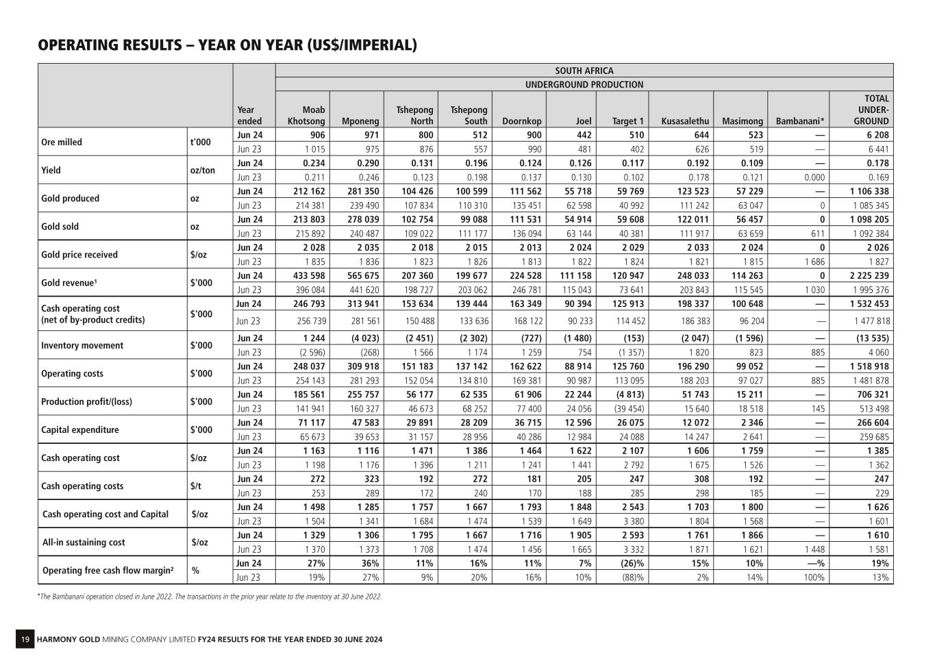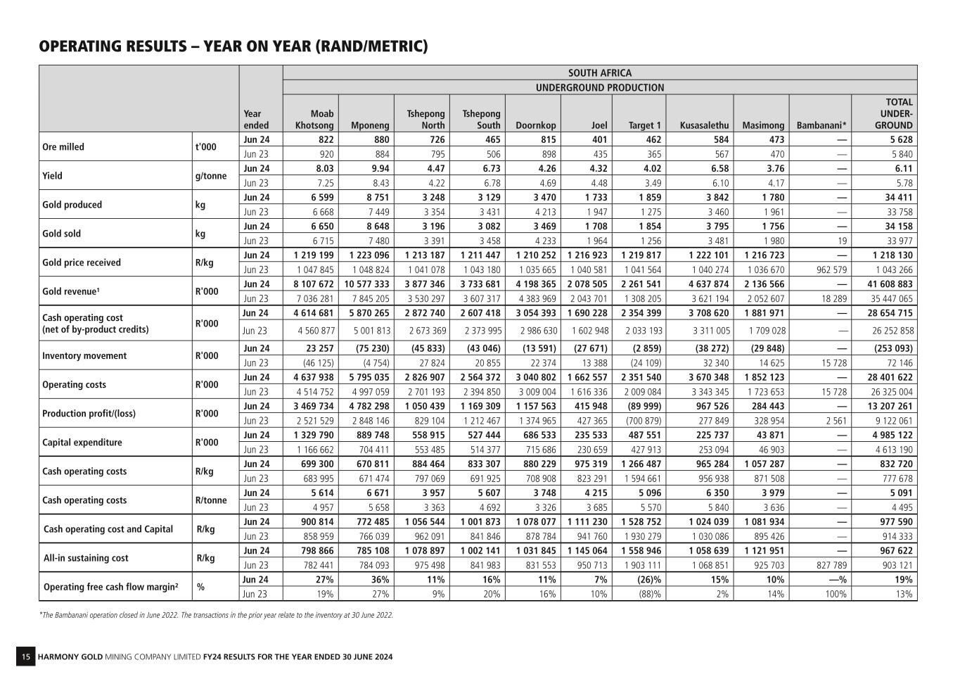 15 HARMONY GOLD MINING COMPANY LIMITED FY24 RESULTS FOR THE YEAR ENDED 30 JUNE 2024 Year ended SOUTH AFRICA UNDERGROUND PRODUCTION Moab Khotsong Mponeng Tshepong North Tshepong South Doornkop Joel Target 1 Kusasalethu Masimong Bambanani* TOTAL UNDER- GROUND Ore milled t'000 Jun 24 822 880 726 465 815 401 462 584 473 — 5 628 Jun 23 920 884 795 506 898 435 365 567 470 — 5 840 Yield g/tonne Jun 24 8.03 9.94 4.47 6.73 4.26 4.32 4.02 6.58 3.76 — 6.11 Jun 23 7.25 8.43 4.22 6.78 4.69 4.48 3.49 6.10 4.17 — 5.78 Gold produced kg Jun 24 6 599 8 751 3 248 3 129 3 470 1 733 1 859 3 842 1 780 — 34 411 Jun 23 6 668 7 449 3 354 3 431 4 213 1 947 1 275 3 460 1 961 — 33 758 Gold sold kg Jun 24 6 650 8 648 3 196 3 082 3 469 1 708 1 854 3 795 1 756 — 34 158 Jun 23 6 715 7 480 3 391 3 458 4 233 1 964 1 256 3 481 1 980 19 33 977 Gold price received R/kg Jun 24 1 219 199 1 223 096 1 213 187 1 211 447 1 210 252 1 216 923 1 219 817 1 222 101 1 216 723 — 1 218 130 Jun 23 1 047 845 1 048 824 1 041 078 1 043 180 1 035 665 1 040 581 1 041 564 1 040 274 1 036 670 962 579 1 043 266 Gold revenue¹ R'000 Jun 24 8 107 672 10 577 333 3 877 346 3 733 681 4 198 365 2 078 505 2 261 541 4 637 874 2 136 566 — 41 608 883 Jun 23 7 036 281 7 845 205 3 530 297 3 607 317 4 383 969 2 043 701 1 308 205 3 621 194 2 052 607 18 289 35 447 065 Cash operating cost (net of by-product credits) R'000 Jun 24 4 614 681 5 870 265 2 872 740 2 607 418 3 054 393 1 690 228 2 354 399 3 708 620 1 881 971 — 28 654 715 Jun 23 4 560 877 5 001 813 2 673 369 2 373 995 2 986 630 1 602 948 2 033 193 3 311 005 1 709 028 — 26 252 858 Inventory movement R'000 Jun 24 23 257 (75 230) (45 833) (43 046) (13 591) (27 671) (2 859) (38 272) (29 848) — (253 093) Jun 23 (46 125) (4 754) 27 824 20 855 22 374 13 388 (24 109) 32 340 14 625 15 728 72 146 Operating costs R'000 Jun 24 4 637 938 5 795 035 2 826 907 2 564 372 3 040 802 1 662 557 2 351 540 3 670 348 1 852 123 — 28 401 622 Jun 23 4 514 752 4 997 059 2 701 193 2 394 850 3 009 004 1 616 336 2 009 084 3 343 345 1 723 653 15 728 26 325 004 Production profit/(loss) R'000 Jun 24 3 469 734 4 782 298 1 050 439 1 169 309 1 157 563 415 948 (89 999) 967 526 284 443 — 13 207 261 Jun 23 2 521 529 2 848 146 829 104 1 212 467 1 374 965 427 365 (700 879) 277 849 328 954 2 561 9 122 061 Capital expenditure R'000 Jun 24 1 329 790 889 748 558 915 527 444 686 533 235 533 487 551 225 737 43 871 — 4 985 122 Jun 23 1 166 662 704 411 553 485 514 377 715 686 230 659 427 913 253 094 46 903 — 4 613 190 Cash operating costs R/kg Jun 24 699 300 670 811 884 464 833 307 880 229 975 319 1 266 487 965 284 1 057 287 — 832 720 Jun 23 683 995 671 474 797 069 691 925 708 908 823 291 1 594 661 956 938 871 508 — 777 678 Cash operating costs R/tonne Jun 24 5 614 6 671 3 957 5 607 3 748 4 215 5 096 6 350 3 979 — 5 091 Jun 23 4 957 5 658 3 363 4 692 3 326 3 685 5 570 5 840 3 636 — 4 495 Cash operating cost and Capital R/kg Jun 24 900 814 772 485 1 056 544 1 001 873 1 078 077 1 111 230 1 528 752 1 024 039 1 081 934 — 977 590 Jun 23 858 959 766 039 962 091 841 846 878 784 941 760 1 930 279 1 030 086 895 426 — 914 333 All-in sustaining cost R/kg Jun 24 798 866 785 108 1 078 897 1 002 141 1 031 845 1 145 064 1 558 946 1 058 639 1 121 951 — 967 622 Jun 23 782 441 784 093 975 498 841 983 831 553 950 713 1 903 111 1 068 851 925 703 827 789 903 121 Operating free cash flow margin² % Jun 24 27% 36% 11% 16% 11% 7% (26)% 15% 10% —% 19% Jun 23 19% 27% 9% 20% 16% 10% (88)% 2% 14% 100% 13% OPERATING RESULTS – YEAR ON YEAR (RAND/METRIC) *The Bambanani operation closed in June 2022. The transactions in the prior year relate to the inventory at 30 June 2022.