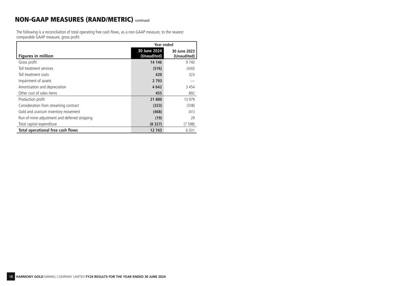 17 HARMONY GOLD MINING COMPANY LIMITED FY24 RESULTS FOR THE YEAR ENDED 30 JUNE 2024 The information presented in this report contains non-GAAP measures. The company presents the following non-GAAP measures: All-in sustaining cost, all-in sustaining costs per kilogram, all-in cost, cash operating costs, operating free cash flow. These measures should not be considered by investors in isolation or as an alternative to production costs, cost of sales, or any other measure of financial performance calculated in accordance with IFRS. Rounding differences may occur in the below reconciliations provided. The calculations of these non-GAAP measures may vary significantly among gold mining companies and, by themselves, do not necessarily provide a basis for comparison with other gold mining companies. Nevertheless, Harmony believes that these measures are useful indicators to investors and management as they provide an indication of profitability, efficiency and cash flows, the trend in costs as the mining operations mature over time on a consistent basis and an internal benchmark of performance to allow for comparison against other mines, both within the group and at other gold mining companies. The following is a reconciliation of total all-in sustaining costs, as a non-GAAP measure, to the nearest comparable GAAP measure, cost of sales: Year ended Figures in million 30 June 2024 (Unaudited) 30 June 2023 (Unaudited) Cost of sales 47 233 39 535 Amortisation and depreciation (4 642) (3 454) Rehabilitation expenditure (3) (32) Care and maintenance costs of restructured shafts (246) (227) Employment termination and restructuring costs (86) (597) Share-based payments (171) (51) Impairment of assets (2 793) — Toll treatment costs (420) (323) By-products credits (2 533) (1 325) Stripping activities 892 1 514 Local economic development expenditure 165 189 Corporate, administration and other expenditure costs 1 140 1 044 Capital expenditure (OCD) 2 547 2 614 Capital expenditure (exploration, abnormal expenditure and shaft capital) 1 895 1 402 Other 496 364 Total all-in sustaining costs 43 474 40 653 Per kilogram calculation: Kilograms sold 48 222 45 690 Total all-in sustaining costs per kilogram 901 550 889 766 The following is a reconciliation of total all-in costs, as a non-GAAP measure, to the all-in sustaining costs, which has been reconciled above to the nearest comparable GAAP measure, cost of sales: Year ended Figures in million 30 June 2024 (Unaudited) 30 June 2023 (Unaudited) Total all-in sustaining costs 43 474 40 653 Social expenditure (non-sustaining) 47 35 Exploration (non-sustaining) 216 146 Capital expenditure (exploration, abnormal expenditure and shaft capital) (non-sustaining) 2 994 2 068 Other (non-sustaining) — 1 Total all-in costs 46 731 42 903 Per kilogram calculation: Kilograms sold 48 222 45 690 Total all-in costs per kilogram 969 085 938 997 The following is a reconciliation of total cash operating costs, as a non-GAAP measure, to the nearest comparable GAAP measure, cost of sales: Year ended Figures in million 30 June 2024 (Unaudited) 30 June 2023 (Unaudited) Cost of sales 47 233 39 535 Amortisation and depreciation (4 642) (3 454) Rehabilitation expenditure (3) (32) Care and maintenance costs of restructured shafts (246) (227) Employment termination and restructuring costs (86) (597) Share-based payments (171) (51) Impairment of assets (2 793) — By-products credits (2 533) (1 325) Gold and uranium inventory movement 468 894 Other (369) (1 161) Total cash operating costs 36 858 33 582 Per kilogram calculation: Kilogram produced 48 578 45 651 Total cash operating costs per kilogram 758 736 735 634 NON-GAAP MEASURES (RAND/METRIC)