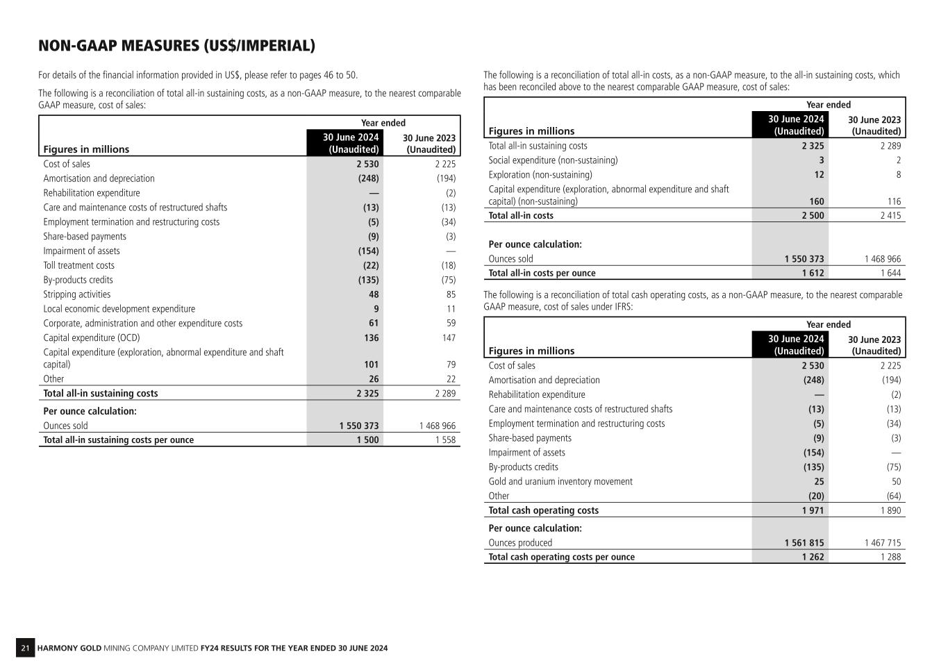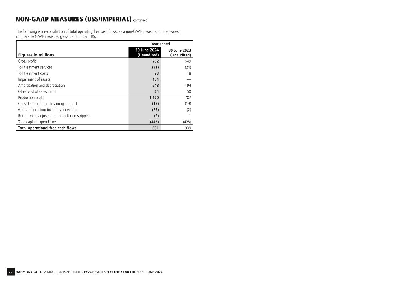 21 HARMONY GOLD MINING COMPANY LIMITED FY24 RESULTS FOR THE YEAR ENDED 30 JUNE 2024 For details of the financial information provided in US$, please refer to pages 46 to 50. The following is a reconciliation of total all-in sustaining costs, as a non-GAAP measure, to the nearest comparable GAAP measure, cost of sales: Year ended Figures in millions 30 June 2024 (Unaudited) 30 June 2023 (Unaudited) Cost of sales 2 530 2 225 Amortisation and depreciation (248) (194) Rehabilitation expenditure — (2) Care and maintenance costs of restructured shafts (13) (13) Employment termination and restructuring costs (5) (34) Share-based payments (9) (3) Impairment of assets (154) — Toll treatment costs (22) (18) By-products credits (135) (75) Stripping activities 48 85 Local economic development expenditure 9 11 Corporate, administration and other expenditure costs 61 59 Capital expenditure (OCD) 136 147 Capital expenditure (exploration, abnormal expenditure and shaft capital) 101 79 Other 26 22 Total all-in sustaining costs 2 325 2 289 Per ounce calculation: Ounces sold 1 550 373 1 468 966 Total all-in sustaining costs per ounce 1 500 1 558 The following is a reconciliation of total all-in costs, as a non-GAAP measure, to the all-in sustaining costs, which has been reconciled above to the nearest comparable GAAP measure, cost of sales: Year ended Figures in millions 30 June 2024 (Unaudited) 30 June 2023 (Unaudited) Total all-in sustaining costs 2 325 2 289 Social expenditure (non-sustaining) 3 2 Exploration (non-sustaining) 12 8 Capital expenditure (exploration, abnormal expenditure and shaft capital) (non-sustaining) 160 116 Total all-in costs 2 500 2 415 Per ounce calculation: Ounces sold 1 550 373 1 468 966 Total all-in costs per ounce 1 612 1 644 The following is a reconciliation of total cash operating costs, as a non-GAAP measure, to the nearest comparable GAAP measure, cost of sales under IFRS: Year ended Figures in millions 30 June 2024 (Unaudited) 30 June 2023 (Unaudited) Cost of sales 2 530 2 225 Amortisation and depreciation (248) (194) Rehabilitation expenditure — (2) Care and maintenance costs of restructured shafts (13) (13) Employment termination and restructuring costs (5) (34) Share-based payments (9) (3) Impairment of assets (154) — By-products credits (135) (75) Gold and uranium inventory movement 25 50 Other (20) (64) Total cash operating costs 1 971 1 890 Per ounce calculation: Ounces produced 1 561 815 1 467 715 Total cash operating costs per ounce 1 262 1 288 NON-GAAP MEASURES (US$/IMPERIAL)