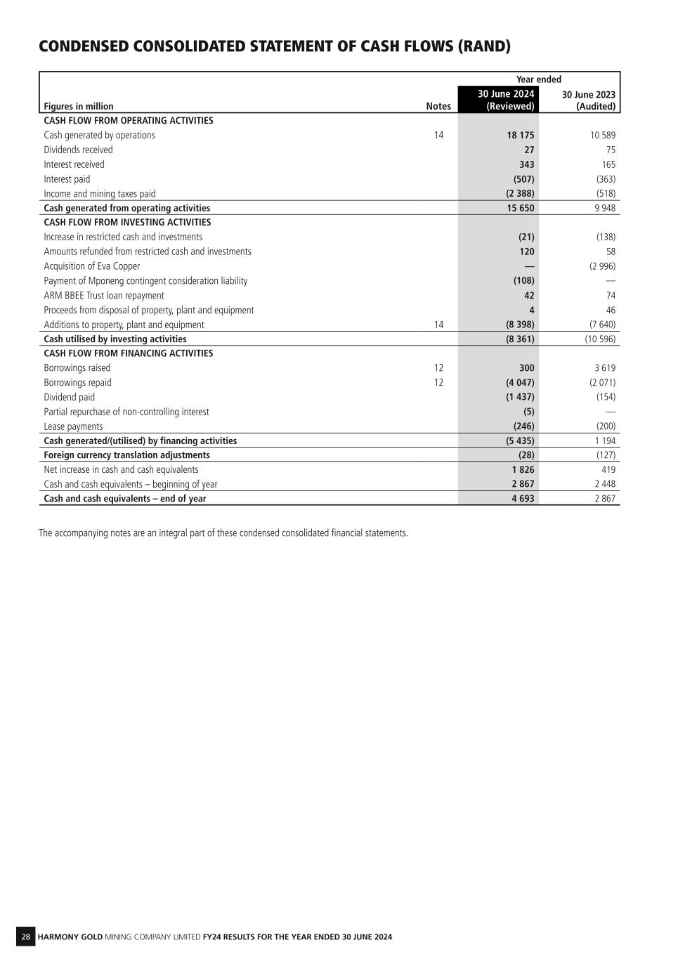 28 HARMONY GOLD MINING COMPANY LIMITED FY24 RESULTS FOR THE YEAR ENDED 30 JUNE 2024 Year ended Figures in million Notes 30 June 2024 (Reviewed) 30 June 2023 (Audited) CASH FLOW FROM OPERATING ACTIVITIES Cash generated by operations 14 18 175 10 589 Dividends received 27 75 Interest received 343 165 Interest paid (507) (363) Income and mining taxes paid (2 388) (518) Cash generated from operating activities 15 650 9 948 CASH FLOW FROM INVESTING ACTIVITIES Increase in restricted cash and investments (21) (138) Amounts refunded from restricted cash and investments 120 58 Acquisition of Eva Copper — (2 996) Payment of Mponeng contingent consideration liability (108) — ARM BBEE Trust loan repayment 42 74 Proceeds from disposal of property, plant and equipment 4 46 Additions to property, plant and equipment 14 (8 398) (7 640) Cash utilised by investing activities (8 361) (10 596) CASH FLOW FROM FINANCING ACTIVITIES Borrowings raised 12 300 3 619 Borrowings repaid 12 (4 047) (2 071) Dividend paid (1 437) (154) Partial repurchase of non-controlling interest (5) — Lease payments (246) (200) Cash generated/(utilised) by financing activities (5 435) 1 194 Foreign currency translation adjustments (28) (127) Net increase in cash and cash equivalents 1 826 419 Cash and cash equivalents – beginning of year 2 867 2 448 Cash and cash equivalents – end of year 4 693 2 867 The accompanying notes are an integral part of these condensed consolidated financial statements. CONDENSED CONSOLIDATED STATEMENT OF CASH FLOWS (RAND)