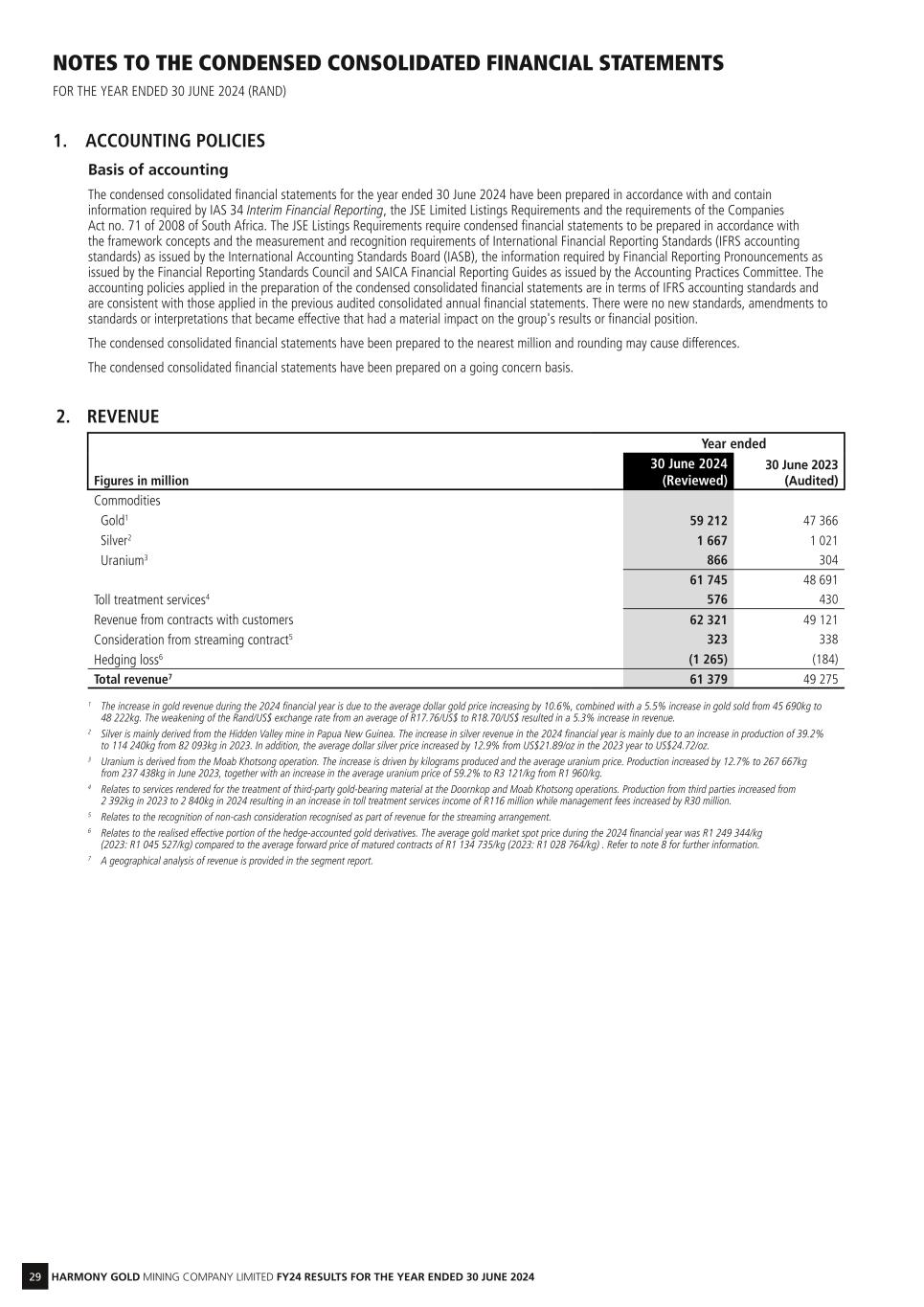 29 HARMONY GOLD MINING COMPANY LIMITED FY24 RESULTS FOR THE YEAR ENDED 30 JUNE 2024 NOTES TO THE CONDENSED CONSOLIDATED FINANCIAL STATEMENTS FOR THE YEAR ENDED 30 JUNE 2024 (RAND) 1. ACCOUNTING POLICIES Basis of accounting The condensed consolidated financial statements for the year ended 30 June 2024 have been prepared in accordance with and contain information required by IAS 34 Interim Financial Reporting, the JSE Limited Listings Requirements and the requirements of the Companies Act no. 71 of 2008 of South Africa. The JSE Listings Requirements require condensed financial statements to be prepared in accordance with the framework concepts and the measurement and recognition requirements of International Financial Reporting Standards (IFRS accounting standards) as issued by the International Accounting Standards Board (IASB), the information required by Financial Reporting Pronouncements as issued by the Financial Reporting Standards Council and SAICA Financial Reporting Guides as issued by the Accounting Practices Committee. The accounting policies applied in the preparation of the condensed consolidated financial statements are in terms of IFRS accounting standards and are consistent with those applied in the previous audited consolidated annual financial statements. There were no new standards, amendments to standards or interpretations that became effective that had a material impact on the group's results or financial position. The condensed consolidated financial statements have been prepared to the nearest million and rounding may cause differences. The condensed consolidated financial statements have been prepared on a going concern basis. 2. REVENUE Year ended Figures in million 30 June 2024 (Reviewed) 30 June 2023 (Audited) Commodities Gold1 59 212 47 366 Silver2 1 667 1 021 Uranium3 866 304 61 745 48 691 Toll treatment services4 576 430 Revenue from contracts with customers 62 321 49 121 Consideration from streaming contract5 323 338 Hedging loss6 (1 265) (184) Total revenue7 61 379 49 275 1 The increase in gold revenue during the 2024 financial year is due to the average dollar gold price increasing by 10.6%, combined with a 5.5% increase in gold sold from 45 690kg to 48 222kg. The weakening of the Rand/US$ exchange rate from an average of R17.76/US$ to R18.70/US$ resulted in a 5.3% increase in revenue. 2 Silver is mainly derived from the Hidden Valley mine in Papua New Guinea. The increase in silver revenue in the 2024 financial year is mainly due to an increase in production of 39.2% to 114 240kg from 82 093kg in 2023. In addition, the average dollar silver price increased by 12.9% from US$21.89/oz in the 2023 year to US$24.72/oz. 3 Uranium is derived from the Moab Khotsong operation. The increase is driven by kilograms produced and the average uranium price. Production increased by 12.7% to 267 667kg from 237 438kg in June 2023, together with an increase in the average uranium price of 59.2% to R3 121/kg from R1 960/kg. 4 Relates to services rendered for the treatment of third-party gold-bearing material at the Doornkop and Moab Khotsong operations. Production from third parties increased from 2 392kg in 2023 to 2 840kg in 2024 resulting in an increase in toll treatment services income of R116 million while management fees increased by R30 million. 5 Relates to the recognition of non-cash consideration recognised as part of revenue for the streaming arrangement. 6 Relates to the realised effective portion of the hedge-accounted gold derivatives. The average gold market spot price during the 2024 financial year was R1 249 344/kg (2023: R1 045 527/kg) compared to the average forward price of matured contracts of R1 134 735/kg (2023: R1 028 764/kg) . Refer to note 8 for further information. 7 A geographical analysis of revenue is provided in the segment report.