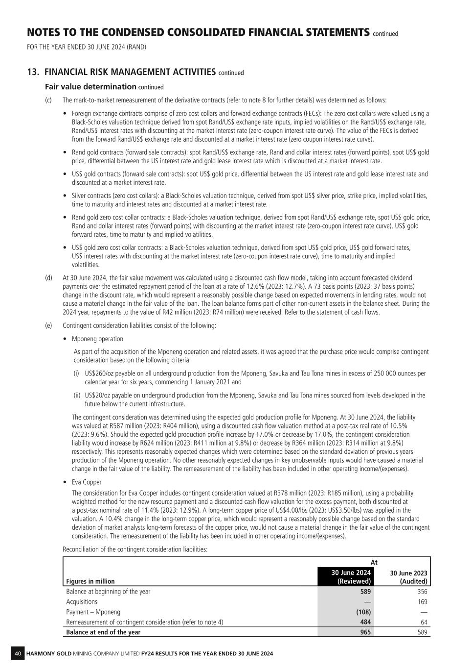 40 HARMONY GOLD MINING COMPANY LIMITED FY24 RESULTS FOR THE YEAR ENDED 30 JUNE 2024 NOTES TO THE CONDENSED CONSOLIDATED FINANCIAL STATEMENTS continued FOR THE YEAR ENDED 30 JUNE 2024 (RAND) 13. FINANCIAL RISK MANAGEMENT ACTIVITIES continued Fair value determination continued (c) The mark-to-market remeasurement of the derivative contracts (refer to note 8 for further details) was determined as follows: • Foreign exchange contracts comprise of zero cost collars and forward exchange contracts (FECs): The zero cost collars were valued using a Black-Scholes valuation technique derived from spot Rand/US$ exchange rate inputs, implied volatilities on the Rand/US$ exchange rate, Rand/US$ interest rates with discounting at the market interest rate (zero-coupon interest rate curve). The value of the FECs is derived from the forward Rand/US$ exchange rate and discounted at a market interest rate (zero coupon interest rate curve). • Rand gold contracts (forward sale contracts): spot Rand/US$ exchange rate, Rand and dollar interest rates (forward points), spot US$ gold price, differential between the US interest rate and gold lease interest rate which is discounted at a market interest rate. • US$ gold contracts (forward sale contracts): spot US$ gold price, differential between the US interest rate and gold lease interest rate and discounted at a market interest rate. • Silver contracts (zero cost collars): a Black-Scholes valuation technique, derived from spot US$ silver price, strike price, implied volatilities, time to maturity and interest rates and discounted at a market interest rate. • Rand gold zero cost collar contracts: a Black-Scholes valuation technique, derived from spot Rand/US$ exchange rate, spot US$ gold price, Rand and dollar interest rates (forward points) with discounting at the market interest rate (zero-coupon interest rate curve), US$ gold forward rates, time to maturity and implied volatilities. • US$ gold zero cost collar contracts: a Black-Scholes valuation technique, derived from spot US$ gold price, US$ gold forward rates, US$ interest rates with discounting at the market interest rate (zero-coupon interest rate curve), time to maturity and implied volatilities. (d) At 30 June 2024, the fair value movement was calculated using a discounted cash flow model, taking into account forecasted dividend payments over the estimated repayment period of the loan at a rate of 12.6% (2023: 12.7%). A 73 basis points (2023: 37 basis points) change in the discount rate, which would represent a reasonably possible change based on expected movements in lending rates, would not cause a material change in the fair value of the loan. The loan balance forms part of other non-current assets in the balance sheet. During the 2024 year, repayments to the value of R42 million (2023: R74 million) were received. Refer to the statement of cash flows. (e) Contingent consideration liabilities consist of the following: • Mponeng operation As part of the acquisition of the Mponeng operation and related assets, it was agreed that the purchase price would comprise contingent consideration based on the following criteria: (i) US$260/oz payable on all underground production from the Mponeng, Savuka and Tau Tona mines in excess of 250 000 ounces per calendar year for six years, commencing 1 January 2021 and (ii) US$20/oz payable on underground production from the Mponeng, Savuka and Tau Tona mines sourced from levels developed in the future below the current infrastructure. The contingent consideration was determined using the expected gold production profile for Mponeng. At 30 June 2024, the liability was valued at R587 million (2023: R404 million), using a discounted cash flow valuation method at a post-tax real rate of 10.5% (2023: 9.6%). Should the expected gold production profile increase by 17.0% or decrease by 17.0%, the contingent consideration liability would increase by R624 million (2023: R411 million at 9.8%) or decrease by R364 million (2023: R314 million at 9.8%) respectively. This represents reasonably expected changes which were determined based on the standard deviation of previous years' production of the Mponeng operation. No other reasonably expected changes in key unobservable inputs would have caused a material change in the fair value of the liability. The remeasurement of the liability has been included in other operating income/(expenses). • Eva Copper The consideration for Eva Copper includes contingent consideration valued at R378 million (2023: R185 million), using a probability weighted method for the new resource payment and a discounted cash flow valuation for the excess payment, both discounted at a post-tax nominal rate of 11.4% (2023: 12.9%). A long-term copper price of US$4.00/lbs (2023: US$3.50/lbs) was applied in the valuation. A 10.4% change in the long-term copper price, which would represent a reasonably possible change based on the standard deviation of market analysts long-term forecasts of the copper price, would not cause a material change in the fair value of the contingent consideration. The remeasurement of the liability has been included in other operating income/(expenses). Reconciliation of the contingent consideration liabilities: At Figures in million 30 June 2024 (Reviewed) 30 June 2023 (Audited) Balance at beginning of the year 589 356 Acquisitions — 169 Payment – Mponeng (108) — Remeasurement of contingent consideration (refer to note 4) 484 64 Balance at end of the year 965 589