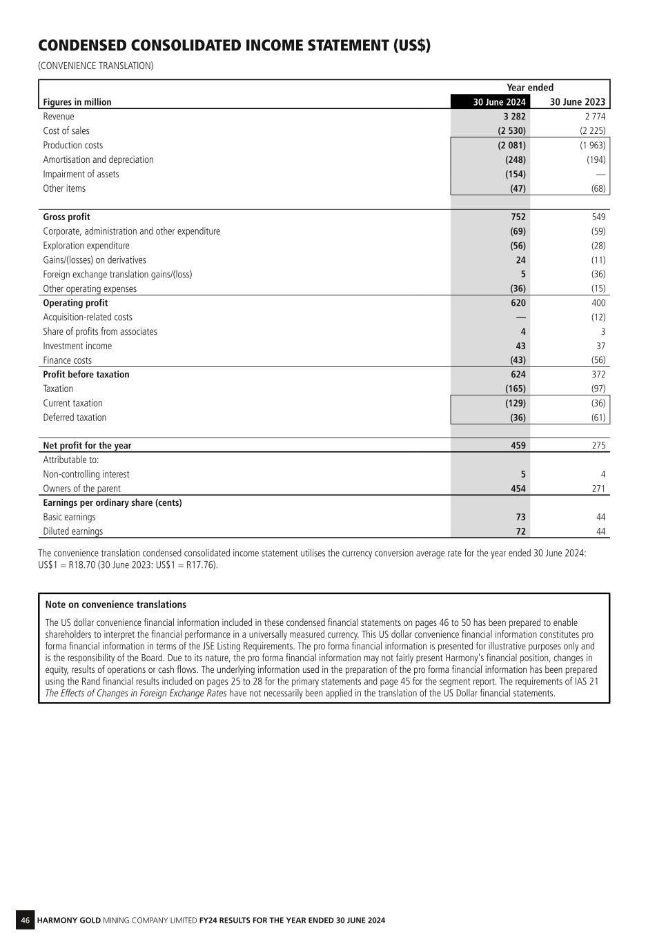 46 HARMONY GOLD MINING COMPANY LIMITED FY24 RESULTS FOR THE YEAR ENDED 30 JUNE 2024 CONDENSED CONSOLIDATED INCOME STATEMENT (US$) (CONVENIENCE TRANSLATION) Year ended Figures in million 30 June 2024 30 June 2023 Revenue 3 282 2 774 Cost of sales (2 530) (2 225) Production costs (2 081) (1 963) Amortisation and depreciation (248) (194) Impairment of assets (154) — Other items (47) (68) Gross profit 752 549 Corporate, administration and other expenditure (69) (59) Exploration expenditure (56) (28) Gains/(losses) on derivatives 24 (11) Foreign exchange translation gains/(loss) 5 (36) Other operating expenses (36) (15) Operating profit 620 400 Acquisition-related costs — (12) Share of profits from associates 4 3 Investment income 43 37 Finance costs (43) (56) Profit before taxation 624 372 Taxation (165) (97) Current taxation (129) (36) Deferred taxation (36) (61) Net profit for the year 459 275 Attributable to: Non-controlling interest 5 4 Owners of the parent 454 271 Earnings per ordinary share (cents) Basic earnings 73 44 Diluted earnings 72 44 The convenience translation condensed consolidated income statement utilises the currency conversion average rate for the year ended 30 June 2024: US$1 = R18.70 (30 June 2023: US$1 = R17.76). Note on convenience translations The US dollar convenience financial information included in these condensed financial statements on pages 46 to 50 has been prepared to enable shareholders to interpret the financial performance in a universally measured currency. This US dollar convenience financial information constitutes pro forma financial information in terms of the JSE Listing Requirements. The pro forma financial information is presented for illustrative purposes only and is the responsibility of the Board. Due to its nature, the pro forma financial information may not fairly present Harmony's financial position, changes in equity, results of operations or cash flows. The underlying information used in the preparation of the pro forma financial information has been prepared using the Rand financial results included on pages 25 to 28 for the primary statements and page 45 for the segment report. The requirements of IAS 21 The Effects of Changes in Foreign Exchange Rates have not necessarily been applied in the translation of the US Dollar financial statements.