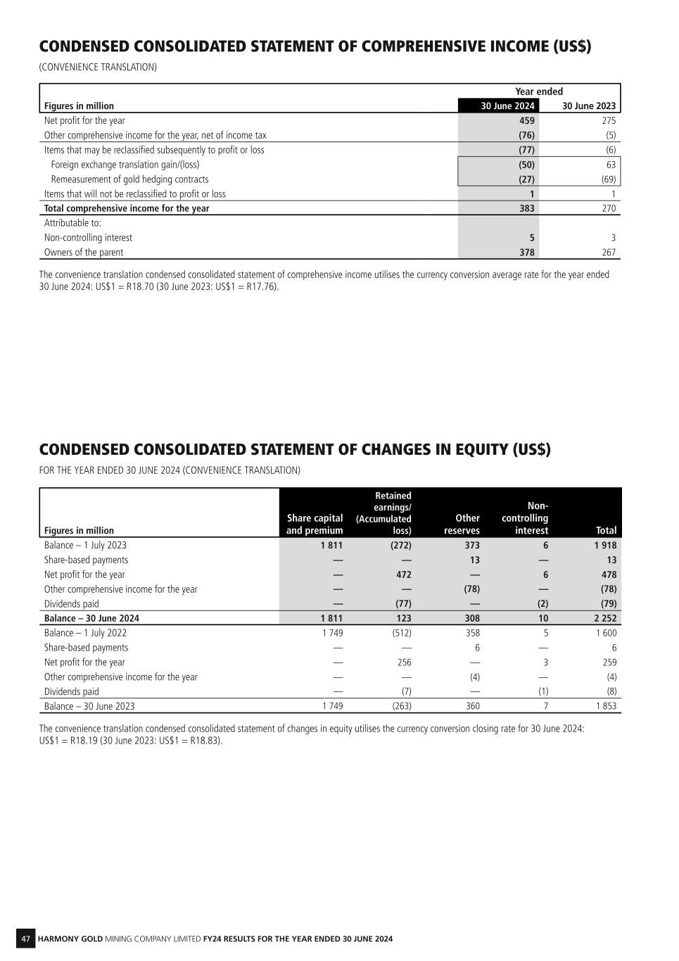 47 HARMONY GOLD MINING COMPANY LIMITED FY24 RESULTS FOR THE YEAR ENDED 30 JUNE 2024 Year ended Figures in million 30 June 2024 30 June 2023 Net profit for the year 459 275 Other comprehensive income for the year, net of income tax (76) (5) Items that may be reclassified subsequently to profit or loss (77) (6) Foreign exchange translation gain/(loss) (50) 63 Remeasurement of gold hedging contracts (27) (69) Items that will not be reclassified to profit or loss 1 1 Total comprehensive income for the year 383 270 Attributable to: Non-controlling interest 5 3 Owners of the parent 378 267 The convenience translation condensed consolidated statement of comprehensive income utilises the currency conversion average rate for the year ended 30 June 2024: US$1 = R18.70 (30 June 2023: US$1 = R17.76). Figures in million Share capital and premium Retained earnings/ (Accumulated loss) Other reserves Non- controlling interest Total Balance – 1 July 2023 1 811 (272) 373 6 1 918 Share-based payments — — 13 — 13 Net profit for the year — 472 — 6 478 Other comprehensive income for the year — — (78) — (78) Dividends paid — (77) — (2) (79) Balance – 30 June 2024 1 811 123 308 10 2 252 Balance – 1 July 2022 1 749 (512) 358 5 1 600 Share-based payments — — 6 — 6 Net profit for the year — 256 — 3 259 Other comprehensive income for the year — — (4) — (4) Dividends paid — (7) — (1) (8) Balance – 30 June 2023 1 749 (263) 360 7 1 853 The convenience translation condensed consolidated statement of changes in equity utilises the currency conversion closing rate for 30 June 2024: US$1 = R18.19 (30 June 2023: US$1 = R18.83). CONDENSED CONSOLIDATED STATEMENT OF COMPREHENSIVE INCOME (US$) (CONVENIENCE TRANSLATION) CONDENSED CONSOLIDATED STATEMENT OF CHANGES IN EQUITY (US$) FOR THE YEAR ENDED 30 JUNE 2024 (CONVENIENCE TRANSLATION)