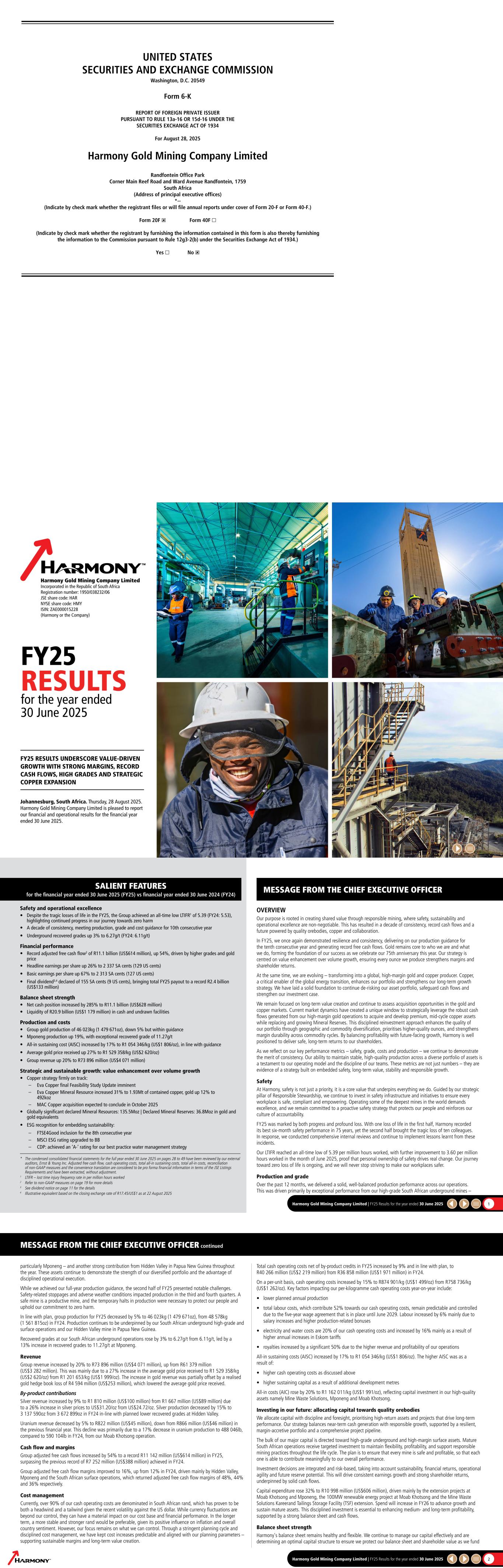 UNITED STATES SECURITIES AND EXCHANGE COMMISSION Washington, D.C. 20549 Form 6­K REPORT OF FOREIGN PRIVATE ISSUER PURSUANT TO RULE 13a­16 OR 15d­16 UNDER THE SECURITIES EXCHANGE ACT OF 1934 For August 28, 2025 Harmony Gold Mining Company Limited Randfontein Office Park Corner Main Reef Road and Ward Avenue Randfontein, 1759 South Africa (Address of principal executive offices) *-­ (Indicate by check mark whether the registrant files or will file annual reports under cover of Form 20­F or Form 40­F.) Form 20F ☒ Form 40F ☐ (Indicate by check mark whether the registrant by furnishing the information contained in this form is also thereby furnishing the information to the Commission pursuant to Rule 12g3­2(b) under the Securities Exchange Act of 1934.) Yes ☐ No ☒ FY25 RESULTS for the year ended 30 June 2025 FY25 RESULTS UNDERSCORE VALUE-DRIVEN GROWTH WITH STRONG MARGINS, RECORD CASH FLOWS, HIGH GRADES AND STRATEGIC COPPER EXPANSION Harmony Gold Mining Company Limited Incorporated in the Republic of South Africa Registration number: 1950/038232/06 JSE share code: HAR NYSE share code: HMY ISIN: ZAE000015228 (Harmony or the Company) Johannesburg, South Africa. Thursday, 28 August 2025. Harmony Gold Mining Company Limited is pleased to report our financial and operational results for the financial year ended 30 June 2025. Harmony Gold Mining Company Limited | FY25 Results for the year ended 30 June 2025 1 MESSAGE FROM THE CHIEF EXECUTIVE OFFICER OVERVIEW Our purpose is rooted in creating shared value through responsible mining, where safety, sustainability and operational excellence are non-negotiable. This has resulted in a decade of consistency, record cash flows and a future powered by quality orebodies, copper and collaboration. In FY25, we once again demonstrated resilience and consistency, delivering on our production guidance for the tenth consecutive year and generating record free cash flows. Gold remains core to who we are and what we do, forming the foundation of our success as we celebrate our 75th anniversary this year. Our strategy is centred on value enhancement over volume growth, ensuring every ounce we produce strengthens margins and shareholder returns. At the same time, we are evolving – transforming into a global, high-margin gold and copper producer. Copper, a critical enabler of the global energy transition, enhances our portfolio and strengthens our long-term growth strategy. We have laid a solid foundation to continue de-risking our asset portfolio, safeguard cash flows and strengthen our investment case. We remain focused on long-term value creation and continue to assess acquisition opportunities in the gold and copper markets. Current market dynamics have created a unique window to strategically leverage the robust cash flows generated from our high-margin gold operations to acquire and develop premium, mid-cycle copper assets while replacing and growing Mineral Reserves. This disciplined reinvestment approach enhances the quality of our portfolio through geographic and commodity diversification, prioritises higher-quality ounces, and strengthens margin durability across commodity cycles. By balancing profitability with future-facing growth, Harmony is well positioned to deliver safe, long-term returns to our shareholders. As we reflect on our key performance metrics – safety, grade, costs and production – we continue to demonstrate the merit of consistency. Our ability to maintain stable, high-quality production across a diverse portfolio of assets is a testament to our operating model and the discipline of our teams. These metrics are not just numbers – they are evidence of a strategy built on embedded safety, long-term value, stability and responsible growth. Safety At Harmony, safety is not just a priority, it is a core value that underpins everything we do. Guided by our strategic pillar of Responsible Stewardship, we continue to invest in safety infrastructure and initiatives to ensure every workplace is safe, compliant and empowering. Operating some of the deepest mines in the world demands excellence, and we remain committed to a proactive safety strategy that protects our people and reinforces our culture of accountability. FY25 was marked by both progress and profound loss. With one loss of life in the first half, Harmony recorded its best six-month safety performance in 75 years, yet the second half brought the tragic loss of ten colleagues. In response, we conducted comprehensive internal reviews and continue to implement lessons learnt from these incidents. Our LTIFR reached an all-time low of 5.39 per million hours worked, with further improvement to 3.60 per million hours worked in the month of June 2025, proof that personal ownership of safety drives real change. Our journey toward zero loss of life is ongoing, and we will never stop striving to make our workplaces safer. Production and grade Over the past 12 months, we delivered a solid, well-balanced production performance across our operations. This was driven primarily by exceptional performance from our high-grade South African underground mines – Safety and operational excellence • Despite the tragic losses of life in the FY25, the Group achieved an all-time low LTIFR1 of 5.39 (FY24: 5.53), highlighting continued progress in our journey towards zero harm • A decade of consistency, meeting production, grade and cost guidance for 10th consecutive year • Underground recovered grades up 3% to 6.27g/t (FY24: 6.11g/t) Financial performance • Record adjusted free cash flow2 of R11.1 billion (US$614 million), up 54%, driven by higher grades and gold price • Headline earnings per share up 26% to 2 337 SA cents (129 US cents) • Basic earnings per share up 67% to 2 313 SA cents (127 US cents) • Final dividend3,4 declared of 155 SA cents (9 US cents), bringing total FY25 payout to a record R2.4 billion (US$133 million) Balance sheet strength • Net cash position inc