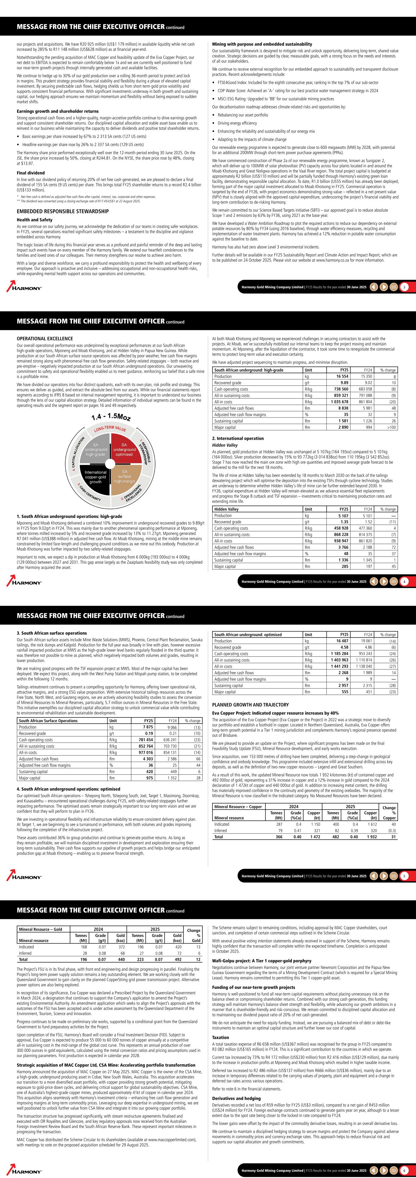 MESSAGE FROM THE CHIEF EXECUTIVE OFFICER continued Harmony Gold Mining Company Limited | FY25 Results for the year ended 30 June 2025 3 our projects and acquisitions. We have R20 925 million (US$1 179 million) in available liquidity while net cash increased by 285% to R11 148 million (US$628 million) as at financial year-end. Notwithstanding the pending acquisition of MAC Copper and feasibility update of the Eva Copper Project, our net debt to EBITDA is expected to remain comfortably below 1x and we are currently well positioned to fund our near-term growth projects through internally generated cash and available facilities. We continue to hedge up to 30% of our gold production over a rolling 36-month period to protect and lock in margins. This prudent strategy provides financial stability and flexibility during a phase of elevated capital investment. By securing predictable cash flows, hedging shields us from short-term gold price volatility and supports consistent financial performance. With significant investments underway in both growth and sustaining capital, our hedging approach ensures we maintain momentum and flexibility without being exposed to sudden market shifts. Earnings growth and shareholder returns Strong operational cash flows and a higher-quality, margin-accretive portfolio continue to drive earnings growth and support consistent shareholder returns. Our disciplined capital allocation and stable asset base enable us to reinvest in our business while maintaining the capacity to deliver dividends and positive total shareholder returns. • Basic earnings per share increased by 67% to 2 313 SA cents (127 US cents) • Headline earnings per share rose by 26% to 2 337 SA cents (129 US cents) The Harmony share price performed exceptionally well over the 12-month period ending 30 June 2025. On the JSE, the share price increased by 50%, closing at R244.81. On the NYSE, the share price rose by 48%, closing at $13.97. Final dividend In line with our dividend policy of returning 20% of net free cash generated, we are pleased to declare a final dividend of 155 SA cents (9 US cents) per share. This brings total FY25 shareholder returns to a record R2.4 billion (US$133 million). * Net free cash is defined as adjusted free cash flow after capital, interest, tax, corporate and other expenses. ** The dividend was converted using a closing exchange rate of R17.45/US$1 at 22 August 2025. EMBEDDED RESPONSIBLE STEWARDSHIP Health and Safety As we continue on our safety journey, we acknowledge the dedication of our teams in creating safer workplaces. In FY25, several operations reached significant safety milestones – a testament to the discipline and vigilance embedded across Harmony. The tragic losses of life during this financial year serves as a profound and painful reminder of the deep and lasting impact such events have on every member of the Harmony family. We extend our heartfelt condolences to the families and loved ones of our colleagues. Their memory strengthens our resolve to achieve zero harm. With a large and diverse workforce, we carry a profound responsibility to protect the health and wellbeing of every employee. Our approach is proactive and inclusive – addressing occupational and non-occupational health risks, while expanding mental health support across our operations and communities. Mining with purpose and embedded sustainability Our sustainability framework is designed to mitigate risk and unlock opportunity, delivering long-term, shared value creation. Strategic decisions are guided by clear, measurable goals, with a strong focus on the needs and interests of all our stakeholders. We continue to receive external recognition for our embedded approach to sustainability and transparent disclosure practices. Recent acknowledgements include: • FTSE4Good Index: Included for the eighth consecutive year, ranking in the top 7% of our sub-sector • CDP Water Score: Achieved an ‘A-’ rating for our best practice water management strategy in 2024 • MSCI ESG Rating: Upgraded to ‘BB’ for our sustainable mining practices Our decarbonisation roadmap addresses climate-related risks and opportunities by: • Rebalancing our asset portfolio • Driving energy efficiency • Enhancing the reliability and sustainability of our energy mix • Adapting to the impacts of climate change Our renewable energy programme is expected to generate close to 600 megawatts (MW) by 2028, with potential for an additional 200MW through short-term power purchase agreements (PPAs). We have commenced construction of Phase 2a of our renewable energy programme, known as Sungazer 2, which will deliver up to 100MW of solar photovoltaic (PV) capacity across four plants located in and around the Moab Khotsong and Great Noligwa operations in the Vaal River region. The total project capital is budgeted at approximately R2 billion (US$110 million) and will be partially funded through Harmony’s existing green loan facility, demonstrating responsible capital allocation. To date, R1.0 billion (US55 million) has already been deployed, forming part of the major capital investment allocated to Moab Khotsong in FY25. Commercial operation is targeted by the end of FY26, with project economics demonstrating strong value – reflected in a net present value (NPV) that is closely aligned with the approved capital expenditure, underscoring the project's financial viability and long-term contribution to de-risking Harmony. We remain committed to our Science Based Targets initiative (SBTi) – our approved goal is to reduce absolute Scope 1 and 2 emissions by 63% by FY36, using 2021 as the base year. We have developed a Water Ambition Roadmap to plot the required actions to reduce our dependency on external potable resources by 80% by FY34 (using 2016 baseline), through water efficiency measures, recycling and implementation of water treatment plants. Harmony has achieved a 12% reduction in potable water consumptio
