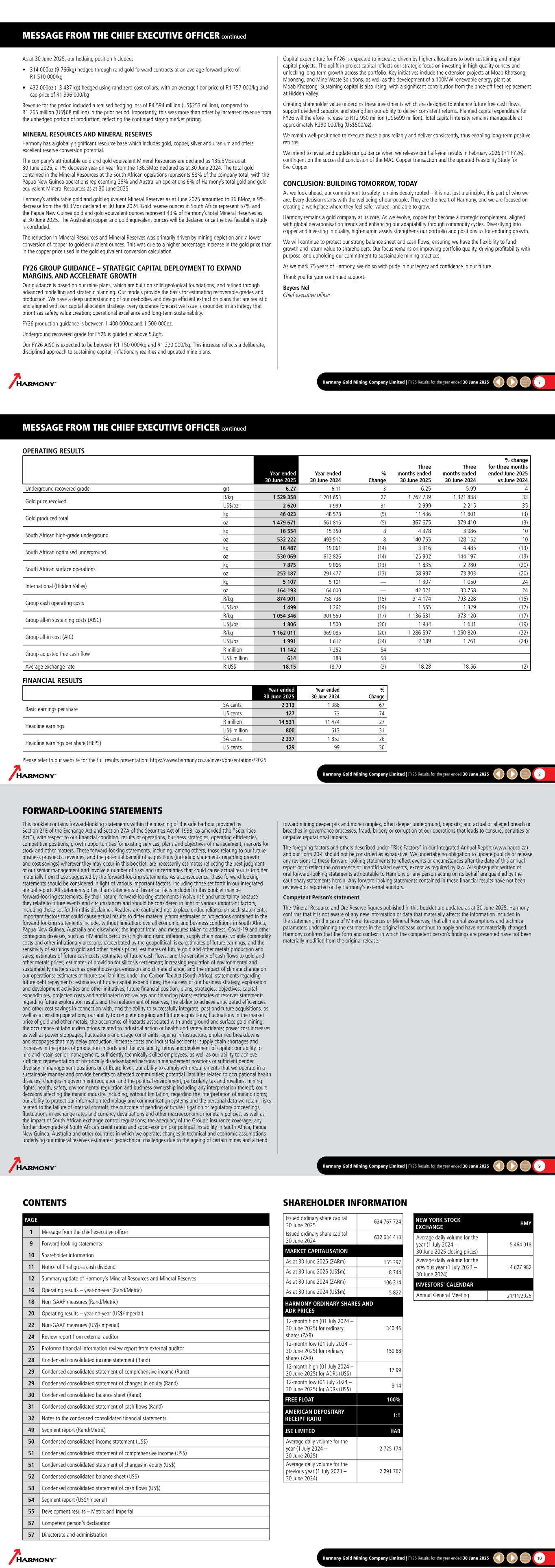 MESSAGE FROM THE CHIEF EXECUTIVE OFFICER continued Harmony Gold Mining Company Limited | FY25 Results for the year ended 30 June 2025 7 As at 30 June 2025, our hedging position included: • 314 000oz (9 766kg) hedged through rand gold forward contracts at an average forward price of R1 510 000/kg • 432 000oz (13 437 kg) hedged using rand zero-cost collars, with an average floor price of R1 757 000/kg and cap price of R1 996 000/kg Revenue for the period included a realised hedging loss of R4 594 million (US$253 million), compared to R1 265 million (US$68 million) in the prior period. Importantly, this was more than offset by increased revenue from the unhedged portion of production, reflecting the continued strong market pricing. MINERAL RESOURCES AND MINERAL RESERVES Harmony has a globally significant resource base which includes gold, copper, silver and uranium and offers excellent reserve conversion potential. The company’s attributable gold and gold equivalent Mineral Resources are declared as 135.5Moz as at 30 June 2025, a 1% decrease year-on-year from the 136.5Moz declared as at 30 June 2024. The total gold contained in the Mineral Resources at the South African operations represents 68% of the company total, with the Papua New Guinea operations representing 26% and Australian operations 6% of Harmony’s total gold and gold equivalent Mineral Resources as at 30 June 2025. Harmony’s attributable gold and gold equivalent Mineral Reserves as at June 2025 amounted to 36.8Moz, a 9% decrease from the 40.3Moz declared at 30 June 2024. Gold reserve ounces in South Africa represent 57% and the Papua New Guinea gold and gold equivalent ounces represent 43% of Harmony’s total Mineral Reserves as at 30 June 2025. The Australian copper and gold equivalent ounces will be declared once the Eva feasibility study is concluded. The reduction in Mineral Resources and Mineral Reserves was primarily driven by mining depletion and a lower conversion of copper to gold equivalent ounces. This was due to a higher percentage increase in the gold price than in the copper price used in the gold equivalent conversion calculation. FY26 GROUP GUIDANCE – STRATEGIC CAPITAL DEPLOYMENT TO EXPAND MARGINS, AND ACCELERATE GROWTH Our guidance is based on our mine plans, which are built on solid geological foundations, and refined through advanced modelling and strategic planning. Our models provide the basis for estimating recoverable grades and production. We have a deep understanding of our orebodies and design efficient extraction plans that are realistic and aligned with our capital allocation strategy. Every guidance forecast we issue is grounded in a strategy that prioritises safety, value creation, operational excellence and long-term sustainability. FY26 production guidance is between 1 400 000oz and 1 500 000oz. Underground recovered grade for FY26 is guided at above 5.8g/t. Our FY26 AISC is expected to be between R1 150 000/kg and R1 220 000/kg. This increase reflects a deliberate, disciplined approach to sustaining capital, inflationary realities and updated mine plans. Capital expenditure for FY26 is expected to increase, driven by higher allocations to both sustaining and major capital projects. The uplift in project capital reflects our strategic focus on investing in high-quality ounces and unlocking long-term growth across the portfolio. Key initiatives include the extension projects at Moab Khotsong, Mponeng, and Mine Waste Solutions, as well as the development of a 100MW renewable energy plant at Moab Khotsong. Sustaining capital is also rising, with a significant contribution from the once-off fleet replacement at Hidden Valley. Creating shareholder value underpins these investments which are designed to enhance future free cash flows, support dividend capacity, and strengthen our ability to deliver consistent returns. Planned capital expenditure for FY26 will therefore increase to R12 950 million (US$699 million). Total capital intensity remains manageable at approximately R290 000/kg (US$500/oz). We remain well-positioned to execute these plans reliably and deliver consistently, thus enabling long-term positive returns. We intend to revisit and update our guidance when we release our half-year results in February 2026 (H1 FY26), contingent on the successful conclusion of the MAC Copper transaction and the updated Feasibility Study for Eva Copper. CONCLUSION: BUILDING TOMORROW, TODAY As we look ahead, our commitment to safety remains deeply rooted – it is not just a principle, it is part of who we are. Every decision starts with the wellbeing of our people. They are the heart of Harmony, and we are focused on creating a workplace where they feel safe, valued, and able to grow. Harmony remains a gold company at its core. As we evolve, copper has become a strategic complement, aligned with global decarbonisation trends and enhancing our adaptability through commodity cycles. Diversifying into copper and investing in quality, high-margin assets strengthens our portfolio and positions us for enduring growth. We will continue to protect our strong balance sheet and cash flows, ensuring we have the flexibility to fund growth and return value to shareholders. Our focus remains on improving portfolio quality, driving profitability with purpose, and upholding our commitment to sustainable mining practices. As we mark 75 years of Harmony, we do so with pride in our legacy and confidence in our future. Thank you for your continued support. Beyers Nel Chief executive officer MESSAGE FROM THE CHIEF EXECUTIVE OFFICER continued Harmony Gold Mining Company Limited | FY25 Results for the year ended 30 June 2025 8 OPERATING RESULTS Year ended 30 June 2025 Year ended 30 June 2024 % Change Three months ended 30 June 2025 Three months ended 30 June 2024 % change for three months ended June 2025 vs June 2024 Underground recovered grade g/t 6.27 6.11 3 6.25 5.99 4 Gold price received R/kg 1 529 358 1 201 653