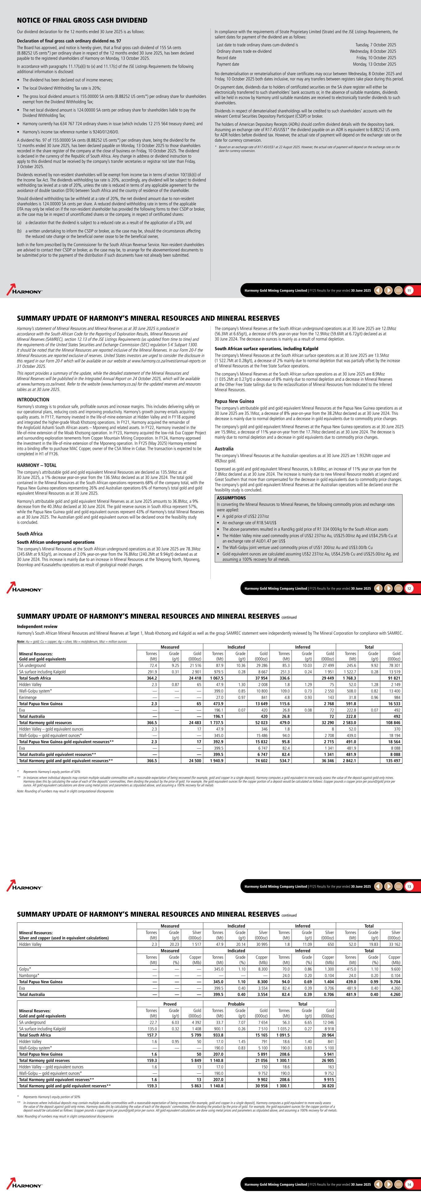 Harmony Gold Mining Company Limited | FY25 Results for the year ended 30 June 2025 11 NOTICE OF FINAL GROSS CASH DIVIDEND Our dividend declaration for the 12 months ended 30 June 2025 is as follows: Declaration of final gross cash ordinary dividend no. 97 The Board has approved, and notice is hereby given, that a final gross cash dividend of 155 SA cents (8.88252 US cents*) per ordinary share in respect of the 12 months ended 30 June 2025, has been declared payable to the registered shareholders of Harmony on Monday, 13 October 2025. In accordance with paragraphs 11.17(a)(i) to (x) and 11.17(c) of the JSE Listings Requirements the following additional information is disclosed: • The dividend has been declared out of income reserves; • The local Dividend Withholding Tax rate is 20%; • The gross local dividend amount is 155.00000 SA cents (8.88252 US cents*) per ordinary share for shareholders exempt from the Dividend Withholding Tax; • The net local dividend amount is 124.00000 SA cents per ordinary share for shareholders liable to pay the Dividend Withholding Tax; • Harmony currently has 634 767 724 ordinary shares in issue (which includes 12 215 564 treasury shares); and • Harmony’s income tax reference number is 9240/012/60/0. A dividend No. 97 of 155.00000 SA cents (8.88252 US cents*) per ordinary share, being the dividend for the 12 months ended 30 June 2025, has been declared payable on Monday, 13 October 2025 to those shareholders recorded in the share register of the company at the close of business on Friday, 10 October 2025. The dividend is declared in the currency of the Republic of South Africa. Any change in address or dividend instruction to apply to this dividend must be received by the company’s transfer secretaries or registrar not later than Friday, 3 October 2025. Dividends received by non-resident shareholders will be exempt from income tax in terms of section 10(1)(k)(i) of the Income Tax Act. The dividends withholding tax rate is 20%, accordingly, any dividend will be subject to dividend withholding tax levied at a rate of 20%, unless the rate is reduced in terms of any applicable agreement for the avoidance of double taxation (DTA) between South Africa and the country of residence of the shareholder. Should dividend withholding tax be withheld at a rate of 20%, the net dividend amount due to non-resident shareholders is 124.00000 SA cents per share. A reduced dividend withholding rate in terms of the applicable DTA may only be relied on if the non-resident shareholder has provided the following forms to their CSDP or broker, as the case may be in respect of uncertificated shares or the company, in respect of certificated shares: (a) a declaration that the dividend is subject to a reduced rate as a result of the application of a DTA; and (b) a written undertaking to inform the CSDP or broker, as the case may be, should the circumstances affecting the reduced rate change or the beneficial owner cease to be the beneficial owner, both in the form prescribed by the Commissioner for the South African Revenue Service. Non-resident shareholders are advised to contact their CSDP or broker, as the case may be, to arrange for the abovementioned documents to be submitted prior to the payment of the distribution if such documents have not already been submitted. In compliance with the requirements of Strate Proprietary Limited (Strate) and the JSE Listings Requirements, the salient dates for payment of the dividend are as follows: Last date to trade ordinary shares cum-dividend is Tuesday, 7 October 2025 Ordinary shares trade ex-dividend Wednesday, 8 October 2025 Record date Friday, 10 October 2025 Payment date Monday, 13 October 2025 No dematerialisation or rematerialisation of share certificates may occur between Wednesday, 8 October 2025 and Friday, 10 October 2025 both dates inclusive, nor may any transfers between registers take place during this period. On payment date, dividends due to holders of certificated securities on the SA share register will either be electronically transferred to such shareholders' bank accounts or, in the absence of suitable mandates, dividends will be held in escrow by Harmony until suitable mandates are received to electronically transfer dividends to such shareholders. Dividends in respect of dematerialised shareholdings will be credited to such shareholders' accounts with the relevant Central Securities Depository Participant (CSDP) or broker. The holders of American Depositary Receipts (ADRs) should confirm dividend details with the depository bank. Assuming an exchange rate of R17.45/US$1* the dividend payable on an ADR is equivalent to 8.88252 US cents for ADR holders before dividend tax. However, the actual rate of payment will depend on the exchange rate on the date for currency conversion. * Based on an exchange rate of R17.45/US$1 at 22 August 2025. However, the actual rate of payment will depend on the exchange rate on the date for currency conversion. Harmony Gold Mining Company Limited | FY25 Results for the year ended 30 June 2025 12 Harmony’s statement of Mineral Resources and Mineral Reserves as at 30 June 2025 is produced in accordance with the South African Code for the Reporting of Exploration Results, Mineral Resources and Mineral Reserves (SAMREC), section 12.13 of the JSE Listings Requirements (as updated from time to time) and the requirements of the United States Securities and Exchange Commission (SEC) regulation S-K Subpart 1300. It should be noted that the Mineral Resources are reported inclusive of the Mineral Reserves. In our Form 20-F the Mineral Resources are reported exclusive of reserves. United States investors are urged to consider the disclosure in this regard in our Form 20-F which will be available on our website at www.harmony.co.za/invest/annual-reports on 31 October 2025. This report provides a summary of the update, while the detailed statement of the Mineral Resources and Mineral Rese
