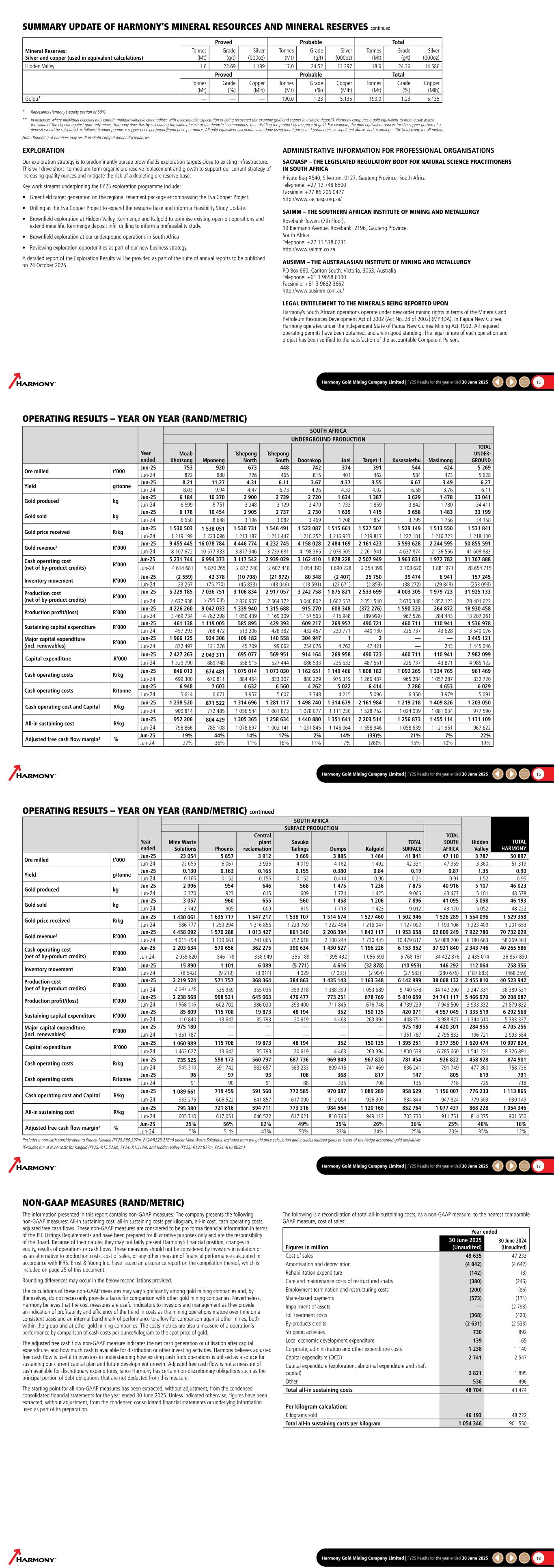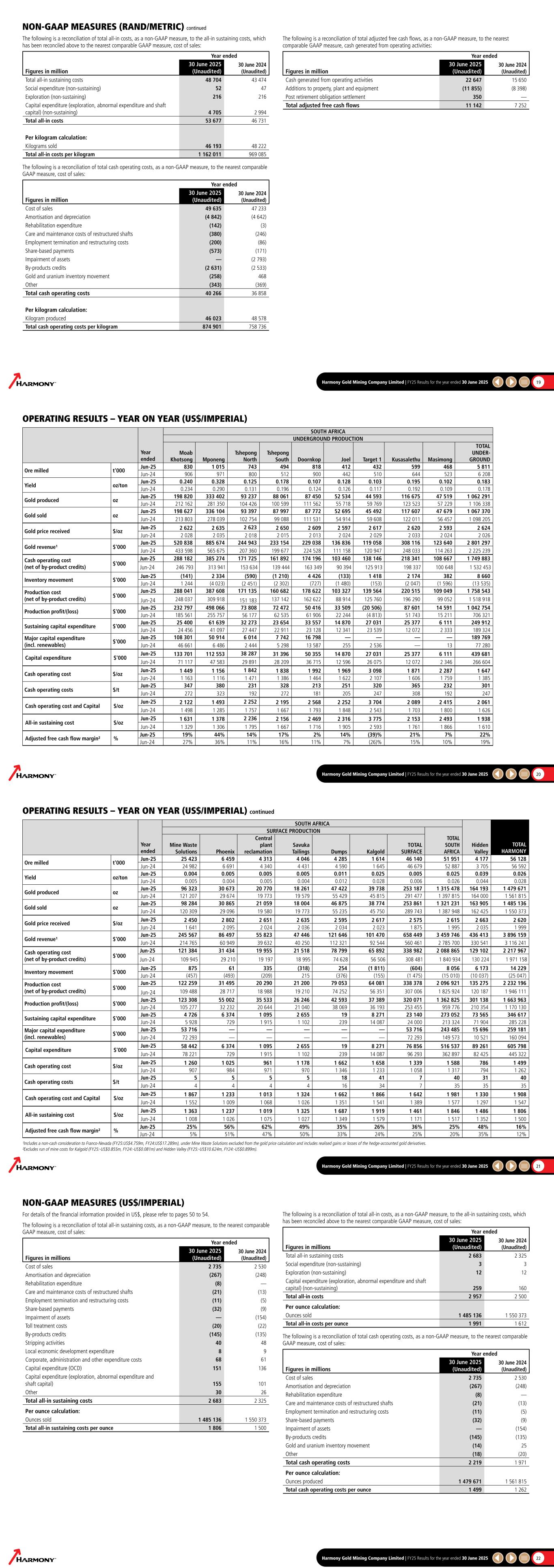 Harmony Gold Mining Company Limited | FY25 Results for the year ended 30 June 2025 19 NON-GAAP MEASURES (RAND/METRIC) continued The following is a reconciliation of total all-in costs, as a non-GAAP measure, to the all-in sustaining costs, which has been reconciled above to the nearest comparable GAAP measure, cost of sales: Year ended Figures in million 30 June 2025 (Unaudited) 30 June 2024 (Unaudited) Total all-in sustaining costs 48 704 43 474 Social expenditure (non-sustaining) 52 47 Exploration (non-sustaining) 216 216 Capital expenditure (exploration, abnormal expenditure and shaft capital) (non-sustaining) 4 705 2 994 Total all-in costs 53 677 46 731 Per kilogram calculation: Kilograms sold 46 193 48 222 Total all-in costs per kilogram 1 162 011 969 085 The following is a reconciliation of total cash operating costs, as a non-GAAP measure, to the nearest comparable GAAP measure, cost of sales: Year ended Figures in million 30 June 2025 (Unaudited) 30 June 2024 (Unaudited) Cost of sales 49 635 47 233 Amortisation and depreciation (4 842) (4 642) Rehabilitation expenditure (142) (3) Care and maintenance costs of restructured shafts (380) (246) Employment termination and restructuring costs (200) (86) Share-based payments (573) (171) Impairment of assets — (2 793) By-products credits (2 631) (2 533) Gold and uranium inventory movement (258) 468 Other (343) (369) Total cash operating costs 40 266 36 858 Per kilogram calculation: Kilogram produced 46 023 48 578 Total cash operating costs per kilogram 874 901 758 736 The following is a reconciliation of total adjusted free cash flows, as a non-GAAP measure, to the nearest comparable GAAP measure, cash generated from operating activities: Year ended Figures in million 30 June 2025 (Unaudited) 30 June 2024 (Unaudited) Cash generated from operating activities 22 647 15 650 Additions to property, plant and equipment (11 855) (8 398) Post retirement obligation settlement 350 — Total adjusted free cash flows 11 142 7 252 Harmony Gold Mining Company Limited | FY25 Results for the year ended 30 June 2025 20 Year ended SOUTH AFRICA UNDERGROUND PRODUCTION Moab Khotsong Mponeng Tshepong North Tshepong South Doornkop Joel Target 1 Kusasalethu Masimong TOTAL UNDER- GROUND Ore milled t'000 Jun-25 830 1 015 743 494 818 412 432 599 468 5 811 Jun-24 906 971 800 512 900 442 510 644 523 6 208 Yield oz/ton Jun-25 0.240 0.328 0.125 0.178 0.107 0.128 0.103 0.195 0.102 0.183 Jun-24 0.234 0.290 0.131 0.196 0.124 0.126 0.117 0.192 0.109 0.178 Gold produced oz Jun-25 198 820 333 402 93 237 88 061 87 450 52 534 44 593 116 675 47 519 1 062 291 Jun-24 212 162 281 350 104 426 100 599 111 562 55 718 59 769 123 523 57 229 1 106 338 Gold sold oz Jun-25 198 627 336 104 93 397 87 997 87 772 52 695 45 492 117 607 47 679 1 067 370 Jun-24 213 803 278 039 102 754 99 088 111 531 54 914 59 608 122 011 56 457 1 098 205 Gold price received $/oz Jun-25 2 622 2 635 2 623 2 650 2 609 2 597 2 617 2 620 2 593 2 624 Jun-24 2 028 2 035 2 018 2 015 2 013 2 024 2 029 2 033 2 024 2 026 Gold revenue¹ $'000 Jun-25 520 838 885 674 244 943 233 154 229 038 136 836 119 058 308 116 123 640 2 801 297 Jun-24 433 598 565 675 207 360 199 677 224 528 111 158 120 947 248 033 114 263 2 225 239 Cash operating cost (net of by-product credits) $'000 Jun-25 288 182 385 274 171 725 161 892 174 196 103 460 138 146 218 341 108 667 1 749 883 Jun-24 246 793 313 941 153 634 139 444 163 349 90 394 125 913 198 337 100 648 1 532 453 Inventory movement $'000 Jun-25 (141) 2 334 (590) (1 210) 4 426 (133) 1 418 2 174 382 8 660 Jun-24 1 244 (4 023) (2 451) (2 302) (727) (1 480) (153) (2 047) (1 596) (13 535) Production cost (net of by-product credits) $'000 Jun-25 288 041 387 608 171 135 160 682 178 622 103 327 139 564 220 515 109 049 1 758 543 Jun-24 248 037 309 918 151 183 137 142 162 622 88 914 125 760 196 290 99 052 1 518 918 Production profit/(loss) $'000 Jun-25 232 797 498 066 73 808 72 472 50 416 33 509 (20 506) 87 601 14 591 1 042 754 Jun-24 185 561 255 757 56 177 62 535 61 906 22 244 (4 813) 51 743 15 211 706 321 Sustaining capital expenditure $'000 Jun-25 25 400 61 639 32 273 23 654 33 557 14 870 27 031 25 377 6 111 249 912 Jun-24 24 456 41 097 27 447 22 911 23 128 12 341 23 539 12 072 2 333 189 324 Major capital expenditure (incl. renewables) $'000 Jun-25 108 301 50 914 6 014 7 742 16 798 — — — — 189 769 Jun-24 46 661 6 486 2 444 5 298 13 587 255 2 536 — 13 77 280 Capital expenditure $'000 Jun-25 133 701 112 553 38 287 31 396 50 355 14 870 27 031 25 377 6 111 439 681 Jun-24 71 117 47 583 29 891 28 209 36 715 12 596 26 075 12 072 2 346 266 604 Cash operating cost $/oz Jun-25 1 449 1 156 1 842 1 838 1 992 1 969 3 098 1 871 2 287 1 647 Jun-24 1 163 1 116 1 471 1 386 1 464 1 622 2 107 1 606 1 759 1 385 Cash operating costs $/t Jun-25 347 380 231 328 213 251 320 365 232 301 Jun-24 272 323 192 272 181 205 247 308 192 247 Cash operating cost and Capital $/oz Jun-25 2 122 1 493 2 252 2 195 2 568 2 252 3 704 2 089 2 415 2 061 Jun-24 1 498 1 285 1 757 1 667 1 793 1 848 2 543 1 703 1 800 1 626 All-in sustaining cost $/oz Jun-25 1 631 1 378 2 236 2 156 2 469 2 316 3 775 2 153 2 493 1 938 Jun-24 1 329 1 306 1 795 1 667 1 716 1 905 2 593 1 761 1 866 1 610 Adjusted free cash flow margin² % Jun-25 19% 44% 14% 17% 2% 14% (39)% 21% 7% 22% Jun-24 27% 36% 11% 16% 11% 7% (26)% 15% 10% 19% OPERATING RESULTS – YEAR ON YEAR (US$/IMPERIAL) Harmony Gold Mining Company Limited | FY25 Results for the year ended 30 June 2025 21 OPERATING RESULTS – YEAR ON YEAR (US$/IMPERIAL) continued Year ended SOUTH AFRICA Hidden Valley TOTAL HARMONY SURFACE PRODUCTION TOTAL SOUTH AFRICA Mine Waste Solutions Phoenix Central plant reclamation Savuka Tailings Dumps Kalgold TOTAL SURFACE Ore milled t'000 Jun-25 25 423 6 459 4 313 4 046 4 285 1 614 46 140 51 951 4 177 56 128 Jun-24 24 982 6 691 4 340 4 431 4 590 1 645 46 679 52 887 3 705 56 592 Yield oz/ton Jun-25 0.004 0.005 0.005 0.005 0.011 0.025 0.005 0.025 0.039 0.026 Jun-24 0.005 