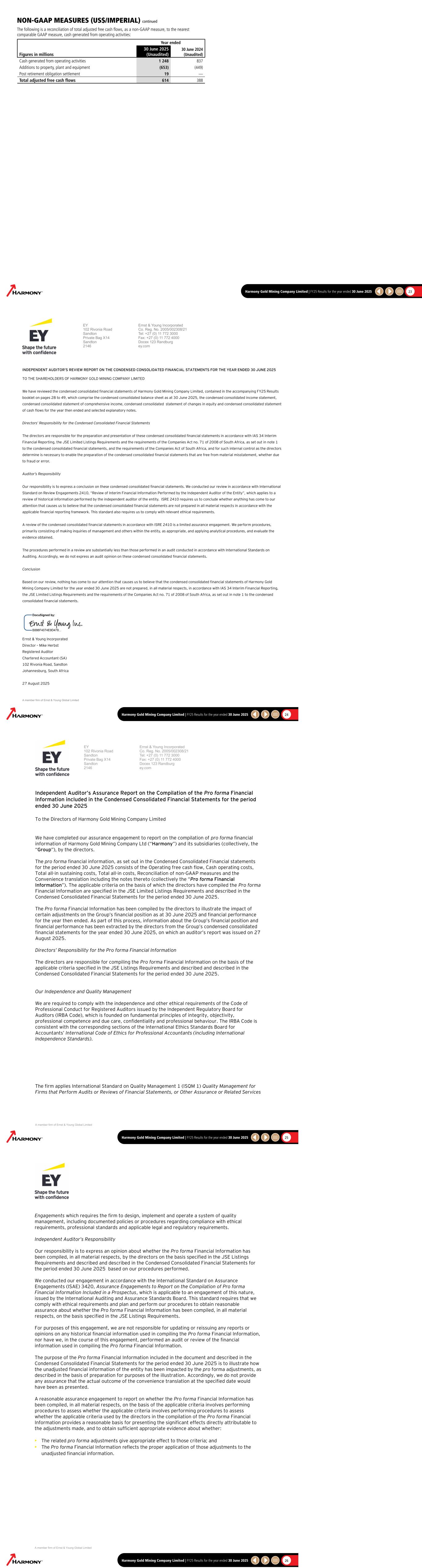 Harmony Gold Mining Company Limited | FY25 Results for the year ended 30 June 2025 23 NON-GAAP MEASURES (US$/IMPERIAL) continued The following is a reconciliation of total adjusted free cash flows, as a non-GAAP measure, to the nearest comparable GAAP measure, cash generated from operating activities: Year ended Figures in millions 30 June 2025 (Unaudited) 30 June 2024 (Unaudited) Cash generated from operating activities 1 248 837 Additions to property, plant and equipment (653) (449) Post retirement obligation settlement 19 — Total adjusted free cash flows 614 388 Harmony Gold Mining Company Limited | FY25 Results for the year ended 30 June 2025 24 A member firm of Ernst & Young Global Limited EY 102 Rivonia Road Sandton Private Bag X14 Sandton 2146 Ernst & Young Incorporated Co. Reg. No. 2005/002308/21 Tel: +27 (0) 11 772 3000 Fax: +27 (0) 11 772 4000 Docex 123 Randburg ey.com Harmony Gold Mining Company Limited | FY25 Results for the year ended 30 June 2025 25 A member firm of Ernst & Young Global Limited EY 102 Rivonia Road Sandton Private Bag X14 Sandton 2146 Ernst & Young Incorporated Co. Reg. No. 2005/002308/21 Tel: +27 (0) 11 772 3000 Fax: +27 (0) 11 772 4000 Docex 123 Randburg ey.com Independent Auditor’s Assurance Report on the Compilation of the Pro forma Financial Information included in the Condensed Consolidated Financial Statements for the period ended 30 June 2025 To the Directors of Harmony Gold Mining Company Limited We have completed our assurance engagement to report on the compilation of pro forma financial information of Harmony Gold Mining Company Ltd (“Harmony”) and its subsidiaries (collectively, the “Group”), by the directors. The pro forma financial information, as set out in the Condensed Consolidated Financial statements for the period ended 30 June 2025 consists of the Operating free cash flow, Cash operating costs, Total all-in sustaining costs, Total all-in costs, Reconciliation of non-GAAP measures and the Convenience translation including the notes thereto (collectively the “Pro forma Financial Information”). The applicable criteria on the basis of which the directors have compiled the Pro forma Financial Information are specified in the JSE Limited Listings Requirements and described in the Condensed Consolidated Financial Statements for the period ended 30 June 2025. The Pro forma Financial Information has been compiled by the directors to illustrate the impact of certain adjustments on the Group’s financial position as at 30 June 2025 and financial performance for the year then ended. As part of this process, information about the Group’s financial position and financial performance has been extracted by the directors from the Group’s condensed consolidated financial statements for the year ended 30 June 2025, on which an auditor’s report was issued on 27 August 2025. Directors’ Responsibility for the Pro forma Financial Information The directors are responsible for compiling the Pro forma Financial Information on the basis of the applicable criteria specified in the JSE Listings Requirements and described and described in the Condensed Consolidated Financial Statements for the period ended 30 June 2025. Our Independence and Quality Management We are required to comply with the independence and other ethical requirements of the Code of Professional Conduct for Registered Auditors issued by the Independent Regulatory Board for Auditors (IRBA Code), which is founded on fundamental principles of integrity, objectivity, professional competence and due care, confidentiality and professional behaviour. The IRBA Code is consistent with the corresponding sections of the International Ethics Standards Board for Accountants’ International Code of Ethics for Professional Accountants (including International Independence Standards). The firm applies International Standard on Quality Management 1 (ISQM 1) Quality Management for Firms that Perform Audits or Reviews of Financial Statements, or Other Assurance or Related Services Harmony Gold Mining Company Limited | FY25 Results for the year ended 30 June 2025 26 A member firm of Ernst & Young Global Limited Engagements which requires the firm to design, implement and operate a system of quality management, including documented policies or procedures regarding compliance with ethical requirements, professional standards and applicable legal and regulatory requirements. Independent Auditor’s Responsibility Our responsibility is to express an opinion about whether the Pro forma Financial Information has been compiled, in all material respects, by the directors on the basis specified in the JSE Listings Requirements and described and described in the Condensed Consolidated Financial Statements for the period ended 30 June 2025 based on our procedures performed. We conducted our engagement in accordance with the International Standard on Assurance Engagements (ISAE) 3420, Assurance Engagements to Report on the Compilation of Pro forma Financial Information Included in a Prospectus, which is applicable to an engagement of this nature, issued by the International Auditing and Assurance Standards Board. This standard requires that we comply with ethical requirements and plan and perform our procedures to obtain reasonable assurance about whether the Pro forma Financial Information has been compiled, in all material respects, on the basis specified in the JSE Listings Requirements. For purposes of this engagement, we are not responsible for updating or reissuing any reports or opinions on any historical financial information used in compiling the Pro forma Financial Information, nor have we, in the course of this engagement, performed an audit or review of the financial information used in compiling the Pro forma Financial Information. The purpose of the Pro forma Financial Information included in the document and described in the Condensed Consolidated Financial Statements for the period ended