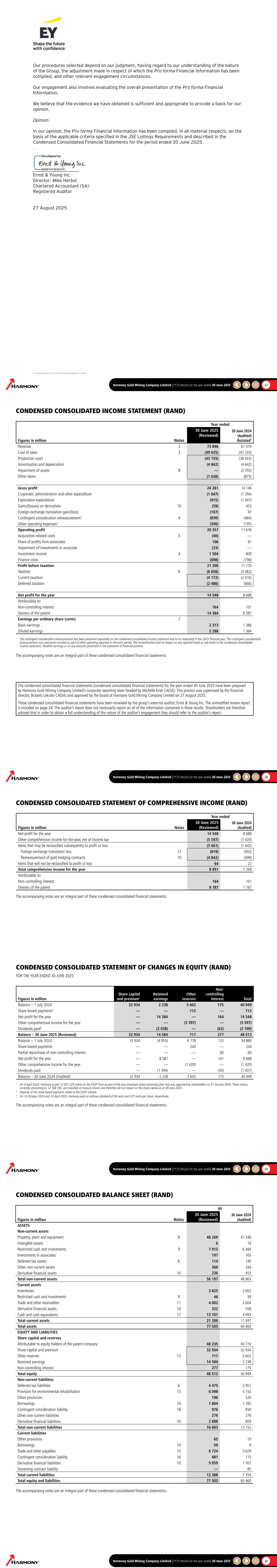 Harmony Gold Mining Company Limited | FY25 Results for the year ended 30 June 2025 27 A member firm of Ernst & Young Global Limited Our procedures selected depend on our judgment, having regard to our understanding of the nature of the Group, the adjustment made in respect of which the Pro forma Financial Information has been compiled, and other relevant engagement circumstances. Our engagement also involves evaluating the overall presentation of the Pro forma Financial Information. We believe that the evidence we have obtained is sufficient and appropriate to provide a basis for our opinion. Opinion In our opinion, the Pro forma Financial Information has been compiled, in all material respects, on the basis of the applicable criteria specified in the JSE Listings Requirements and described in the Condensed Consolidated Financial Statements for the period ended 30 June 2025. . ____________________ Ernst & Young Inc. Director: Mike Herbst Chartered Accountant (SA) Registered Auditor 27 August 2025 Harmony Gold Mining Company Limited | FY25 Results for the year ended 30 June 2025 28 CONDENSED CONSOLIDATED INCOME STATEMENT (RAND) Year ended Figures in million Notes 30 June 2025 (Reviewed) 30 June 2024 (Audited) Restated1 Revenue 2 73 896 61 379 Cost of sales 3 (49 635) (47 233) Production costs (43 155) (38 923) Amortisation and depreciation (4 842) (4 642) Impairment of assets 8 — (2 793) Other items (1 638) (875) Gross profit 24 261 14 146 Corporate, administration and other expenditure (1 647) (1 294) Exploration expenditure (915) (1 047) Gains/(losses) on derivatives 10 (59) 453 Foreign exchange translation gain/(loss) (107) 97 Contingent consideration remeasurement1 4 (830) (484) Other operating expenses1 (346) (195) Operating profit 20 357 11 676 Acquisition-related costs 5 (40) — Share of profits from associates 106 81 Impairment of investments in associate (23) — Investment income 4 1 504 809 Finance costs (698) (796) Profit before taxation 21 206 11 770 Taxation 6 (6 658) (3 082) Current taxation (4 172) (2 416) Deferred taxation (2 486) (666) Net profit for the year 14 548 8 688 Attributable to: Non-controlling interest 164 101 Owners of the parent 14 384 8 587 Earnings per ordinary share (cents) 7 Basic earnings 2 313 1 386 Diluted earnings 2 288 1 364 1 The contingent consideration remeasurement has been presented separately on the condensed consolidated income statement due to its materiality in the 2025 financial year. The contingent consideration remeasurement was previously included as part of other operating expenses in the prior period. The reclassification had no impact on any reported totals or sub-totals in the condensed consolidated income statement, headline earnings or on any amounts presented in the statement of financial position. The accompanying notes are an integral part of these condensed consolidated financial statements. The condensed consolidated financial statements (condensed consolidated financial statements) for the year ended 30 June 2025 have been prepared by Harmony Gold Mining Company Limited’s corporate reporting team headed by Michelle Kriel CA(SA). This process was supervised by the financial director, Boipelo Lekubo CA(SA) and approved by the board of Harmony Gold Mining Company Limited on 27 August 2025. These condensed consolidated financial statements have been reviewed by the group's external auditor, Ernst & Young Inc. The unmodified review report is included on page 24. The auditor’s report does not necessarily report on all of the information contained in these results. Shareholders are therefore advised that in order to obtain a full understanding of the nature of the auditor’s engagement they should refer to the auditor’s report. Harmony Gold Mining Company Limited | FY25 Results for the year ended 30 June 2025 29 Year ended Figures in million Notes 30 June 2025 (Reviewed) 30 June 2024 (Audited) Net profit for the year 14 548 8 688 Other comprehensive income for the year, net of income tax (5 597) (1 420) Items that may be reclassified subsequently to profit or loss (5 661) (1 442) Foreign exchange translation loss 12 (819) (943) Remeasurement of gold hedging contracts 10 (4 842) (499) Items that will not be reclassified to profit or loss 64 22 Total comprehensive income for the year 8 951 7 268 Attributable to: Non-controlling interest 164 101 Owners of the parent 8 787 7 167 The accompanying notes are an integral part of these condensed consolidated financial statements. Figures in million Share capital and premium1 Retained earnings Other reserves Non- controlling interest Total Balance – 1 July 2024 32 934 2 238 5 602 175 40 949 Share-based payments2 — — 712 — 712 Net profit for the year — 14 384 — 164 14 548 Other comprehensive income for the year — — (5 597) — (5 597) Dividends paid3 — (2 038) — (62) (2 100) Balance – 30 June 2025 (Reviewed) 32 934 14 584 717 277 48 512 Balance – 1 July 2023 32 934 (4 955) 6 778 123 34 880 Share-based payments — — 244 — 244 Partial repurchase of non-controlling interest — — — (6) (6) Net profit for the year — 8 587 — 101 8 688 Other comprehensive income for the year — — (1 420) — (1 420) Dividends paid — (1 394) — (43) (1 437) Balance – 30 June 2024 (Audited) 32 934 2 238 5 602 175 40 949 1 On 4 April 2024, Harmony issued 12 651 525 shares to the ESOP Trust as part of the new employee share ownership plan that was approved by shareholders on 31 January 2024. These shares, currently amounting to 12 168 183, are classified as treasury shares and therefore do not impact on the share capital as at 30 June 2025. 2 Majority of the share-based payments relate to the ESOP scheme. 3 On 14 October 2024 and 14 April 2025, Harmony paid an ordinary dividend of 94 cents and 227 cents per share, respectively. The accompanying notes are an integral part of these condensed consolidated financial statements. CONDENSED CONSOLIDATED STATEMENT OF COMPR