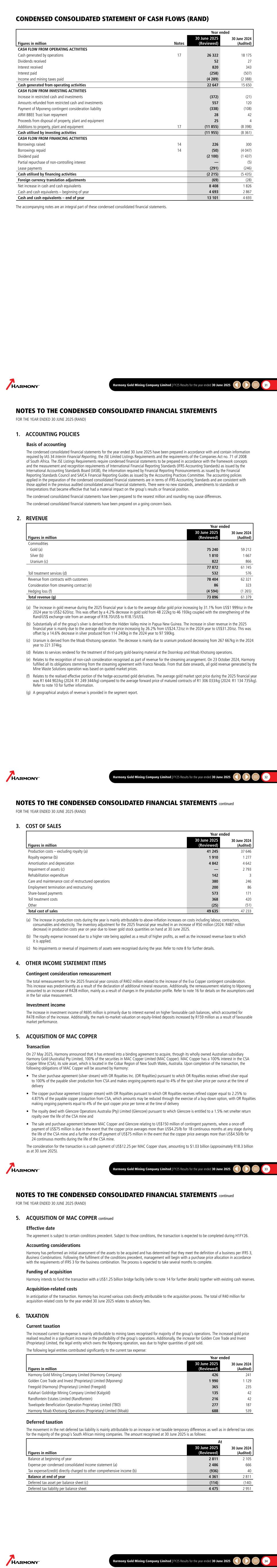 Harmony Gold Mining Company Limited | FY25 Results for the year ended 30 June 2025 31 CONDENSED CONSOLIDATED STATEMENT OF CASH FLOWS (RAND) Year ended Figures in million Notes 30 June 2025 (Reviewed) 30 June 2024 (Audited) CASH FLOW FROM OPERATING ACTIVITIES Cash generated by operations 17 26 322 18 175 Dividends received 52 27 Interest received 820 343 Interest paid (258) (507) Income and mining taxes paid (4 289) (2 388) Cash generated from operating activities 22 647 15 650 CASH FLOW FROM INVESTING ACTIVITIES Increase in restricted cash and investments (372) (21) Amounts refunded from restricted cash and investments 557 120 Payment of Mponeng contingent consideration liability (338) (108) ARM BBEE Trust loan repayment 28 42 Proceeds from disposal of property, plant and equipment 25 4 Additions to property, plant and equipment 17 (11 855) (8 398) Cash utilised by investing activities (11 955) (8 361) CASH FLOW FROM FINANCING ACTIVITIES Borrowings raised 14 226 300 Borrowings repaid 14 (50) (4 047) Dividend paid (2 100) (1 437) Partial repurchase of non-controlling interest — (5) Lease payments (291) (246) Cash utilised by financing activities (2 215) (5 435) Foreign currency translation adjustments (69) (28) Net increase in cash and cash equivalents 8 408 1 826 Cash and cash equivalents – beginning of year 4 693 2 867 Cash and cash equivalents – end of year 13 101 4 693 The accompanying notes are an integral part of these condensed consolidated financial statements. Harmony Gold Mining Company Limited | FY25 Results for the year ended 30 June 2025 32 NOTES TO THE CONDENSED CONSOLIDATED FINANCIAL STATEMENTS FOR THE YEAR ENDED 30 JUNE 2025 (RAND) 1. ACCOUNTING POLICIES Basis of accounting The condensed consolidated financial statements for the year ended 30 June 2025 have been prepared in accordance with and contain information required by IAS 34 Interim Financial Reporting, the JSE Limited Listings Requirements and the requirements of the Companies Act no. 71 of 2008 of South Africa. The JSE Listings Requirements require condensed financial statements to be prepared in accordance with the framework concepts and the measurement and recognition requirements of International Financial Reporting Standards (IFRS Accounting Standards) as issued by the International Accounting Standards Board (IASB), the information required by Financial Reporting Pronouncements as issued by the Financial Reporting Standards Council and SAICA Financial Reporting Guides as issued by the Accounting Practices Committee. The accounting policies applied in the preparation of the condensed consolidated financial statements are in terms of IFRS Accounting Standards and are consistent with those applied in the previous audited consolidated annual financial statements. There were no new standards, amendments to standards or interpretations that became effective that had a material impact on the group's results or financial position. The condensed consolidated financial statements have been prepared to the nearest million and rounding may cause differences. The condensed consolidated financial statements have been prepared on a going concern basis. 2. REVENUE Year ended Figures in million 30 June 2025 (Reviewed) 30 June 2024 (Audited) Commodities Gold (a) 75 240 59 212 Silver (b) 1 810 1 667 Uranium (c) 822 866 77 872 61 745 Toll treatment services (d) 532 576 Revenue from contracts with customers 78 404 62 321 Consideration from streaming contract (e) 86 323 Hedging loss (f) (4 594) (1 265) Total revenue (g) 73 896 61 379 (a) The increase in gold revenue during the 2025 financial year is due to the average dollar gold price increasing by 31.1% from US$1 999/oz in the 2024 year to US$2 620/oz. This was offset by a 4.2% decrease in gold sold from 48 222kg to 46 193kg coupled with the strengthening of the Rand/US$ exchange rate from an average of R18.70/US$ to R18.15/US$. (b) Substantially all of the group's silver is derived from the Hidden Valley mine in Papua New Guinea. The increase in silver revenue in the 2025 financial year is mainly due to the average dollar silver price increasing by 26.2% from US$24.72/oz in the 2024 year to US$31.20/oz. This was offset by a 14.6% decrease in silver produced from 114 240kg in the 2024 year to 97 590kg. (c) Uranium is derived from the Moab Khotsong operation. The decrease is mainly due to uranium produced decreasing from 267 667kg in the 2024 year to 221 374kg. (d) Relates to services rendered for the treatment of third-party gold-bearing material at the Doornkop and Moab Khotsong operations. (e) Relates to the recognition of non-cash consideration recognised as part of revenue for the streaming arrangement. On 23 October 2024, Harmony fulfilled all its obligations stemming from the streaming agreement with Franco Nevada. From that date onwards, all gold revenue generated by the Mine Waste Solutions operation was based on quoted market prices. (f) Relates to the realised effective portion of the hedge-accounted gold derivatives. The average gold market spot price during the 2025 financial year was R1 644 902/kg (2024: R1 249 344/kg) compared to the average forward price of matured contracts of R1 306 033/kg (2024: R1 134 735/kg). Refer to note 10 for further information. (g) A geographical analysis of revenue is provided in the segment report. Harmony Gold Mining Company Limited | FY25 Results for the year ended 30 June 2025 33 NOTES TO THE CONDENSED CONSOLIDATED FINANCIAL STATEMENTS continued FOR THE YEAR ENDED 30 JUNE 2025 (RAND) 3. COST OF SALES Year ended Figures in million 30 June 2025 (Reviewed) 30 June 2024 (Audited) Production costs – excluding royalty (a) 41 245 37 646 Royalty expense (b) 1 910 1 277 Amortisation and depreciation 4 842 4 642 Impairment of assets (c) — 2 793 Rehabilitation expenditure 142 3 Care and maintenance cost of restructured operations 380 246 Employment termination and restructuring 200 86 Share-based payments 573 171 Toll treatment cost