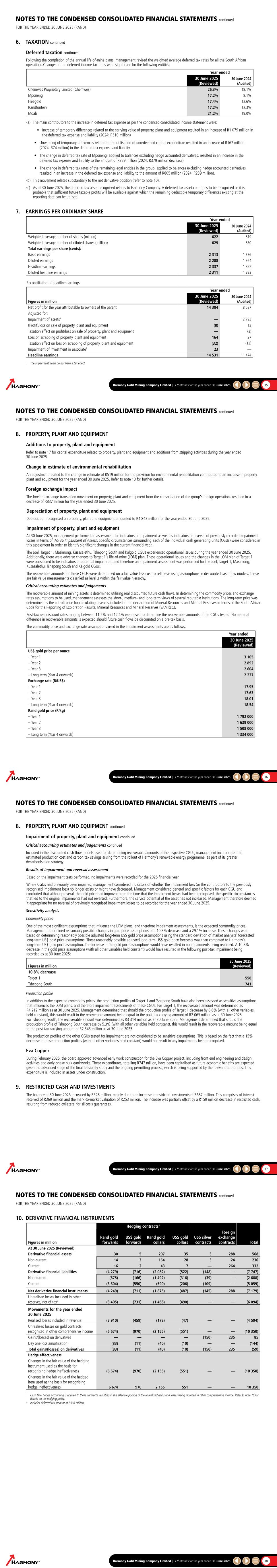 Harmony Gold Mining Company Limited | FY25 Results for the year ended 30 June 2025 35 NOTES TO THE CONDENSED CONSOLIDATED FINANCIAL STATEMENTS continued FOR THE YEAR ENDED 30 JUNE 2025 (RAND) 6. TAXATION continued Deferred taxation continued Following the completion of the annual life-of-mine plans, management revised the weighted average deferred tax rates for all the South African operations.Changes to the deferred income tax rates were significant for the following entities: Year ended 30 June 2025 (Reviewed) 30 June 2024 (Audited) Chemwes Proprietary Limited (Chemwes) 26.3% 18.1% Mponeng 17.2% 8.1% Freegold 17.4% 12.6% Randfontein 17.2% 12.3% Moab 21.2% 19.0% (a) The main contributors to the increase in deferred tax expense as per the condensed consolidated income statement were: • Increase of temporary differences related to the carrying value of property, plant and equipment resulted in an increase of R1 079 million in the deferred tax expense and liability (2024: R510 million) • Unwinding of temporary differences related to the utilisation of unredeemed capital expenditure resulted in an increase of R167 million (2024: R74 million) in the deferred tax expense and liability • The change in deferred tax rate of Mponeng, applied to balances excluding hedge accounted derivatives, resulted in an increase in the deferred tax expense and liability to the amount of R329 million (2024: R379 million decrease) • The change in deferred tax rates of the remaining legal entities in the group, applied to balances excluding hedge accounted derivatives, resulted in an increase in the deferred tax expense and liability to the amount of R805 million (2024: R239 million). (b) This movement relates substantially to the net derivative position (refer to note 10). (c) As at 30 June 2025, the deferred tax asset recognised relates to Harmony Company. A deferred tax asset continues to be recognised as it is probable that sufficient future taxable profits will be available against which the remaining deductible temporary differences existing at the reporting date can be utilised. 7. EARNINGS PER ORDINARY SHARE Year ended 30 June 2025 (Reviewed) 30 June 2024 (Audited) Weighted average number of shares (million) 622 619 Weighted average number of diluted shares (million) 629 630 Total earnings per share (cents): Basic earnings 2 313 1 386 Diluted earnings 2 288 1 364 Headline earnings 2 337 1 852 Diluted headline earnings 2 311 1 822 Reconciliation of headline earnings: Year ended Figures in million 30 June 2025 (Reviewed) 30 June 2024 (Audited) Net profit for the year attributable to owners of the parent 14 384 8 587 Adjusted for: Impairment of assets1 — 2 793 (Profit)/loss on sale of property, plant and equipment (8) 13 Taxation effect on profit/loss on sale of property, plant and equipment — (3) Loss on scrapping of property, plant and equipment 164 97 Taxation effect on loss on scrapping of property, plant and equipment (32) (13) Impairment of investment in associate1 23 — Headline earnings 14 531 11 474 1 The impairment items do not have a tax effect. Harmony Gold Mining Company Limited | FY25 Results for the year ended 30 June 2025 36 NOTES TO THE CONDENSED CONSOLIDATED FINANCIAL STATEMENTS continued FOR THE YEAR ENDED 30 JUNE 2025 (RAND) 8. PROPERTY, PLANT AND EQUIPMENT Additions to property, plant and equipment Refer to note 17 for capital expenditure related to property, plant and equipment and additions from stripping activities during the year ended 30 June 2025. Change in estimate of environmental rehabilitation An adjustment related to the change in estimate of R519 million for the provision for environmental rehabilitation contributed to an increase in property, plant and equipment for the year ended 30 June 2025. Refer to note 13 for further details. Foreign exchange impact The foreign exchange translation movement on property, plant and equipment from the consolidation of the group's foreign operations resulted in a decrease of R837 million for the year ended 30 June 2025. Depreciation of property, plant and equipment Depreciation recognised on property, plant and equipment amounted to R4 842 million for the year ended 30 June 2025. Impairment of property, plant and equipment At 30 June 2025, management performed an assessment for indicators of impairment as well as indicators of reversal of previously recorded impairment losses in terms of IAS 36 Impairment of Assets. Specific circumstances surrounding each of the individual cash generating units (CGUs) were considered in this assessment in order to identify significant changes in the current financial year. The Joel, Target 1, Masimong, Kusasalethu, Tshepong South and Kalgold CGUs experienced operational issues during the year ended 30 June 2025. Additionally, there were adverse changes to Target 1's life-of-mine (LOM) plan. These operational issues and the changes in the LOM plan of Target 1 were considered to be indicators of potential impairment and therefore an impairment assessment was performed for the Joel, Target 1, Masimong, Kusasalethu, Tshepong South and Kalgold CGUs. The recoverable amounts for these CGUs were determined on a fair value less cost to sell basis using assumptions in discounted cash flow models. These are fair value measurements classified as level 3 within the fair value hierarchy. Critical accounting estimates and judgements The recoverable amount of mining assets is determined utilising real discounted future cash flows. In determining the commodity prices and exchange rates assumptions to be used, management assesses the short-, medium- and long-term views of several reputable institutions. The long-term price was determined as the cut-off price for calculating reserves included in the declaration of Mineral Resources and Mineral Reserves in terms of the South African Code for the Reporting of Exploration Results, Mineral Resources and Mineral Reserves (SAMREC). Post-tax real discount rates ranging