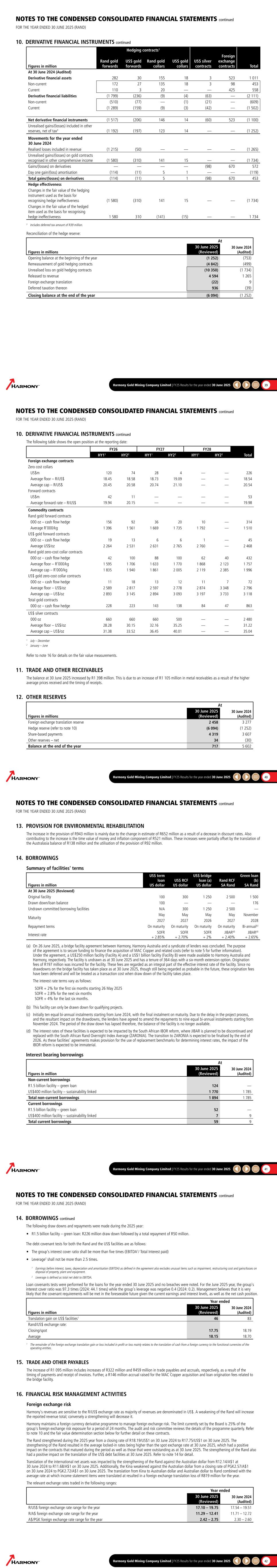 Harmony Gold Mining Company Limited | FY25 Results for the year ended 30 June 2025 39 NOTES TO THE CONDENSED CONSOLIDATED FINANCIAL STATEMENTS continued FOR THE YEAR ENDED 30 JUNE 2025 (RAND) 10. DERIVATIVE FINANCIAL INSTRUMENTS continued Figures in million Hedging contracts1 Rand gold forwards US$ gold forwards Rand gold collars US$ gold collars US$ silver contracts Foreign exchange contracts Total At 30 June 2024 (Audited) Derivative financial assets 282 30 155 18 3 523 1 011 Non-current 172 27 135 18 3 98 453 Current 110 3 20 — — 425 558 Derivative financial liabilities (1 799) (236) (9) (4) (63) — (2 111) Non-current (510) (77) — (1) (21) — (609) Current (1 289) (159) (9) (3) (42) — (1 502) Net derivative financial instruments (1 517) (206) 146 14 (60) 523 (1 100) Unrealised gains/(losses) included in other reserves, net of tax3 (1 192) (197) 123 14 — — (1 252) Movements for the year ended 30 June 2024 Realised losses included in revenue (1 215) (50) — — — — (1 265) Unrealised gains/(losses) on gold contracts recognised in other comprehensive income (1 580) (310) 141 15 — — (1 734) Gains/(losses) on derivatives — — — — (98) 670 572 Day one gain/(loss) amortisation (114) (11) 5 1 — — (119) Total gains/(losses) on derivatives (114) (11) 5 1 (98) 670 453 Hedge effectiveness Changes in the fair value of the hedging instrument used as the basis for recognising hedge ineffectiveness (1 580) (310) 141 15 — — (1 734) Changes in the fair value of the hedged item used as the basis for recognising hedge ineffectiveness 1 580 310 (141) (15) — — 1 734 3 Includes deferred tax amount of R39 million. Reconciliation of the hedge reserve: At Figures in millions 30 June 2025 (Reviewed) 30 June 2024 (Audited) Opening balance at the beginning of the year (1 252) (753) Remeasurement of gold hedging contracts (4 842) (499) Unrealised loss on gold hedging contracts (10 350) (1 734) Released to revenue 4 594 1 265 Foreign exchange translation (22) 9 Deferred taxation thereon 936 (39) Closing balance at the end of the year (6 094) (1 252) Harmony Gold Mining Company Limited | FY25 Results for the year ended 30 June 2025 40 NOTES TO THE CONDENSED CONSOLIDATED FINANCIAL STATEMENTS continued FOR THE YEAR ENDED 30 JUNE 2025 (RAND) 10. DERIVATIVE FINANCIAL INSTRUMENTS continued The following table shows the open position at the reporting date: FY26 FY27 FY28 TotalHY11 HY22 HY11 HY22 HY11 HY22 Foreign exchange contracts Zero cost collars US$m 120 74 28 4 — — 226 Average floor – R/US$ 18.45 18.58 18.73 19.09 — — 18.54 Average cap – R/US$ 20.45 20.58 20.74 21.10 — — 20.54 Forward contracts US$m 42 11 — — — — 53 Average forward rate – R/US$ 19.94 20.15 — — — — 19.98 Commodity contracts Rand gold forward contracts 000 oz – cash flow hedge 156 92 36 20 10 — 314 Average R'000/kg 1 396 1 561 1 669 1 735 1 792 — 1 510 US$ gold forward contracts 000 oz – cash flow hedge 19 13 6 6 1 — 45 Average US$/oz 2 264 2 531 2 631 2 765 2 760 — 2 468 Rand gold zero-cost collar contracts 000 oz – cash flow hedge 42 100 88 100 62 40 432 Average floor – R'000/kg 1 595 1 706 1 633 1 770 1 868 2 123 1 757 Average cap – R'000/kg 1 835 1 940 1 861 2 005 2 119 2 385 1 996 US$ gold zero-cost collar contracts 000 oz – cash flow hedge 11 18 13 12 11 7 72 Average floor – US$/oz 2 589 2 817 2 597 2 778 2 874 3 348 2 796 Average cap – US$/oz 2 893 3 145 2 894 3 093 3 197 3 733 3 118 Total gold contracts 000 oz – cash flow hedge 228 223 143 138 84 47 863 US$ silver contracts 000 oz 660 660 660 500 — — 2 480 Average floor – US$/oz 28.28 30.15 32.16 35.25 — — 31.22 Average cap – US$/oz 31.38 33.52 36.45 40.01 — — 35.04 1 July – December 2 January – June Refer to note 16 for details on the fair value measurements. 11. TRADE AND OTHER RECEIVABLES The balance at 30 June 2025 increased by R1 398 million. This is due to an increase of R1 105 million in metal receivables as a result of the higher average prices received and the timing of receipts. 12. OTHER RESERVES At Figures in millions 30 June 2025 (Reviewed) 30 June 2024 (Audited) Foreign exchange translation reserve 2 458 3 277 Hedge reserve (refer to note 10) (6 094) (1 252) Share-based payments 4 319 3 607 Other reserves – net 34 (30) Balance at the end of the year 717 5 602 Harmony Gold Mining Company Limited | FY25 Results for the year ended 30 June 2025 41 14. BORROWINGS Summary of facilities' terms Figures in million US$ term loan US dollar US$ RCF US dollar US$ bridge loan (a) US dollar Rand RCF SA Rand Green loan (b) SA Rand At 30 June 2025 (Reviewed) Original facility 100 300 1 250 2 500 1 500 Drawn down/loan balance 100 — — — 176 Undrawn committed borrowing facilities N/A 300 1 250 2 500 — Maturity May May May May November 2027 2027 2026 2027 2028 Repayment terms On maturity On maturity On maturity On maturity Bi-annual(c) Interest rate SOFR + 2.85% SOFR + 2.70% SOFR + 2% JIBAR(d) + 2.40% JIBAR(d) + 2.65% (a) On 26 June 2025, a bridge facility agreement between Harmony, Harmony Australia and a syndicate of lenders was concluded. The purpose of the agreement is to secure funding to finance the acquisition of MAC Copper and related costs (refer to note 5 for further information). Under the agreement, a US$250 million facility (Facility A) and a US$1 billion facility (Facility B) were made available to Harmony Australia and Harmony, respectively. The facility is undrawn as at 30 June 2025 and has a tenure of 364 days with a six-month extension option. Origination fees of R197 million was incurred for the facility. These fees are regarded as an integral part of the effective interest rate of the facility. Since no drawdowns on the bridge facility has taken place as at 30 June 2025, though still being regarded as probable in the future, these origination fees have been deferred and will be treated as a transaction cost when draw down of the facility takes place. 