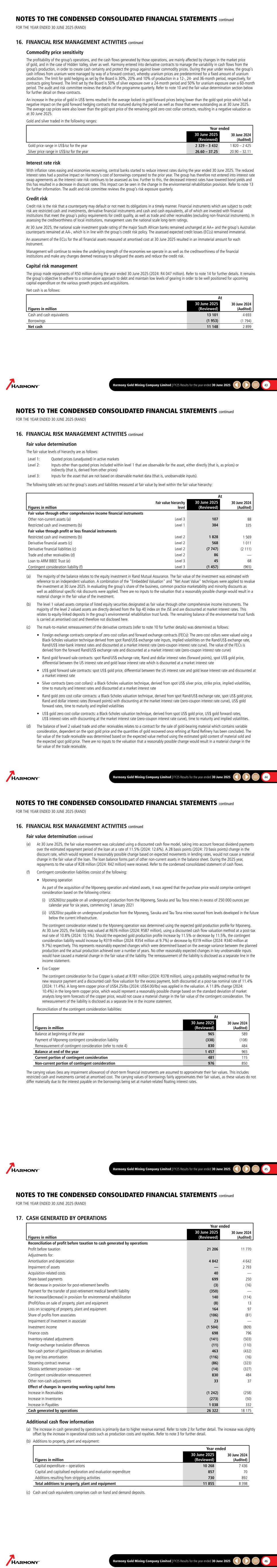 Harmony Gold Mining Company Limited | FY25 Results for the year ended 30 June 2025 43 NOTES TO THE CONDENSED CONSOLIDATED FINANCIAL STATEMENTS continued FOR THE YEAR ENDED 30 JUNE 2025 (RAND) 16. FINANCIAL RISK MANAGEMENT ACTIVITIES continued Commodity price sensitivity The profitability of the group’s operations, and the cash flows generated by those operations, are mainly affected by changes in the market price of gold, and in the case of Hidden Valley, silver as well. Harmony entered into derivative contracts to manage the variability in cash flows from the group’s production, in order to create cash certainty and protect the group against lower commodity prices. During the year under review, the group's cash inflows from uranium were managed by way of a forward contract, whereby uranium prices are predetermined for a fixed amount of uranium production. The limit for gold hedging as set by the Board is 30%, 20% and 10% of production in a 12-, 24- and 36-month period, respectively, for contracts going forward. The limit set by the Board is 50% of silver exposure over a 24-month period and 50% for uranium exposure over a 60-month period. The audit and risk committee reviews the details of the programme quarterly. Refer to note 10 and the fair value determination section below for further detail on these contracts. An increase in the price of gold in US$ terms resulted in the average locked-in gold forward prices being lower than the gold spot price which had a negative impact on the gold forward hedging contracts that matured during the period as well as those that were outstanding as at 30 June 2025. The average cap prices were also lower than the gold spot price of the remaining gold zero cost collar contracts, resulting in a negative valuation as at 30 June 2025. Gold and silver traded in the following ranges: Year ended 30 June 2025 (Reviewed) 30 June 2024 (Audited) Gold price range in US$/oz for the year 2 329 – 3 432 1 820 – 2 425 Silver price range in US$/oz for the year 26.60 – 37.25 20.90 – 32.11 Interest rate risk With inflation rates easing and economies recovering, central banks started to reduce interest rates during the year ended 30 June 2025. The reduced interest rates had a positive impact on Harmony's cost of borrowings compared to the prior year. The group has therefore not entered into interest rate swap agreements as the interest rate risk continues to be assessed as low. Further to this, the decreased interest rates have lowered bond yields and this has resulted in a decrease in discount rates. This impact can be seen in the change in the environmental rehabilitation provision. Refer to note 13 for further information. The audit and risk committee reviews the group's risk exposure quarterly. Credit risk Credit risk is the risk that a counterparty may default or not meet its obligations in a timely manner. Financial instruments which are subject to credit risk are restricted cash and investments, derivative financial instruments and cash and cash equivalents, all of which are invested with financial institutions that meet the group's policy requirements for credit quality, as well as trade and other receivables (excluding non-financial instruments). In assessing the creditworthiness of local institutions, management uses the national scale long-term ratings. At 30 June 2025, the national scale investment grade rating of the major South African banks remained unchanged at AA+ and the group's Australian counterparts remained at AA-, which is in line with the group's credit risk policy. The assessed expected credit losses (ECLs) remained immaterial. An assessment of the ECLs for the all financial assets measured at amortised cost at 30 June 2025 resulted in an immaterial amount for each instrument. Management will continue to review the underlying strength of the economies we operate in as well as the creditworthiness of the financial institutions and make any changes deemed necessary to safeguard the assets and reduce the credit risk. Capital risk management The group made repayments of R50 million during the year ended 30 June 2025 (2024: R4 047 million). Refer to note 14 for further details. It remains the group's objective to adhere to a conservative approach to debt and maintain low levels of gearing in order to be well positioned for upcoming capital expenditure on the various growth projects and acquisitions. Net cash is as follows: At Figures in million 30 June 2025 (Reviewed) 30 June 2024 (Audited) Cash and cash equivalents 13 101 4 693 Borrowings (1 953) (1 794) Net cash 11 148 2 899 Harmony Gold Mining Company Limited | FY25 Results for the year ended 30 June 2025 44 NOTES TO THE CONDENSED CONSOLIDATED FINANCIAL STATEMENTS continued FOR THE YEAR ENDED 30 JUNE 2025 (RAND) 16. FINANCIAL RISK MANAGEMENT ACTIVITIES continued Fair value determination The fair value levels of hierarchy are as follows: Level 1: Quoted prices (unadjusted) in active markets Level 2: Inputs other than quoted prices included within level 1 that are observable for the asset, either directly (that is, as prices) or indirectly (that is, derived from other prices) Level 3: Inputs for the asset that are not based on observable market data (that is, unobservable inputs). The following table sets out the group's assets and liabilities measured at fair value by level within the fair value hierarchy: At Figures in million Fair value hierarchy level 30 June 2025 (Reviewed) 30 June 2024 (Audited) Fair value through other comprehensive income financial instruments Other non-current assets (a) Level 3 107 88 Restricted cash and investments (b) Level 1 384 335 Fair value through profit or loss financial instruments Restricted cash and investments (b) Level 2 1 828 1 569 Derivative financial assets (c) Level 2 568 1 011 Derivative financial liabilities (c) Level 2 (7 747) (2 111) Trade and other receivables (d) Level 2 86 — Loan to ARM BBEE Trust (e) Level 3 45 68 Contingent considerati