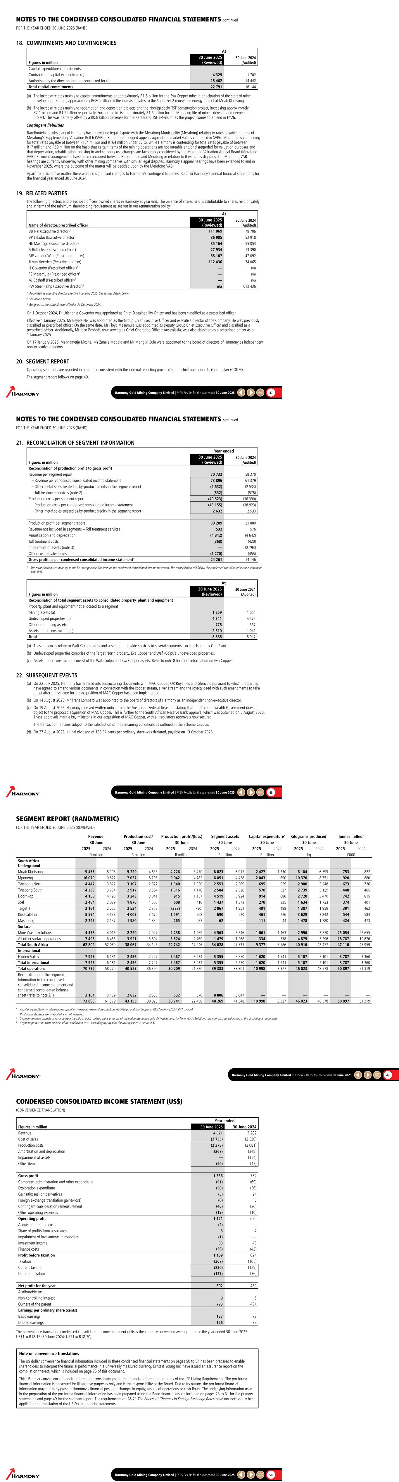 Harmony Gold Mining Company Limited | FY25 Results for the year ended 30 June 2025 47 NOTES TO THE CONDENSED CONSOLIDATED FINANCIAL STATEMENTS continued FOR THE YEAR ENDED 30 JUNE 2025 (RAND) 18. COMMITMENTS AND CONTINGENCIES At Figures in million 30 June 2025 (Reviewed) 30 June 2024 (Audited) Capital expenditure commitments: Contracts for capital expenditure (a) 4 329 1 702 Authorised by the directors but not contracted for (b) 18 462 14 442 Total capital commitments 22 791 16 144 (a) The increase relates mainly to capital commitments of approximately R1.8 billion for the Eva Copper mine in anticipation of the start of mine development. Further, approximately R680 million of the increase relates to the Sungazer 2 renewable energy project at Moab Khotsong. (b) The increase relates mainly to reclamation and deposition projects and the Nooitgedacht TSF construction project, increasing approximately R2.1 billion and R1.2 billion respectively. Further to this is approximately R1.6 billion for the Mponeng life of mine extension and deepening project. This was partially offset by a R0.8 billion decrease for the Kareerand TSF extension as the project comes to an end in FY26. Contingent liabilities Randfontein, a subsidiary of Harmony has an existing legal dispute with the Merafong Municipality (Merafong) relating to rates payable in terms of Merafong's Supplementary Valuation Roll 6 (SVR6). Randfontein lodged appeals against the market values contained in SVR6. Merafong is contending for total rates payable of between R124 million and R164 million under SVR6, while Harmony is contending for total rates payable of between R17 million and R69 million on the basis that certain items of the mining operations are not rateable and/or disregarded for valuation purposes and that depreciation, rehabilitation, phasing-in and category use changes are favourably considered by the Merafong Valuation Appeal Board (Merafong VAB). Payment arrangements have been concluded between Randfontein and Merafong in relation to these rates disputes. The Merafong VAB hearings are currently underway with other mining companies with similar legal disputes. Harmony's appeal hearings have been extended to end in November 2025, where the outcome of the matter will be decided upon by the Merafong VAB. Apart from the above matter, there were no significant changes to Harmony's contingent liabilities. Refer to Harmony's annual financial statements for the financial year ended 30 June 2024. 19. RELATED PARTIES The following directors and prescribed officers owned shares in Harmony at year end. The balance of shares held is attributable to shares held privately and in terms of the minimum shareholding requirement as set out in our remuneration policy: At Name of director/prescribed officer 30 June 2025 (Reviewed) 30 June 2024 (Audited) BB Nel (Executive director)1 111 869 79 706 BP Lekubo (Executive director) 86 985 52 918 HE Mashego (Executive director) 85 164 55 053 A Buthelezi (Prescribed officer) 27 934 13 390 MP van der Walt (Prescribed officer) 68 107 47 092 JJ van Heerden (Prescribed officer) 112 436 74 065 U Govender (Prescribed officer)2 — n/a FS Masemula (Prescribed officer)2 — n/a AJ Boshoff (Prescribed officer)2 — n/a PW Steenkamp (Executive director)3 n/a 612 436 20. SEGMENT REPORT Operating segments are reported in a manner consistent with the internal reporting provided to the chief operating decision-maker (CODM). The segment report follows on page 49. 1 Appointed as executive director effective 1 January 2025. See further details below. 2 See details below. 3 Resigned as executive director effective 31 December 2024. On 1 October 2024, Dr Urishanie Govender was appointed as Chief Sustainability Officer and has been classified as a prescribed officer. Effective 1 January 2025, Mr Beyers Nel was appointed as the Group Chief Executive Officer and executive director of the Company. He was previously classified as prescribed officer. On the same date, Mr Floyd Masemula was appointed as Deputy Group Chief Executive Officer and classified as a prescribed officer. Additionally, Mr Jaco Boshoff, now serving as Chief Operating Officer: Australasia, was also classified as a prescribed officer as of 1 January 2025. On 17 January 2025, Ms Mametja Moshe, Ms Zanele Matlala and Mr Mangisi Gule were appointed to the board of directors of Harmony as independent non-executive directors. Harmony Gold Mining Company Limited | FY25 Results for the year ended 30 June 2025 48 NOTES TO THE CONDENSED CONSOLIDATED FINANCIAL STATEMENTS continued FOR THE YEAR ENDED 30 JUNE 2025 (RAND) 21. RECONCILIATION OF SEGMENT INFORMATION Year ended Figures in million 30 June 2025 (Reviewed) 30 June 2024 (Audited) Reconciliation of production profit to gross profit Revenue per segment report 70 732 58 270 – Revenue per condensed consolidated income statement 73 896 61 379 – Other metal sales treated as by-product credits in the segment report (2 632) (2 533) – Toll treatment services (note 2) (532) (576) Production costs per segment report (40 523) (36 390) – Production costs per condensed consolidated income statement (43 155) (38 923) – Other metal sales treated as by-product credits in the segment report 2 632 2 533 Production profit per segment report 30 209 21 880 Revenue not included in segments – Toll treatment services 532 576 Amortisation and depreciation (4 842) (4 642) Toll treatment costs (368) (420) Impairment of assets (note 3) — (2 793) Other cost of sales items (1 270) (455) Gross profit as per condensed consolidated income statement1 24 261 14 146 1 The reconciliation was done up to the first recognisable line item on the condensed consolidated income statement. The reconciliation will follow the condensed consolidated income statement after that. At Figures in million 30 June 2025 (Reviewed) 30 June 2024 (Audited) Reconciliation of total segment assets to consolidated property, plant and equipment Property, plant and 
