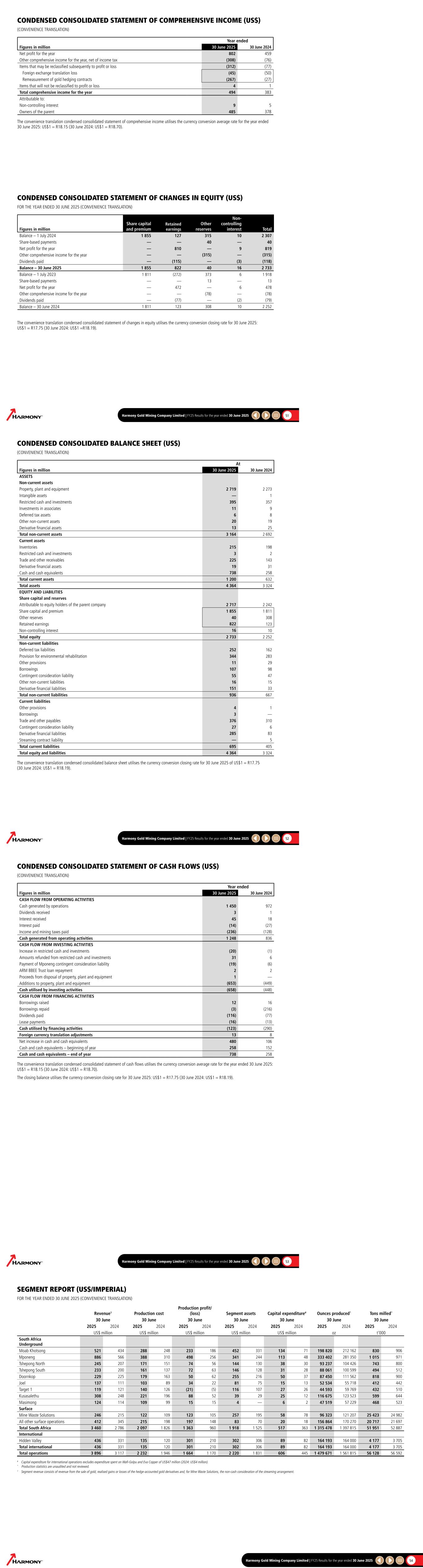 Harmony Gold Mining Company Limited | FY25 Results for the year ended 30 June 2025 51 Year ended Figures in million 30 June 2025 30 June 2024 Net profit for the year 802 459 Other comprehensive income for the year, net of income tax (308) (76) Items that may be reclassified subsequently to profit or loss (312) (77) Foreign exchange translation loss (45) (50) Remeasurement of gold hedging contracts (267) (27) Items that will not be reclassified to profit or loss 4 1 Total comprehensive income for the year 494 383 Attributable to: Non-controlling interest 9 5 Owners of the parent 485 378 The convenience translation condensed consolidated statement of comprehensive income utilises the currency conversion average rate for the year ended 30 June 2025: US$1 = R18.15 (30 June 2024: US$1 = R18.70). Figures in million Share capital and premium Retained earnings Other reserves Non- controlling interest Total Balance – 1 July 2024 1 855 127 315 10 2 307 Share-based payments — — 40 — 40 Net profit for the year — 810 — 9 819 Other comprehensive income for the year — — (315) — (315) Dividends paid — (115) — (3) (118) Balance – 30 June 2025 1 855 822 40 16 2 733 Balance – 1 July 2023 1 811 (272) 373 6 1 918 Share-based payments — — 13 — 13 Net profit for the year — 472 — 6 478 Other comprehensive income for the year — — (78) — (78) Dividends paid — (77) — (2) (79) Balance – 30 June 2024 1 811 123 308 10 2 252 The convenience translation condensed consolidated statement of changes in equity utilises the currency conversion closing rate for 30 June 2025: US$1 = R17.75 (30 June 2024: US$1 =R18.19). CONDENSED CONSOLIDATED STATEMENT OF COMPREHENSIVE INCOME (US$) (CONVENIENCE TRANSLATION) CONDENSED CONSOLIDATED STATEMENT OF CHANGES IN EQUITY (US$) FOR THE YEAR ENDED 30 JUNE 2025 (CONVENIENCE TRANSLATION) Harmony Gold Mining Company Limited | FY25 Results for the year ended 30 June 2025 52 CONDENSED CONSOLIDATED BALANCE SHEET (US$) (CONVENIENCE TRANSLATION) At Figures in million 30 June 2025 30 June 2024 ASSETS Non-current assets Property, plant and equipment 2 719 2 273 Intangible assets — 1 Restricted cash and investments 395 357 Investments in associates 11 9 Deferred tax assets 6 8 Other non-current assets 20 19 Derivative financial assets 13 25 Total non-current assets 3 164 2 692 Current assets Inventories 215 198 Restricted cash and investments 3 2 Trade and other receivables 225 143 Derivative financial assets 19 31 Cash and cash equivalents 738 258 Total current assets 1 200 632 Total assets 4 364 3 324 EQUITY AND LIABILITIES Share capital and reserves Attributable to equity holders of the parent company 2 717 2 242 Share capital and premium 1 855 1 811 Other reserves 40 308 Retained earnings 822 123 Non-controlling interest 16 10 Total equity 2 733 2 252 Non-current liabilities Deferred tax liabilities 252 162 Provision for environmental rehabilitation 344 283 Other provisions 11 29 Borrowings 107 98 Contingent consideration liability 55 47 Other non-current liabilities 16 15 Derivative financial liabilities 151 33 Total non-current liabilities 936 667 Current liabilities Other provisions 4 1 Borrowings 3 — Trade and other payables 376 310 Contingent consideration liability 27 6 Derivative financial liabilities 285 83 Streaming contract liability — 5 Total current liabilities 695 405 Total equity and liabilities 4 364 3 324 The convenience translation condensed consolidated balance sheet utilises the currency conversion closing rate for 30 June 2025 of US$1 = R17.75 (30 June 2024: US$1 = R18.19). Harmony Gold Mining Company Limited | FY25 Results for the year ended 30 June 2025 53 CONDENSED CONSOLIDATED STATEMENT OF CASH FLOWS (US$) (CONVENIENCE TRANSLATION) Year ended Figures in million 30 June 2025 30 June 2024 CASH FLOW FROM OPERATING ACTIVITIES Cash generated by operations 1 450 972 Dividends received 3 1 Interest received 45 18 Interest paid (14) (27) Income and mining taxes paid (236) (128) Cash generated from operating activities 1 248 836 CASH FLOW FROM INVESTING ACTIVITIES Increase in restricted cash and investments (20) (1) Amounts refunded from restricted cash and investments 31 6 Payment of Mponeng contingent consideration liability (19) (6) ARM BBEE Trust loan repayment 2 2 Proceeds from disposal of property, plant and equipment 1 — Additions to property, plant and equipment (653) (449) Cash utilised by investing activities (658) (448) CASH FLOW FROM FINANCING ACTIVITIES Borrowings raised 12 16 Borrowings repaid (3) (216) Dividends paid (116) (77) Lease payments (16) (13) Cash utilised by financing activities (123) (290) Foreign currency translation adjustments 13 8 Net increase in cash and cash equivalents 480 106 Cash and cash equivalents – beginning of year 258 152 Cash and cash equivalents – end of year 738 258 The convenience translation condensed consolidated statement of cash flows utilises the currency conversion average rate for the year ended 30 June 2025: US$1 = R18.15 (30 June 2024: US$1 = R18.70). The closing balance utilises the currency conversion closing rate for 30 June 2025: US$1 = R17.75 (30 June 2024: US$1 = R18.19). Harmony Gold Mining Company Limited | FY25 Results for the year ended 30 June 2025 54 SEGMENT REPORT (US$/IMPERIAL) FOR THE YEAR ENDED 30 JUNE 2025 (CONVENIENCE TRANSLATION) Revenue1 Production cost Production profit/ (loss) Segment assets Capital expenditure# Ounces produced* Tons milled* 30 June 30 June 30 June 30 June 30 June 30 June 30 June 2025 2024 2025 2024 2025 2024 2025 2024 2025 2024 2025 2024 2025 2024 US$ million US$ million US$ million US$ million US$ million oz t'000 South Africa Underground Moab Khotsong 521 434 288 248 233 186 452 331 134 71 198 820 212 162 830 906 Mponeng 886 566 388 310 498 256 341 244 113 48 333 402 281 350 1 015 971 Tshepong North 245 207 171 151 74 56 144 130 38 30 93 237 104 426 743 800 Tshepong South 233 200 161 137 72 63 146 128 31 28 88 061 100 599 494 5