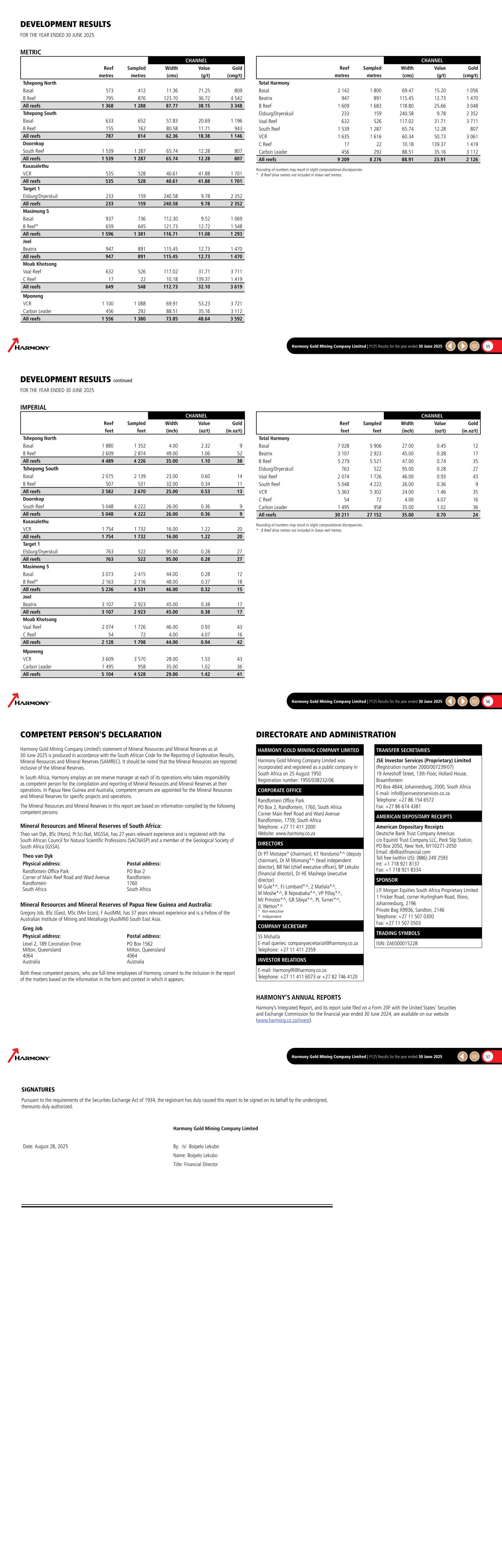 Harmony Gold Mining Company Limited | FY25 Results for the year ended 30 June 2025 55 DEVELOPMENT RESULTS FOR THE YEAR ENDED 30 JUNE 2025 METRIC CHANNEL Reef Sampled Width Value Gold metres metres (cms) (g/t) (cmg/t) Tshepong North Basal 573 412 11.36 71.25 809 B Reef 795 876 123.70 36.72 4 542 All reefs 1 368 1 288 87.77 38.15 3 348 Tshepong South Basal 633 652 57.83 20.69 1 196 B Reef 155 162 80.58 11.71 943 All reefs 787 814 62.36 18.38 1 146 Doornkop South Reef 1 539 1 287 65.74 12.28 807 All reefs 1 539 1 287 65.74 12.28 807 Kusasalethu VCR 535 528 40.61 41.88 1 701 All reefs 535 528 40.61 41.88 1 701 Target 1 Elsburg/Dryerskuil 233 159 240.58 9.78 2 352 All reefs 233 159 240.58 9.78 2 352 Masimong 5 Basal 937 736 112.30 9.52 1 069 B Reef* 659 645 121.73 12.72 1 548 All reefs 1 596 1 381 116.71 11.08 1 293 Joel Beatrix 947 891 115.45 12.73 1 470 All reefs 947 891 115.45 12.73 1 470 Moab Khotsong Vaal Reef 632 526 117.02 31.71 3 711 C Reef 17 22 10.18 139.37 1 419 All reefs 649 548 112.73 32.10 3 619 Mponeng VCR 1 100 1 088 69.91 53.23 3 721 Carbon Leader 456 292 88.51 35.16 3 112 All reefs 1 556 1 380 73.85 48.64 3 592 CHANNEL Reef Sampled Width Value Gold metres metres (cms) (g/t) (cmg/t) Total Harmony Basal 2 142 1 800 69.47 15.20 1 056 Beatrix 947 891 115.45 12.73 1 470 B Reef 1 609 1 683 118.80 25.66 3 048 Elsburg/Dryerskuil 233 159 240.58 9.78 2 352 Vaal Reef 632 526 117.02 31.71 3 711 South Reef 1 539 1 287 65.74 12.28 807 VCR 1 635 1 616 60.34 50.73 3 061 C Reef 17 22 10.18 139.37 1 419 Carbon Leader 456 292 88.51 35.16 3 112 All reefs 9 209 8 276 88.91 23.91 2 126 Rounding of numbers may result in slight computational discrepancies. * B Reef drive metres not included in linear reef metres. Harmony Gold Mining Company Limited | FY25 Results for the year ended 30 June 2025 56 DEVELOPMENT RESULTS continued FOR THE YEAR ENDED 30 JUNE 2025 IMPERIAL CHANNEL Reef Sampled Width Value Gold feet feet (inch) (oz/t) (in.oz/t) Tshepong North Basal 1 880 1 352 4.00 2.32 9 B Reef 2 609 2 874 49.00 1.06 52 All reefs 4 489 4 226 35.00 1.10 38 Tshepong South Basal 2 075 2 139 23.00 0.60 14 B Reef 507 531 32.00 0.34 11 All reefs 2 582 2 670 25.00 0.53 13 Doornkop South Reef 5 048 4 222 26.00 0.36 9 All reefs 5 048 4 222 26.00 0.36 9 Kusasalethu VCR 1 754 1 732 16.00 1.22 20 All reefs 1 754 1 732 16.00 1.22 20 Target 1 Elsburg/Dryerskuil 763 522 95.00 0.28 27 All reefs 763 522 95.00 0.28 27 Masimong 5 Basal 3 073 2 415 44.00 0.28 12 B Reef* 2 163 2 116 48.00 0.37 18 All reefs 5 236 4 531 46.00 0.32 15 Joel Beatrix 3 107 2 923 45.00 0.38 17 All reefs 3 107 2 923 45.00 0.38 17 Moab Khotsong Vaal Reef 2 074 1 726 46.00 0.93 43 C Reef 54 72 4.00 4.07 16 All reefs 2 128 1 798 44.00 0.94 42 Mponeng VCR 3 609 3 570 28.00 1.53 43 Carbon Leader 1 495 958 35.00 1.02 36 All reefs 5 104 4 528 29.00 1.42 41 CHANNEL Reef Sampled Width Value Gold feet feet (inch) (oz/t) (in.oz/t) Total Harmony Basal 7 028 5 906 27.00 0.45 12 Beatrix 3 107 2 923 45.00 0.38 17 B Reef 5 279 5 521 47.00 0.74 35 Elsburg/Dryerskuil 763 522 95.00 0.28 27 Vaal Reef 2 074 1 726 46.00 0.93 43 South Reef 5 048 4 222 26.00 0.36 9 VCR 5 363 5 302 24.00 1.46 35 C Reef 54 72 4.00 4.07 16 Carbon Leader 1 495 958 35.00 1.02 36 All reefs 30 211 27 152 35.00 0.70 24 Rounding of numbers may result in slight computational discrepancies. * B Reef drive metres not included in linear reef metres. Harmony Gold Mining Company Limited | FY25 Results for the year ended 30 June 2025 57 COMPETENT PERSON'S DECLARATION Harmony Gold Mining Company Limited’s statement of Mineral Resources and Mineral Reserves as at 30 June 2025 is produced in accordance with the South African Code for the Reporting of Exploration Results, Mineral Resources and Mineral Reserves (SAMREC). It should be noted that the Mineral Resources are reported inclusive of the Mineral Reserves. In South Africa, Harmony employs an ore reserve manager at each of its operations who takes responsibility as competent person for the compilation and reporting of Mineral Resources and Mineral Reserves at their operations. In Papua New Guinea and Australia, competent persons are appointed for the Mineral Resources and Mineral Reserves for specific projects and operations. The Mineral Resources and Mineral Reserves in this report are based on information compiled by the following competent persons: Mineral Resources and Mineral Reserves of South Africa: Theo van Dyk, BSc (Hons), Pr.Sci.Nat, MGSSA, has 27 years relevant experience and is registered with the South African Council for Natural Scientific Professions (SACNASP) and a member of the Geological Society of South Africa (GSSA). Theo van Dyk Physical address: Postal address: Randfontein Office Park Corner of Main Reef Road and Ward Avenue Randfontein South Africa PO Box 2 Randfontein 1760 South Africa Mineral Resources and Mineral Reserves of Papua New Guinea and Australia: Gregory Job, BSc (Geo), MSc (Min Econ), F AusIMM, has 37 years relevant experience and is a Fellow of the Australian Institute of Mining and Metallurgy (AusIMM) South East Asia. Greg Job Physical address: Postal address: Level 2, 189 Coronation Drive Milton, Queensland 4064 Australia PO Box 1562 Milton, Queensland 4064 Australia Both these competent persons, who are full-time employees of Harmony, consent to the inclusion in the report of the matters based on the information in the form and context in which it appears. HARMONY GOLD MINING COMPANY LIMITED Harmony Gold Mining Company Limited was incorporated and registered as a public company in South Africa on 25 August 1950 Registration number: 1950/038232/06 CORPORATE OFFICE Randfontein Office Park PO Box 2, Randfontein, 1760, South Africa Corner Main Reef Road and Ward Avenue Randfontein, 1759, South Africa Telephone: +27 11 411 2000 Website: www.harmony.co.za DIRECTORS Dr PT Motsepe* (chairman), KT Nondumo*^ (deputy chairman), Dr M Msimang*^ (lead independent director), BB Nel (chief executive officer), BP Lekubo (fina