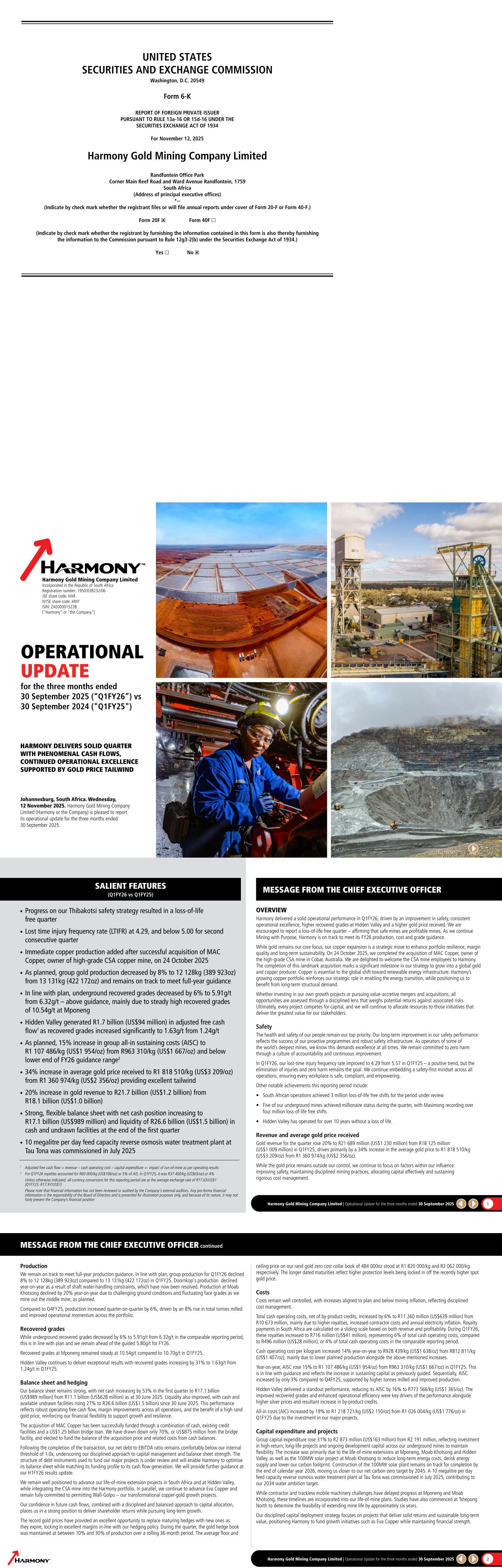UNITED STATES SECURITIES AND EXCHANGE COMMISSION Washington, D.C. 20549 Form 6­K REPORT OF FOREIGN PRIVATE ISSUER PURSUANT TO RULE 13a­16 OR 15d­16 UNDER THE SECURITIES EXCHANGE ACT OF 1934 For November 12, 2025 Harmony Gold Mining Company Limited Randfontein Office Park Corner Main Reef Road and Ward Avenue Randfontein, 1759 South Africa (Address of principal executive offices) *-­ (Indicate by check mark whether the registrant files or will file annual reports under cover of Form 20­F or Form 40­F.) Form 20F ☒ Form 40F ☐ (Indicate by check mark whether the registrant by furnishing the information contained in this form is also thereby furnishing the information to the Commission pursuant to Rule 12g3­2(b) under the Securities Exchange Act of 1934.) Yes ☐ No ☒ OPERATIONAL UPDATE for the three months ended 30 September 2025 (“Q1FY26”) vs 30 September 2024 ("Q1FY25") HARMONY DELIVERS SOLID QUARTER WITH PHENOMENAL CASH FLOWS, CONTINUED OPERATIONAL EXCELLENCE SUPPORTED BY GOLD PRICE TAILWIND Johannesburg, South Africa. Wednesday, 12 November 2025. Harmony Gold Mining Company Limited (Harmony or the Company) is pleased to report its operational update for the three months ended 30 September 2025. Harmony Gold Mining Company Limited Incorporated in the Republic of South Africa Registration number: 1950/038232/06 JSE share code: HAR NYSE share code: HMY ISIN: ZAE000015228 ("Harmony" or "the Company") Harmony Gold Mining Company Limited | Operational Update for the three months ended 30 September 2025 1 MESSAGE FROM THE CHIEF EXECUTIVE OFFICER OVERVIEW Harmony delivered a solid operational performance in Q1FY26, driven by an improvement in safety, consistent operational excellence, higher recovered grades at Hidden Valley and a higher gold price received. We are encouraged to report a loss-of-life-free quarter – affirming that safe mines are profitable mines. As we continue Mining with Purpose, Harmony is on track to meet its FY26 production, cost and grade guidance. While gold remains our core focus, our copper expansion is a strategic move to enhance portfolio resilience, margin quality and long-term sustainability. On 24 October 2025, we completed the acquisition of MAC Copper, owner of the high-grade CSA mine in Cobar, Australia. We are delighted to welcome the CSA mine employees to Harmony. The completion of this landmark acquisition marks a significant milestone in our strategy to grow into a global gold and copper producer. Copper is essential to the global shift toward renewable energy infrastructure. Harmony’s growing copper portfolio reinforces our strategic role in enabling the energy transition, while positioning us to benefit from long-term structural demand. Whether investing in our own growth projects or pursuing value-accretive mergers and acquisitions, all opportunities are assessed through a disciplined lens that weighs potential returns against associated risks. Ultimately, every project competes for capital, and we will continue to allocate resources to those initiatives that deliver the greatest value for our stakeholders. Safety The health and safety of our people remain our top priority. Our long-term improvement in our safety performance reflects the success of our proactive programmes and robust safety infrastructure. As operators of some of the world’s deepest mines, we know this demands excellence at all times. We remain committed to zero harm through a culture of accountability and continuous improvement. In Q1FY26, our lost-time injury frequency rate improved to 4.29 from 5.57 in Q1FY25 – a positive trend, but the elimination of injuries and zero harm remains the goal. We continue embedding a safety-first mindset across all operations, ensuring every workplace is safe, compliant, and empowering. Other notable achievements this reporting period include: • South African operations achieved 3 million loss-of-life free shifts for the period under review • Five of our underground mines achieved millionaire status during the quarter, with Masimong recording over four million loss-of-life free shifts • Hidden Valley has operated for over 10 years without a loss of life. Revenue and average gold price received Gold revenue for the quarter rose 20% to R21 689 million (US$1 230 million) from R18 125 million (US$1 009 million) in Q1FY25, driven primarily by a 34% increase in the average gold price to R1 818 510/kg (US$3 209/oz) from R1 360 974/kg (US$2 356/oz). While the gold price remains outside our control, we continue to focus on factors within our influence: improving safety, maintaining disciplined mining practices, allocating capital effectively and sustaining rigorous cost management. • Progress on our Thibakotsi safety strategy resulted in a loss-of-life free quarter • Lost time injury frequency rate (LTIFR) at 4.29, and below 5.00 for second consecutive quarter • Immediate copper production added after successful acquisition of MAC Copper, owner of high-grade CSA copper mine, on 24 October 2025 • As planned, group gold production decreased by 8% to 12 128kg (389 923oz) from 13 131kg (422 172oz) and remains on track to meet full-year guidance • In line with plan, underground recovered grades decreased by 6% to 5.91g/t from 6.32g/t – above guidance, mainly due to steady high recovered grades of 10.54g/t at Mponeng • Hidden Valley generated R1.7 billion (US$94 million) in adjusted free cash flow1 as recovered grades increased significantly to 1.63g/t from 1.24g/t • As planned, 15% increase in group all-in sustaining costs (AISC) to R1 107 486/kg (US$1 954/oz) from R963 310/kg (US$1 667/oz) and below lower end of FY26 guidance range2 • 34% increase in average gold price received to R1 818 510/kg (US$3 209/oz) from R1 360 974/kg (US$2 356/oz) providing excellent tailwind • 20% increase in gold revenue to R21.7 billion (US$1.2 billion) from R18.1 billion (US$1.0 billion) • Strong, f