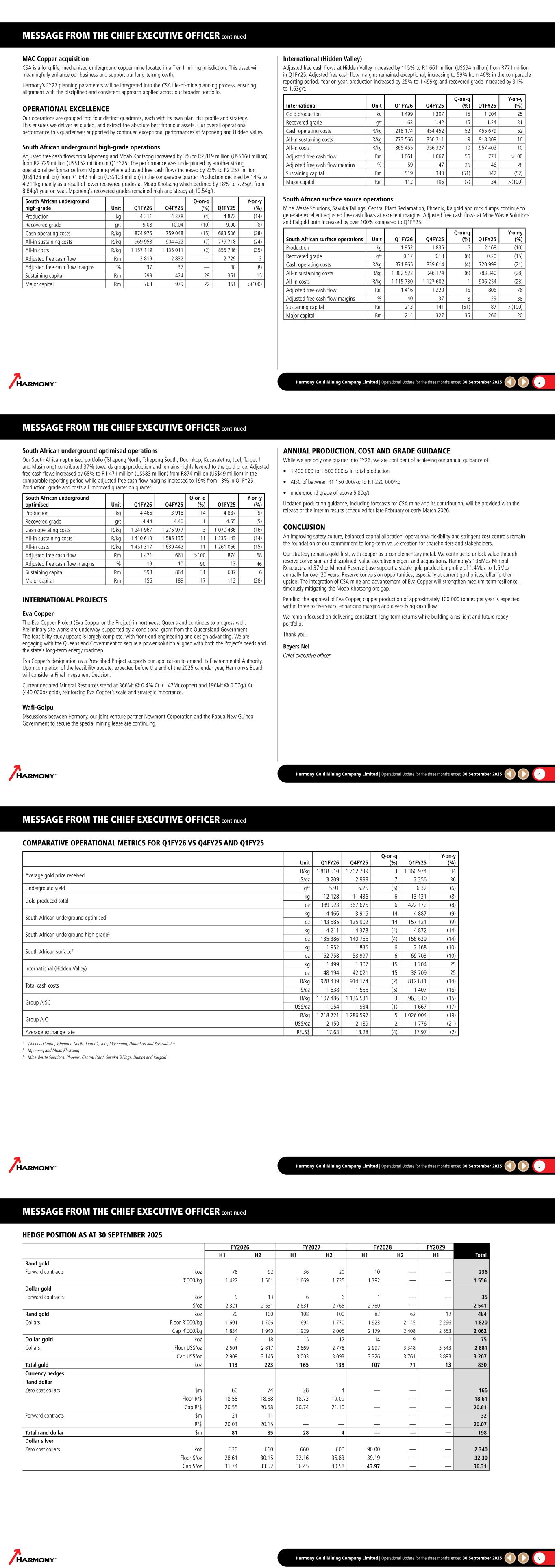 MESSAGE FROM THE CHIEF EXECUTIVE OFFICER continued Harmony Gold Mining Company Limited | Operational Update for the three months ended 30 September 2025 3 MAC Copper acquisition CSA is a long-life, mechanised underground copper mine located in a Tier-1 mining jurisdiction. This asset will meaningfully enhance our business and support our long-term growth. Harmony’s FY27 planning parameters will be integrated into the CSA life-of-mine planning process, ensuring alignment with the disciplined and consistent approach applied across our broader portfolio. OPERATIONAL EXCELLENCE Our operations are grouped into four distinct quadrants, each with its own plan, risk profile and strategy. This ensures we deliver as guided, and extract the absolute best from our assets. Our overall operational performance this quarter was supported by continued exceptional performances at Mponeng and Hidden Valley. South African underground high-grade operations Adjusted free cash flows from Mponeng and Moab Khotsong increased by 3% to R2 819 million (US$160 million) from R2 729 million (US$152 million) in Q1FY25. The performance was underpinned by another strong operational performance from Mponeng where adjusted free cash flows increased by 23% to R2 257 million (US$128 million) from R1 842 million (US$103 million) in the comparable quarter. Production declined by 14% to 4 211kg mainly as a result of lower recovered grades at Moab Khotsong which declined by 18% to 7.25g/t from 8.84g/t year on year. Mponeng's recovered grades remained high and steady at 10.54g/t. South African underground high-grade Unit Q1FY26 Q4FY25 Q-on-q (%) Q1FY25 Y-on-y (%) Production kg 4 211 4 378 (4) 4 872 (14) Recovered grade g/t 9.08 10.04 (10) 9.90 (8) Cash operating costs R/kg 874 975 759 048 (15) 683 506 (28) All-in sustaining costs R/kg 969 958 904 422 (7) 779 718 (24) All-in costs R/kg 1 157 119 1 135 011 (2) 855 746 (35) Adjusted free cash flow Rm 2 819 2 832 — 2 729 3 Adjusted free cash flow margins % 37 37 — 40 (8) Sustaining capital Rm 299 424 29 351 15 Major capital Rm 763 979 22 361 >(100) International (Hidden Valley) Adjusted free cash flows at Hidden Valley increased by 115% to R1 661 million (US$94 million) from R771 million in Q1FY25. Adjusted free cash flow margins remained exceptional, increasing to 59% from 46% in the comparable reporting period. Year on year, production increased by 25% to 1 499kg and recovered grade increased by 31% to 1.63g/t. International Unit Q1FY26 Q4FY25 Q-on-q (%) Q1FY25 Y-on-y (%) Gold production kg 1 499 1 307 15 1 204 25 Recovered grade g/t 1.63 1.42 15 1.24 31 Cash operating costs R/kg 218 174 454 452 52 455 679 52 All-in sustaining costs R/kg 773 566 850 211 9 918 309 16 All-in costs R/kg 865 455 956 327 10 957 402 10 Adjusted free cash flow Rm 1 661 1 067 56 771 >100 Adjusted free cash flow margins % 59 47 26 46 28 Sustaining capital Rm 519 343 (51) 342 (52) Major capital Rm 112 105 (7) 34 >(100) South African surface source operations Mine Waste Solutions, Savuka Tailings, Central Plant Reclamation, Phoenix, Kalgold and rock dumps continue to generate excellent adjusted free cash flows at excellent margins. Adjusted free cash flows at Mine Waste Solutions and Kalgold both increased by over 100% compared to Q1FY25. South African surface operations Unit Q1FY26 Q4FY25 Q-on-q (%) Q1FY25 Y-on-y (%) Production kg 1 952 1 835 6 2 168 (10) Recovered grade g/t 0.17 0.18 (6) 0.20 (15) Cash operating costs R/kg 871 865 839 614 (4) 720 999 (21) All-in sustaining costs R/kg 1 002 522 946 174 (6) 783 340 (28) All-in costs R/kg 1 115 730 1 127 602 1 906 254 (23) Adjusted free cash flow Rm 1 416 1 220 16 806 76 Adjusted free cash flow margins % 40 37 8 29 38 Sustaining capital Rm 213 141 (51) 87 >(100) Major capital Rm 214 327 35 266 20 MESSAGE FROM THE CHIEF EXECUTIVE OFFICER continued Harmony Gold Mining Company Limited | Operational Update for the three months ended 30 September 2025 4 South African underground optimised operations Our South African optimised portfolio (Tshepong North, Tshepong South, Doornkop, Kusasalethu, Joel, Target 1 and Masimong) contributed 37% towards group production and remains highly levered to the gold price. Adjusted free cash flows increased by 68% to R1 471 million (US$83 million) from R874 million (US$49 million) in the comparable reporting period while adjusted free cash flow margins increased to 19% from 13% in Q1FY25. Production, grade and costs all improved quarter on quarter. South African underground optimised Unit Q1FY26 Q4FY25 Q-on-q (%) Q1FY25 Y-on-y (%) Production kg 4 466 3 916 14 4 887 (9) Recovered grade g/t 4.44 4.40 1 4.65 (5) Cash operating costs R/kg 1 241 967 1 275 977 3 1 070 436 (16) All-in sustaining costs R/kg 1 410 613 1 585 135 11 1 235 143 (14) All-in costs R/kg 1 451 317 1 639 442 11 1 261 056 (15) Adjusted free cash flow Rm 1 471 661 >100 874 68 Adjusted free cash flow margins % 19 10 90 13 46 Sustaining capital Rm 598 864 31 637 6 Major capital Rm 156 189 17 113 (38) INTERNATIONAL PROJECTS Eva Copper The Eva Copper Project (Eva Copper or the Project) in northwest Queensland continues to progress well. Preliminary site works are underway, supported by a conditional grant from the Queensland Government. The feasibility study update is largely complete, with front-end engineering and design advancing. We are engaging with the Queensland Government to secure a power solution aligned with both the Project’s needs and the state’s long-term energy roadmap. Eva Copper’s designation as a Prescribed Project supports our application to amend its Environmental Authority. Upon completion of the feasibility update, expected before the end of the 2025 calendar year, Harmony’s Board will consider a Final Investment Decision. Current declared Mineral Resources stand at 366Mt @ 0.4% Cu (1.47Mt copper) and 196Mt @ 0.07g/t Au (440 000oz gold), reinforcing Eva Copper’s scale and strategic 