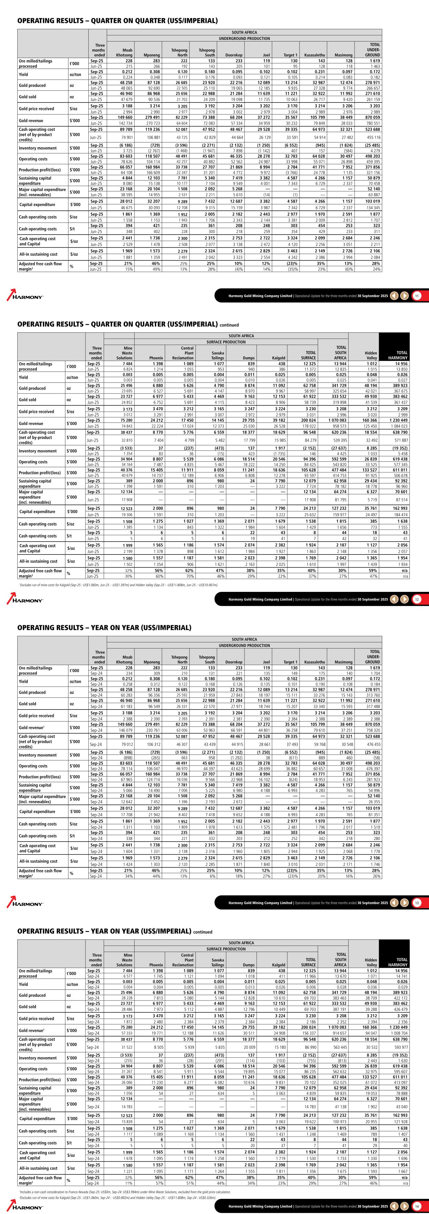 Harmony Gold Mining Company Limited | Operational Update for the three months ended 30 September 2025 11 Three months ended SOUTH AFRICA UNDERGROUND PRODUCTION Moab Khotsong Mponeng Tshepong North Tshepong South Doornkop Joel Target 1 Kusasalethu Masimong TOTAL UNDER- GROUND Ore milled/tailings processed t'000 Sep-25 228 283 222 133 233 119 130 143 128 1 619 Jun-25 215 266 192 143 205 101 95 128 118 1 463 Yield oz/ton Sep-25 0.212 0.308 0.120 0.180 0.095 0.102 0.102 0.231 0.097 0.172 Jun-25 0.224 0.348 0.117 0.176 0.093 0.121 0.105 0.214 0.083 0.182 Gold produced oz Sep-25 48 258 87 128 26 685 23 920 22 216 12 089 13 214 32 987 12 474 278 971 Jun-25 48 065 92 690 22 505 25 110 19 065 12 185 9 935 27 328 9 774 266 657 Gold sold oz Sep-25 46 940 86 968 25 656 22 988 21 284 11 639 11 221 32 922 11 992 271 610 Jun-25 47 679 90 536 21 702 24 209 19 098 11 735 10 063 26 717 9 420 261 159 Gold price received $/oz Sep-25 3 188 3 214 3 205 3 192 3 204 3 202 3 170 3 214 3 206 3 203 Jun-25 2 994 2 990 2 977 2 978 3 002 2 979 3 004 2 989 2 976 2 989 Gold revenue $'000 Sep-25 149 660 279 491 82 229 73 388 68 204 37 272 35 567 105 799 38 449 870 059 Jun-25 142 734 270 723 64 604 72 083 57 334 34 959 30 232 79 849 28 033 780 551 Cash operating cost (net of by-product credits) $'000 Sep-25 89 789 119 236 52 087 47 952 48 467 29 528 39 335 64 973 32 321 523 688 Jun-25 74 901 106 881 43 725 42 829 44 664 26 129 33 591 54 914 27 482 455 116 Inventory movement $'000 Sep-25 (6 186) (729) (3 596) (2 271) (2 132) (1 250) (6 552) (945) (1 824) (25 485) Jun-25 3 725 (2 767) (1 468) (1 947) 7 898 (1 142) 407 157 (584) 4 279 Operating costs $'000 Sep-25 83 603 118 507 48 491 45 681 46 335 28 278 32 783 64 028 30 497 498 203 Jun-25 78 626 104 114 42 257 40 882 52 562 24 987 33 998 55 071 26 898 459 395 Production profit/(loss) $'000 Sep-25 66 057 160 984 33 738 27 707 21 869 8 994 2 784 41 771 7 952 371 856 Jun-25 64 108 166 609 22 347 31 201 4 772 9 972 (3 766) 24 778 1 135 321 156 Sustaining capital expenditure $'000 Sep-25 4 844 12 103 7 781 5 340 7 419 3 382 4 587 4 266 1 157 50 879 Jun-25 8 080 15 138 10 177 7 104 9 549 4 001 7 343 6 729 2 337 70 458 Major capital expenditure (incl. renewables) $'000 Sep-25 23 168 20 104 1 508 2 092 5 268 — — — — 52 140 Jun-25 38 595 14 955 2 531 2 211 5 610 (14) (1) — — 63 887 Capital expenditure $'000 Sep-25 28 012 32 207 9 289 7 432 12 687 3 382 4 587 4 266 1 157 103 019 Jun-25 46 675 30 093 12 708 9 315 15 159 3 987 7 342 6 729 2 337 134 345 Cash operating costs $/oz Sep-25 1 861 1 369 1 952 2 005 2 182 2 443 2 977 1 970 2 591 1 877 Jun-25 1 558 1 153 1 943 1 706 2 343 2 144 3 381 2 009 2 812 1 707 Cash operating costs $/t Sep-25 394 421 235 361 208 248 303 454 253 323 Jun-25 348 402 228 300 218 259 354 429 233 311 Cash operating cost and Capital $/oz Sep-25 2 441 1 738 2 300 2 315 2 753 2 722 3 324 2 099 2 684 2 246 Jun-25 2 529 1 478 2 508 2 077 3 138 2 472 4 120 2 256 3 051 2 211 All-in sustaining cost $/oz Sep-25 1 969 1 573 2 279 2 324 2 615 2 829 3 463 2 149 2 726 2 106 Jun-25 1 881 1 359 2 491 2 042 3 323 2 554 4 242 2 386 2 994 2 084 Adjusted free cash flow margin¹ % Sep-25 21% 46% 25% 25% 10% 12% (23)% 35% 13% 28% Jun-25 15% 49% 13% 28% (4)% 14% (35)% 23% (6)% 24% OPERATING RESULTS – QUARTER ON QUARTER (US$/IMPERIAL) Harmony Gold Mining Company Limited | Operational Update for the three months ended 30 September 2025 12 OPERATING RESULTS – QUARTER ON QUARTER (US$/IMPERIAL) continued Three months ended SOUTH AFRICA Hidden Valley TOTAL HARMONY SURFACE PRODUCTION TOTAL SOUTH AFRICA Mine Waste Solutions Phoenix Central Plant Reclamation Savuka Tailings Dumps Kalgold TOTAL SURFACE Ore milled/tailings processed t'000 Sep-25 7 484 1 398 1 089 1 077 839 438 12 325 13 944 1 012 14 956 Jun-25 6 824 1 214 1 055 953 940 386 11 372 12 835 1 015 13 850 Yield oz/ton Sep-25 0.003 0.005 0.005 0.004 0.011 0.025 0.005 0.025 0.048 0.026 Jun-25 0.003 0.005 0.005 0.004 0.010 0.026 0.005 0.025 0.041 0.027 Gold produced oz Sep-25 25 496 6 880 5 626 4 790 8 874 11 092 62 758 341 729 48 194 389 923 Jun-25 23 695 6 527 5 691 4 147 8 970 9 967 58 997 325 654 42 021 367 675 Gold sold oz Sep-25 23 727 6 977 5 433 4 469 9 163 12 153 61 922 333 532 49 930 383 462 Jun-25 24 852 6 752 5 691 4 115 8 423 8 906 58 739 319 898 41 539 361 437 Gold price received $/oz Sep-25 3 173 3 470 3 212 3 165 3 247 3 224 3 230 3 208 3 212 3 209 Jun-25 3 012 3 291 2 991 3 007 2 972 2 979 3 031 2 996 3 020 2 999 Gold revenue $'000 Sep-25 75 280 24 212 17 450 14 145 29 755 39 182 200 024 1 070 083 160 366 1 230 449 Jun-25 74 843 22 224 17 024 12 373 25 030 26 528 178 022 958 573 125 450 1 084 023 Cash operating cost (net of by-product credits) $'000 Sep-25 38 437 8 770 5 776 6 559 18 377 18 629 96 548 620 236 18 554 638 790 Jun-25 32 810 7 404 4 799 5 482 17 799 15 985 84 279 539 395 32 492 571 887 Inventory movement $'000 Sep-25 (3 533) 37 (237) (473) 137 1 917 (2 152) (27 637) 8 285 (19 352) Jun-25 1 354 83 36 (15) 423 (1 735) 146 4 425 1 033 5 458 Operating costs $'000 Sep-25 34 904 8 807 5 539 6 086 18 514 20 546 94 396 592 599 26 839 619 438 Jun-25 34 164 7 487 4 835 5 467 18 222 14 250 84 425 543 820 33 525 577 345 Production profit/(loss) $'000 Sep-25 40 376 15 405 11 911 8 059 11 241 18 636 105 628 477 484 133 527 611 011 Jun-25 40 679 14 737 12 189 6 906 6 808 12 278 93 597 414 753 91 925 506 678 Sustaining capital expenditure $'000 Sep-25 389 2 000 896 980 24 7 790 12 079 62 958 29 434 92 392 Jun-25 1 398 1 591 310 1 203 — 3 222 7 724 78 182 18 7