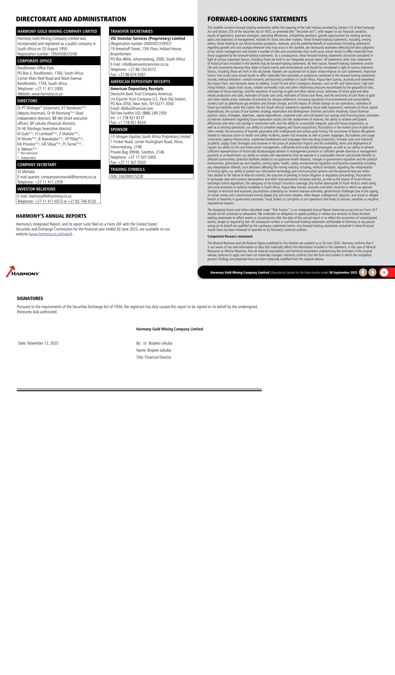 Harmony Gold Mining Company Limited | Operational Update for the three months ended 30 September 2025 15 HARMONY GOLD MINING COMPANY LIMITED Harmony Gold Mining Company Limited was incorporated and registered as a public company in South Africa on 25 August 1950 Registration number: 1950/038232/06 CORPORATE OFFICE Randfontein Office Park PO Box 2, Randfontein, 1760, South Africa Corner Main Reef Road and Ward Avenue Randfontein, 1759, South Africa Telephone: +27 11 411 2000 Website: www.harmony.co.za DIRECTORS Dr PT Motsepe* (chairman), KT Nondumo*^ (deputy chairman), Dr M Msimang*^ (lead independent director), BB Nel (chief executive officer), BP Lekubo (financial director), Dr HE Mashego (executive director) M Gule*^, FJ Lombard*^, Z Matlala*^, M Moshe*^, B Nqwababa*^, VP Pillay*^, MJ Prinsloo*^, GR Sibiya*^, PL Turner*^, JL Wetton*^ * Non-executive ^ Independent COMPANY SECRETARY SS Mohatla E-mail queries: companysecretariat@harmony.co.za Telephone: +27 11 411 2359 INVESTOR RELATIONS E-mail: HarmonyIR@harmony.co.za Telephone: +27 11 411 6073 or +27 82 746 4120 DIRECTORATE AND ADMINISTRATION TRANSFER SECRETARIES JSE Investor Services (Proprietary) Limited (Registration number 2000/007239/07) 19 Ameshoff Street, 13th Floor, Hollard House, Braamfontein PO Box 4844, Johannesburg, 2000, South Africa E-mail: info@jseinvestorservices.co.za Telephone: +27 86 154 6572 Fax: +27 86 674 4381 AMERICAN DEPOSITARY RECEIPTS American Depositary Receipts Deutsche Bank Trust Company Americas c/o Equiniti Trust Company LLC, Peck Slip Station, PO Box 2050, New York, NY10271-2050 Email: db@astfinancial.com Toll free (within US): (886) 249 2593 Int: +1 718 921 8137 Fax: +1 718 921 8334 SPONSOR J.P. Morgan Equities South Africa Proprietary Limited 1 Fricker Road, corner Hurlingham Road, Illovo, Johannesburg, 2196 Private Bag X9936, Sandton, 2146 Telephone: +27 11 507 0300 Fax: +27 11 507 0503 TRADING SYMBOLS ISIN: ZAE000015228 HARMONY’S ANNUAL REPORTS Harmony’s Integrated Report, and its report suite filed on a Form 20F with the United States’ Securities and Exchange Commission for the financial year ended 30 June 2025, are available on our website (www.harmony.co.za/invest). FORWARD-LOOKING STATEMENTS This booklet contains forward-looking statements within the meaning of the safe harbour provided by Section 21E of the Exchange Act and Section 27A of the Securities Act of 1933, as amended (the “Securities Act”), with respect to our financial condition, results of operations, business strategies, operating efficiencies, competitive positions, growth opportunities for existing services, plans and objectives of management, markets for stock and other matters. These forward-looking statements, including, among others, those relating to our future business prospects, revenues, and the potential benefit of acquisitions (including statements regarding growth and cost savings) wherever they may occur in this booklet, are necessarily estimates reflecting the best judgment of our senior management and involve a number of risks and uncertainties that could cause actual results to differ materially from those suggested by the forward-looking statements. As a consequence, these forward-looking statements should be considered in light of various important factors, including those set forth in our integrated annual report. All statements other than statements of historical facts included in this booklet may be forward-looking statements. By their nature, forward-looking statements involve risk and uncertainty because they relate to future events and circumstances and should be considered in light of various important factors, including those set forth in this disclaimer. Readers are cautioned not to place undue reliance on such statements. Important factors that could cause actual results to differ materially from estimates or projections contained in the forward-looking statements include, without limitation: overall economic and business conditions in South Africa, Papua New Guinea, Australia and elsewhere; the impact from, and measures taken to address, Covid-19 and other contagious diseases, such as HIV and tuberculosis; high and rising inflation, supply chain issues, volatile commodity costs and other inflationary pressures exacerbated by the geopolitical risks; estimates of future earnings, and the sensitivity of earnings to gold and other metals prices; estimates of future gold and other metals production and sales; estimates of future cash costs; estimates of future cash flows, and the sensitivity of cash flows to gold and other metals prices; estimates of provision for silicosis settlement; increasing regulation of environmental and sustainability matters such as greenhouse gas emission and climate change, and the impact of climate change on our operations; estimates of future tax liabilities under the Carbon Tax Act (South Africa); statements regarding future debt repayments; estimates of future capital expenditures; the success of our business strategy, exploration and development activities and other initiatives; future financial position, plans, strategies, objectives, capital expenditures, projected costs and anticipated cost savings and financing plans; estimates of reserves statements regarding future exploration results and the replacement of reserves; the ability to achieve anticipated efficiencies and other cost savings in connection with, and the ability to successfully integrate, past and future acquisitions, as well as at existing operations; our ability to complete ongoing and future acquisitions; fluctuations in the market price of gold and other metals; the occurrence of hazards associated with underground and surface gold mining; the occurrence of labour disruptions related to industrial action or health and safety incidents; power cost increases as well as power stoppages, fluctuations and usage constraints; ageing infrastructure, unplanned breakdowns and stoppages that 