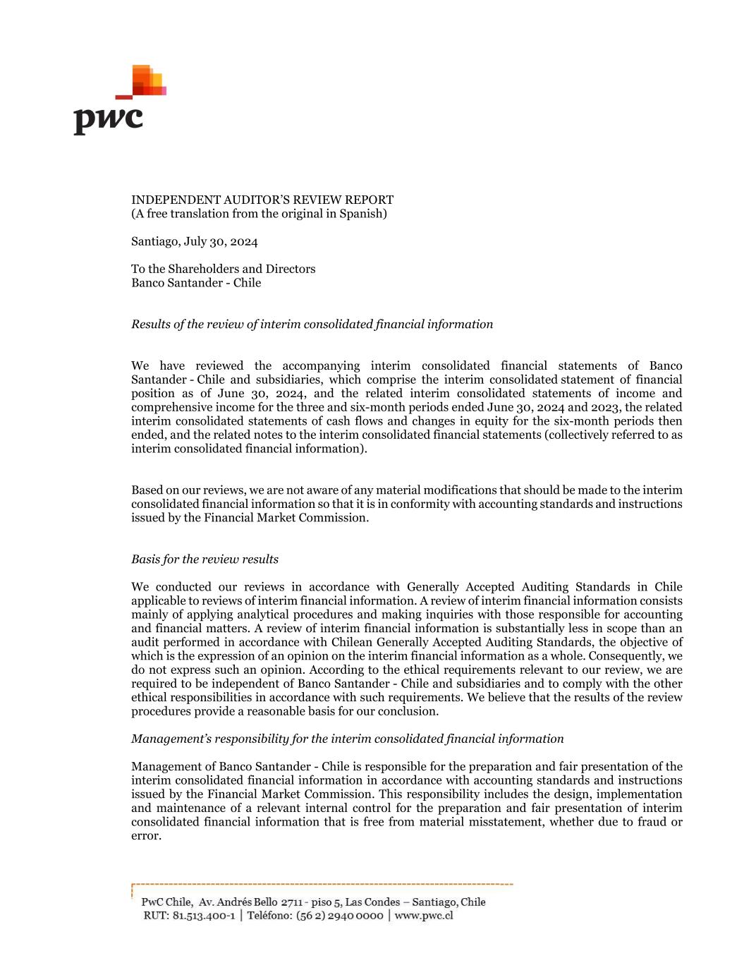 INDEPENDENT AUDITOR’S REVIEW REPORT (A free translation from the original in Spanish) Santiago, July 30, 2024 To the Shareholders and Directors Banco Santander - Chile Results of the review of interim consolidated financial information We have reviewed the accompanying interim consolidated financial statements of Banco Santander - Chile and subsidiaries, which comprise the interim consolidated statement of financial position as of June 30, 2024, and the related interim consolidated statements of income and comprehensive income for the three and six-month periods ended June 30, 2024 and 2023, the related interim consolidated statements of cash flows and changes in equity for the six-month periods then ended, and the related notes to the interim consolidated financial statements (collectively referred to as interim consolidated financial information). Based on our reviews, we are not aware of any material modifications that should be made to the interim consolidated financial information so that it is in conformity with accounting standards and instructions issued by the Financial Market Commission. Basis for the review results We conducted our reviews in accordance with Generally Accepted Auditing Standards in Chile applicable to reviews of interim financial information. A review of interim financial information consists mainly of applying analytical procedures and making inquiries with those responsible for accounting and financial matters. A review of interim financial information is substantially less in scope than an audit performed in accordance with Chilean Generally Accepted Auditing Standards, the objective of which is the expression of an opinion on the interim financial information as a whole. Consequently, we do not express such an opinion. According to the ethical requirements relevant to our review, we are required to be independent of Banco Santander - Chile and subsidiaries and to comply with the other ethical responsibilities in accordance with such requirements. We believe that the results of the review procedures provide a reasonable basis for our conclusion. Management’s responsibility for the interim consolidated financial information Management of Banco Santander - Chile is responsible for the preparation and fair presentation of the interim consolidated financial information in accordance with accounting standards and instructions issued by the Financial Market Commission. This responsibility includes the design, implementation and maintenance of a relevant internal control for the preparation and fair presentation of interim consolidated financial information that is free from material misstatement, whether due to fraud or error.