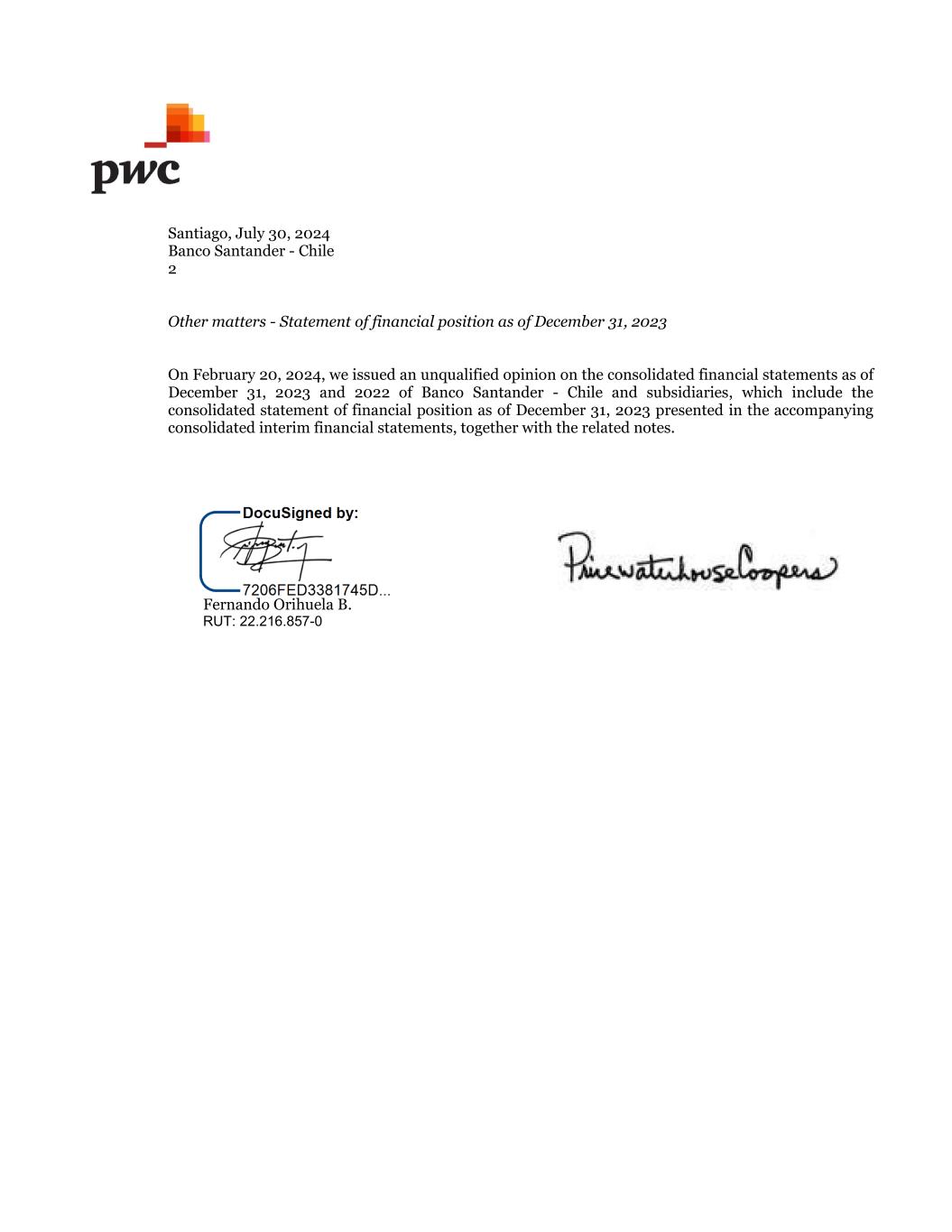 Santiago, July 30, 2024 Banco Santander - Chile 2 Other matters - Statement of financial position as of December 31, 2023 On February 20, 2024, we issued an unqualified opinion on the consolidated financial statements as of December 31, 2023 and 2022 of Banco Santander - Chile and subsidiaries, which include the consolidated statement of financial position as of December 31, 2023 presented in the accompanying consolidated interim financial statements, together with the related notes. Fernando Orihuela B. RUT: 22.216.857-0