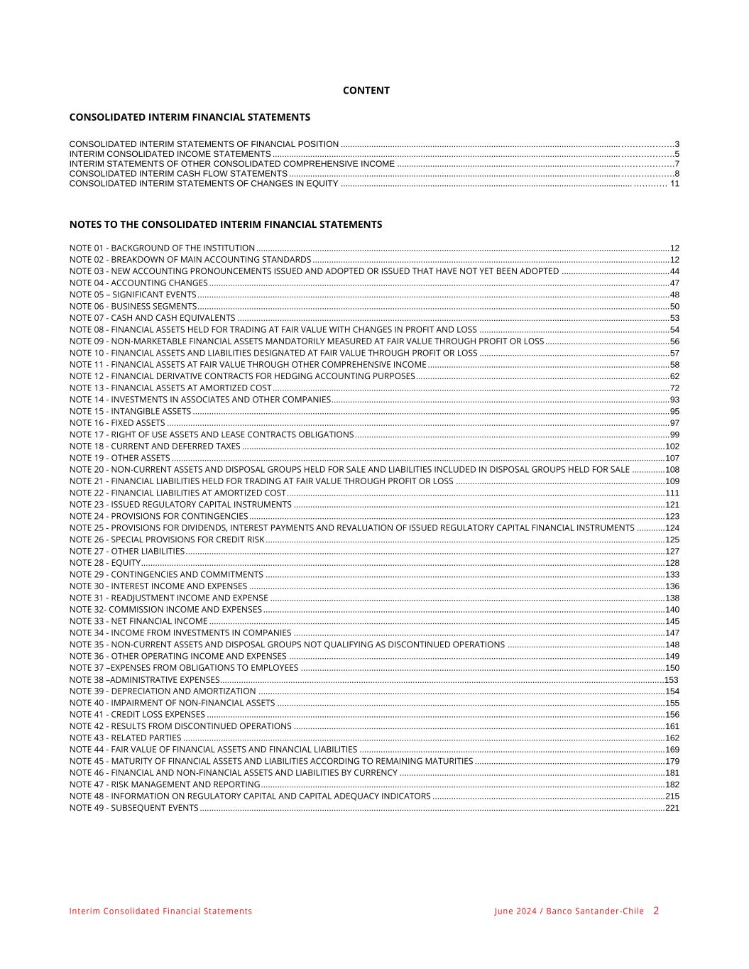 Interim Consolidated Financial Statements June 2024 / Banco Santander -Chile 2 CONTENT CONSOLIDATED INTERIM FINANCIAL STATEMENTS CONSOLIDATED INTERIM STATEMENTS OF FINANCIAL POSITION ....................................................................................................................... ……………….3 INTERIM CONSOLIDATED INCOME STATEMENTS .................................................................................................................................................... ……………….5 INTERIM STATEMENTS OF OTHER CONSOLIDATED COMPREHENSIVE INCOME ............................................................................................... ……………….7 CONSOLIDATED INTERIM CASH FLOW STATEMENTS ............................................................................................................................................. ……………….8 CONSOLIDATED INTERIM STATEMENTS OF CHANGES IN EQUITY ............................................................................................................................ ………… 11 NOTES TO THE CONSOLIDATED INTERIM FINANCIAL STATEMENTS NOTE 01 - BACKGROUND OF THE INSTITUTION ................................................................................................................................................................................ 12 NOTE 02 - BREAKDOWN OF MAIN ACCOUNTING STANDARDS ........................................................................................................................................................ 12 NOTE 03 - NEW ACCOUNTING PRONOUNCEMENTS ISSUED AND ADOPTED OR ISSUED THAT HAVE NOT YET BEEN ADOPTED .............................................. 44 NOTE 04 - ACCOUNTING CHANGES .................................................................................................................................................................................................... 47 NOTE 05 – SIGNIFICANT EVENTS ......................................................................................................................................................................................................... 48 NOTE 06 - BUSINESS SEGMENTS ......................................................................................................................................................................................................... 50 NOTE 07 - CASH AND CASH EQUIVALENTS ........................................................................................................................................................................................ 53 NOTE 08 - FINANCIAL ASSETS HELD FOR TRADING AT FAIR VALUE WITH CHANGES IN PROFIT AND LOSS ................................................................................. 54 NOTE 09 - NON-MARKETABLE FINANCIAL ASSETS MANDATORILY MEASURED AT FAIR VALUE THROUGH PROFIT OR LOSS ..................................................... 56 NOTE 10 - FINANCIAL ASSETS AND LIABILITIES DESIGNATED AT FAIR VALUE THROUGH PROFIT OR LOSS ................................................................................. 57 NOTE 11 - FINANCIAL ASSETS AT FAIR VALUE THROUGH OTHER COMPREHENSIVE INCOME ....................................................................................................... 58 NOTE 12 - FINANCIAL DERIVATIVE CONTRACTS FOR HEDGING ACCOUNTING PURPOSES ............................................................................................................ 62 NOTE 13 - FINANCIAL ASSETS AT AMORTIZED COST ......................................................................................................................................................................... 72 NOTE 14 - INVESTMENTS IN ASSOCIATES AND OTHER COMPANIES................................................................................................................................................ 93 NOTE 15 - INTANGIBLE ASSETS ........................................................................................................................................................................................................... 95 NOTE 16 - FIXED ASSETS ...................................................................................................................................................................................................................... 97 NOTE 17 - RIGHT OF USE ASSETS AND LEASE CONTRACTS OBLIGATIONS ...................................................................................................................................... 99 NOTE 18 - CURRENT AND DEFERRED TAXES .................................................................................................................................................................................... 102 NOTE 19 - OTHER ASSETS .................................................................................................................................................................................................................. 107 NOTE 20 - NON-CURRENT ASSETS AND DISPOSAL GROUPS HELD FOR SALE AND LIABILITIES INCLUDED IN DISPOSAL GROUPS HELD FOR SALE .............. 108 NOTE 21 - FINANCIAL LIABILITIES HELD FOR TRADING AT FAIR VALUE THROUGH PROFIT OR LOSS ......................................................................................... 109 NOTE 22 - FINANCIAL LIABILITIES AT AMORTIZED COST ................................................................................................................................................................. 111 NOTE 23 - ISSUED REGULATORY CAPITAL INSTRUMENTS .............................................................................................................................................................. 121 NOTE 24 - PROVISIONS FOR CONTINGENCIES ......................................................................................................................