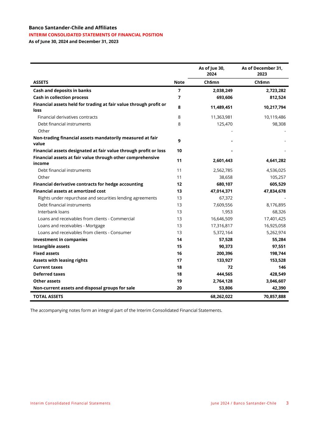 Interim Consolidated Financial Statements June 2024 / Banco Santander -Chile 3 Banco Santander-Chile and Affiliates INTERIM CONSOLIDATED STATEMENTS OF FINANCIAL POSITION As of June 30, 2024 and December 31, 2023 As of Jue 30, 2024 As of December 31, 2023 ASSETS Note Ch$mn Ch$mn Cash and deposits in banks 7 2,038,249 2,723,282 Cash in collection process 7 693,606 812,524 Financial assets held for trading at fair value through profit or loss 8 11,489,451 10,217,794 Financial derivatives contracts 8 11,363,981 10,119,486 Debt financial instruments 8 125,470 98,308 Other - - Non-trading financial assets mandatorily measured at fair value 9 - - Financial assets designated at fair value through profit or loss 10 - - Financial assets at fair value through other comprehensive income 11 2,601,443 4,641,282 Debt financial instruments 11 2,562,785 4,536,025 Other 11 38,658 105,257 Financial derivative contracts for hedge accounting 12 680,107 605,529 Financial assets at amortized cost 13 47,014,371 47,834,678 Rights under repurchase and securities lending agreements 13 67,372 - Debt financial instruments 13 7,609,556 8,176,895 Interbank loans 13 1,953 68,326 Loans and receivables from clients - Commercial 13 16,646,509 17,401,425 Loans and receivables - Mortgage 13 17,316,817 16,925,058 Loans and receivables from clients - Consumer 13 5,372,164 5,262,974 Investment in companies 14 57,528 55,284 Intangible assets 15 90,373 97,551 Fixed assets 16 200,396 198,744 Assets with leasing rights 17 133,927 153,528 Current taxes 18 72 146 Deferred taxes 18 444,565 428,549 Other assets 19 2,764,128 3,046,607 Non-current assets and disposal groups for sale 20 53,806 42,390 TOTAL ASSETS 68,262,022 70,857,888 The accompanying notes form an integral part of the Interim Consolidated Financial Statements.