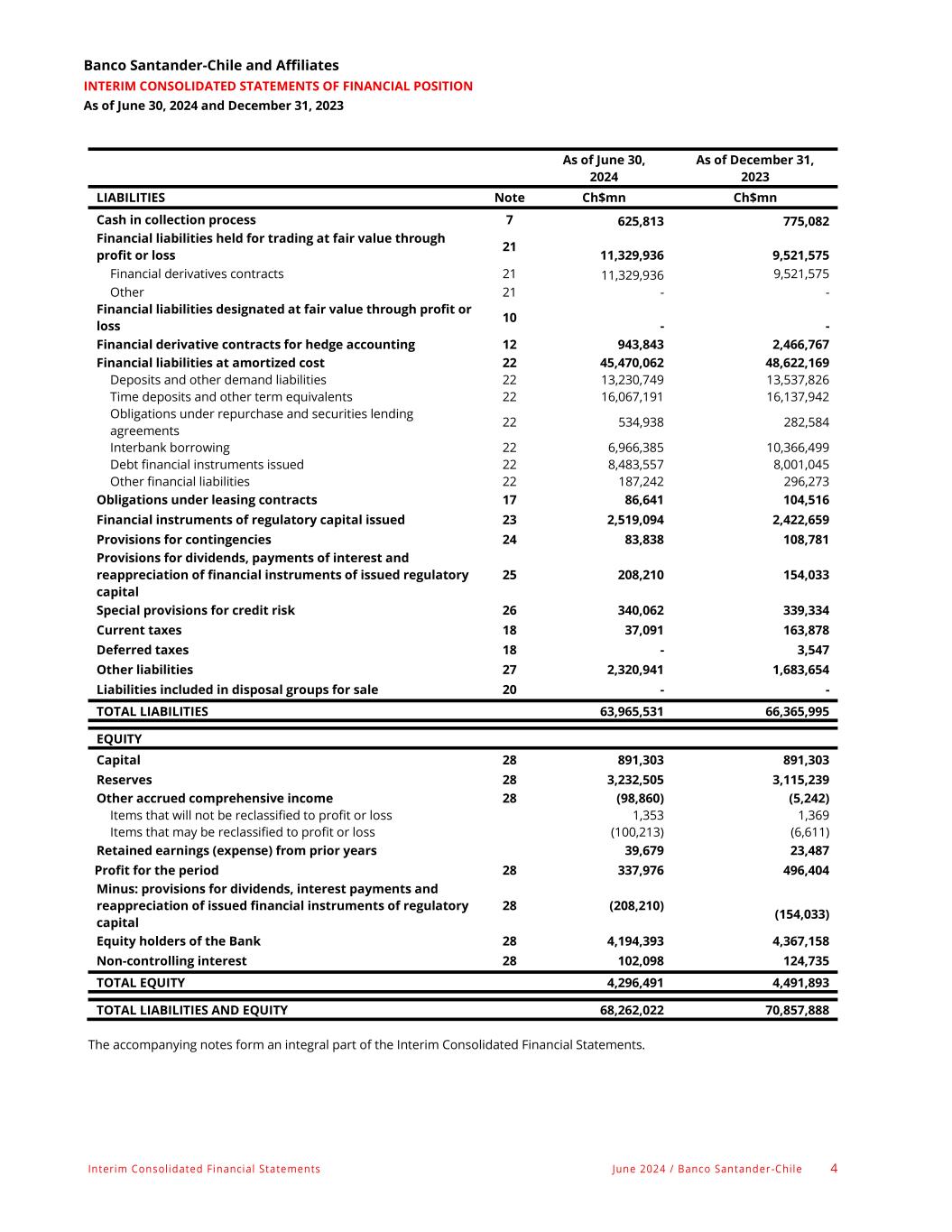 Interim Consolidated Financial Statements June 2024 / Banco Santander -Chile 4 Banco Santander-Chile and Affiliates INTERIM CONSOLIDATED STATEMENTS OF FINANCIAL POSITION As of June 30, 2024 and December 31, 2023 As of June 30, 2024 As of December 31, 2023 LIABILITIES Note Ch$mn Ch$mn Cash in collection process 7 625,813 775,082 Financial liabilities held for trading at fair value through profit or loss 21 11,329,936 9,521,575 Financial derivatives contracts 21 11,329,936 9,521,575 Other 21 - - Financial liabilities designated at fair value through profit or loss 10 - - Financial derivative contracts for hedge accounting 12 943,843 2,466,767 Financial liabilities at amortized cost 22 45,470,062 48,622,169 Deposits and other demand liabilities 22 13,230,749 13,537,826 Time deposits and other term equivalents 22 16,067,191 16,137,942 Obligations under repurchase and securities lending agreements 22 534,938 282,584 Interbank borrowing 22 6,966,385 10,366,499 Debt financial instruments issued 22 8,483,557 8,001,045 Other financial liabilities 22 187,242 296,273 Obligations under leasing contracts 17 86,641 104,516 Financial instruments of regulatory capital issued 23 2,519,094 2,422,659 Provisions for contingencies 24 83,838 108,781 Provisions for dividends, payments of interest and reappreciation of financial instruments of issued regulatory capital 25 208,210 154,033 Special provisions for credit risk 26 340,062 339,334 Current taxes 18 37,091 163,878 Deferred taxes 18 - 3,547 Other liabilities 27 2,320,941 1,683,654 Liabilities included in disposal groups for sale 20 - - TOTAL LIABILITIES 63,965,531 66,365,995 EQUITY Capital 28 891,303 891,303 Reserves 28 3,232,505 3,115,239 Other accrued comprehensive income 28 (98,860) (5,242) Items that will not be reclassified to profit or loss 1,353 1,369 Items that may be reclassified to profit or loss (100,213) (6,611) Retained earnings (expense) from prior years 39,679 23,487 Profit for the period 28 337,976 496,404 Minus: provisions for dividends, interest payments and reappreciation of issued financial instruments of regulatory capital 28 (208,210) (154,033) Equity holders of the Bank 28 4,194,393 4,367,158 Non-controlling interest 28 102,098 124,735 TOTAL EQUITY 4,296,491 4,491,893 TOTAL LIABILITIES AND EQUITY 68,262,022 70,857,888 The accompanying notes form an integral part of the Interim Consolidated Financial Statements.