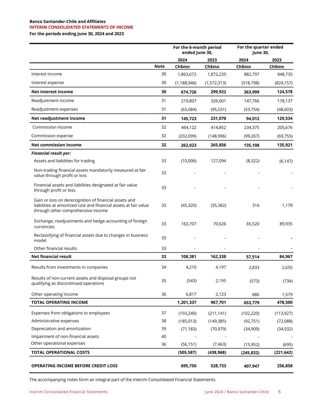 Interim Consolidated Financial Statements June 2024 / Banco Santander -Chile 5 Banco Santander-Chile and Affiliates INTERIM CONSOLIDATED STATEMENTS OF INCOME For the periods ending June 30, 2024 and 2023 For the 6-month period ended June 30, For the quarter ended June 30, 2024 2023 2024 2023 Note Ch$mn Ch$mn Ch$mn Ch$mn Interest income 30 1,863,672 1,872,235 882,797 948,735 Interest expense 30 (1,188,946) (1,572,313) (518,798) (824,157) Net interest income 30 674,726 299,922 363,999 124,578 Readjustment income 31 210,807 326,601 147,766 178,137 Readjustment expenses 31 (65,084) (95,531) (53,754) (48,603) Net readjustment income 31 145,723 231,070 94,012 129,534 Commission income 32 464,122 414,852 234,375 205,676 Commission expense 32 (202,099) (148,996) (99,267) (69,755) Net commission income 32 262,023 265,856 135,108 135,921 Financial result per: Assets and liabilities for trading 33 (10,006) 127,094 (8,322) (6,147) Non-trading financial assets mandatorily measured at fair value through profit or loss 33 - - - - Financial assets and liabilities designated at fair value through profit or loss 33 - - - - Gain or loss on derecognition of financial assets and liabilities at amortized cost and financial assets at fair value through other comprehensive income 33 (45,320) (35,382) 316 1,179 Exchange, readjustments and hedge accounting of foreign currencies 33 163,707 70,626 65,520 89,935 Reclassifying of financial assets due to changes in business model 33 - - - – Other financial results 33 - - - – Net financial result 33 108,381 162,338 57,514 84,967 Results from investments in companies 34 4,210 4,197 2,833 2,655 Results of non-current assets and disposal groups not qualifying as discontinued operations 35 (543) 2,195 (573) (734) Other operating income 36 6,817 2,123 886 1,579 TOTAL OPERATING INCOME 1,201,337 967,701 653,779 478,500 Expenses from obligations to employees 37 (193,240) (211,141) (102,220) (113,927) Administrative expenses 38 (185,013) (149,385) (92,751) (72,088) Depreciation and amortization 39 (71,183) (70,979) (34,909) (34,932) Impairment of non-financial assets 40 - - - - Other operational expenses 36 (56,151) (7,463) (15,952) (695) TOTAL OPERATIONAL COSTS (505,587) (438,968) (245,832) (221,642) OPERATING INCOME BEFORE CREDIT LOSS 695,750 528,733 407,947 256,858 The accompanying notes form an integral part of the Interim Consolidated Financial Statements.