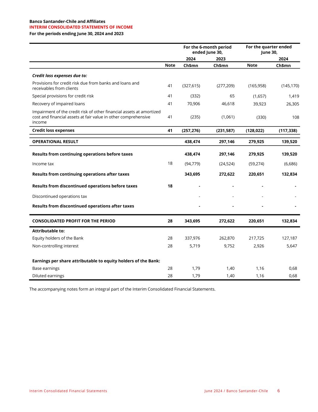 Interim Consolidated Financial Statements June 2024 / Banco Santander -Chile 6 Banco Santander-Chile and Affiliates INTERIM CONSOLIDATED STATEMENTS OF INCOME For the periods ending June 30, 2024 and 2023 For the 6-month period ended June 30, For the quarter ended June 30, 2024 2023 2024 Note Ch$mn Ch$mn Note Ch$mn Credit loss expenses due to: Provisions for credit risk due from banks and loans and receivables from clients 41 (327,615) (277,209) (165,958) (145,170) Special provisions for credit risk 41 (332) 65 (1,657) 1,419 Recovery of impaired loans 41 70,906 46,618 39,923 26,305 Impairment of the credit risk of other financial assets at amortized cost and financial assets at fair value in other comprehensive income 41 (235) (1,061) (330) 108 Credit loss expenses 41 (257,276) (231,587) (128,022) (117,338) OPERATIONAL RESULT 438,474 297,146 279,925 139,520 Results from continuing operations before taxes 438,474 297,146 279,925 139,520 Income tax 18 (94,779) (24,524) (59,274) (6,686) Results from continuing operations after taxes 343,695 272,622 220,651 132,834 Results from discontinued operations before taxes 18 - - - - Discontinued operations tax - - - - Results from discontinued operations after taxes - - - - CONSOLIDATED PROFIT FOR THE PERIOD 28 343,695 272,622 220,651 132,834 Attributable to: Equity holders of the Bank 28 337,976 262,870 217,725 127,187 Non-controlling interest 28 5,719 9,752 2,926 5,647 Earnings per share attributable to equity holders of the Bank: Base earnings 28 1,79 1,40 1,16 0,68 Diluted earnings 28 1,79 1,40 1,16 0,68 The accompanying notes form an integral part of the Interim Consolidated Financial Statements.