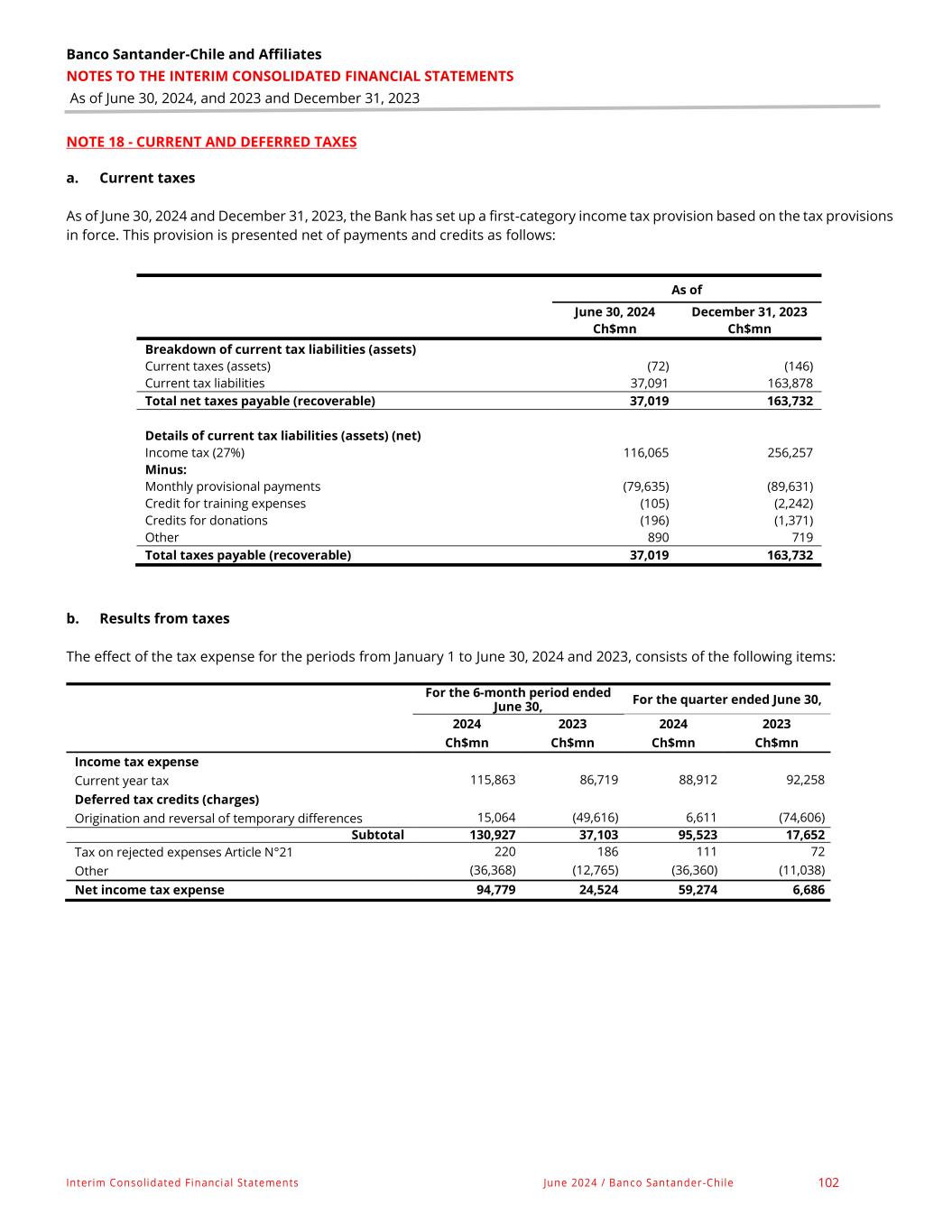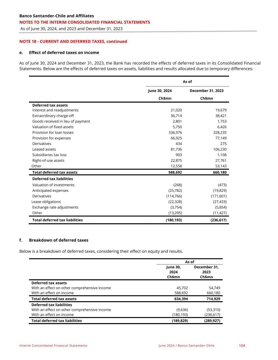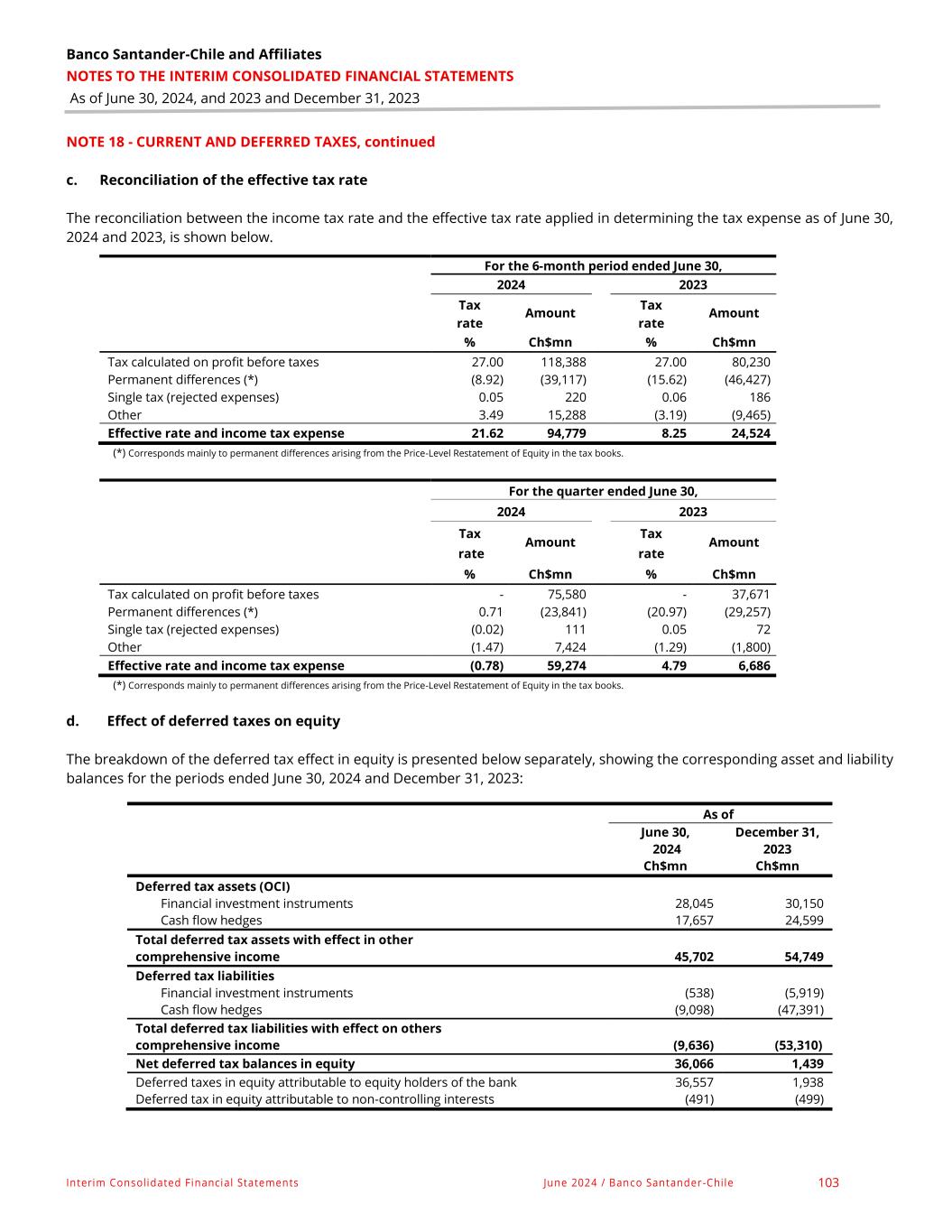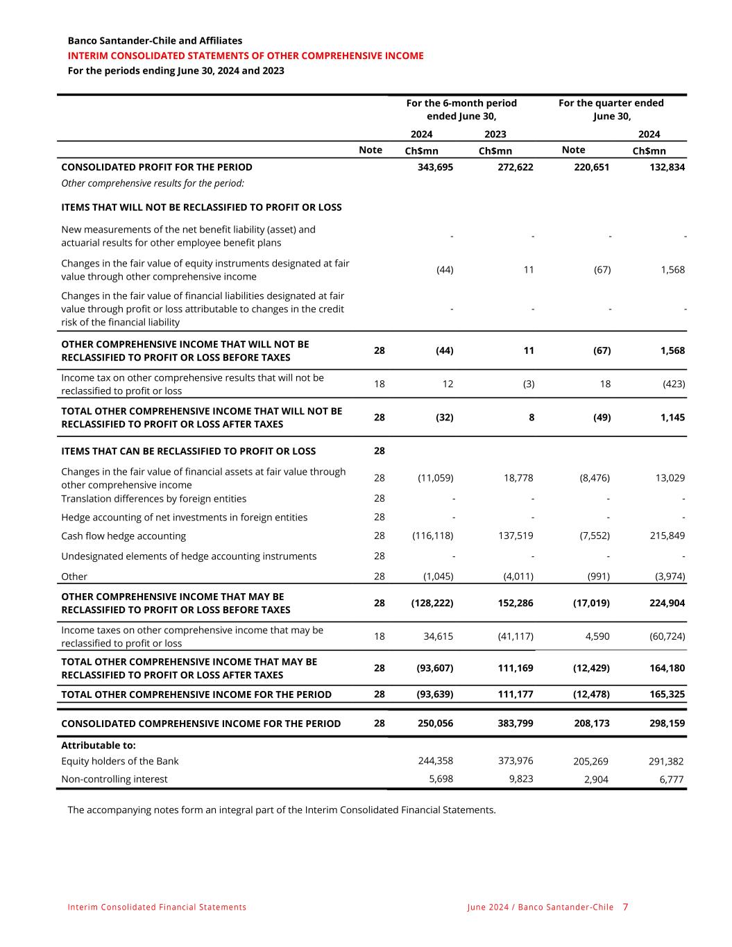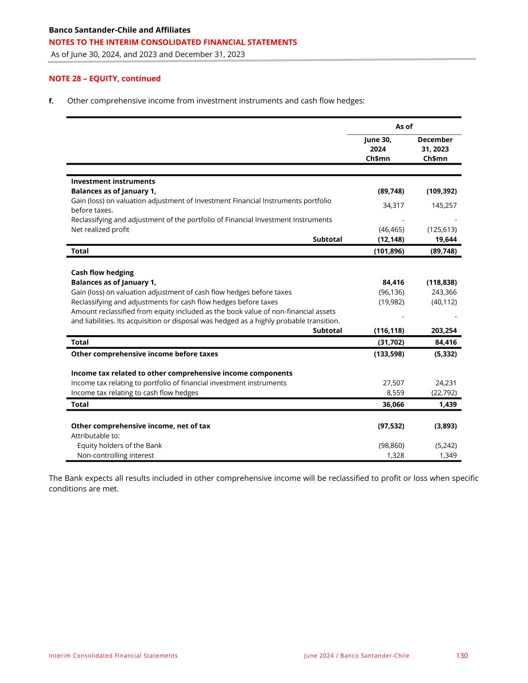 Banco Santander-Chile and Affiliates NOTES TO THE INTERIM CONSOLIDATED FINANCIAL STATEMENTS As of June 30, 2024, and 2023 and December 31, 2023 Interim Consolidated Financial Statements June 2024 / Banco Santander-Chile 130 NOTE 28 – EQUITY, continued f. Other comprehensive income from investment instruments and cash flow hedges: As of June 30, 2024 December 31, 2023 Ch$mn Ch$mn Investment instruments Balances as of January 1, (89,748) (109,392) Gain (loss) on valuation adjustment of Investment Financial Instruments portfolio before taxes. 34,317 145,257 Reclassifying and adjustment of the portfolio of Financial Investment Instruments - - Net realized profit (46,465) (125,613) Subtotal (12,148) 19,644 Total (101,896) (89,748) Cash flow hedging Balances as of January 1, 84,416 (118,838) Gain (loss) on valuation adjustment of cash flow hedges before taxes (96,136) 243,366 Reclassifying and adjustments for cash flow hedges before taxes (19,982) (40,112) Amount reclassified from equity included as the book value of non-financial assets and liabilities. Its acquisition or disposal was hedged as a highly probable transition. - - Subtotal (116,118) 203,254 Total (31,702) 84,416 Other comprehensive income before taxes (133,598) (5,332) Income tax related to other comprehensive income components Income tax relating to portfolio of financial investment instruments 27,507 24,231 Income tax relating to cash flow hedges 8,559 (22,792) Total 36,066 1,439 Other comprehensive income, net of tax (97,532) (3,893) Attributable to: Equity holders of the Bank (98,860) (5,242) Non-controlling interest 1,328 1,349 The Bank expects all results included in other comprehensive income will be reclassified to profit or loss when specific conditions are met.