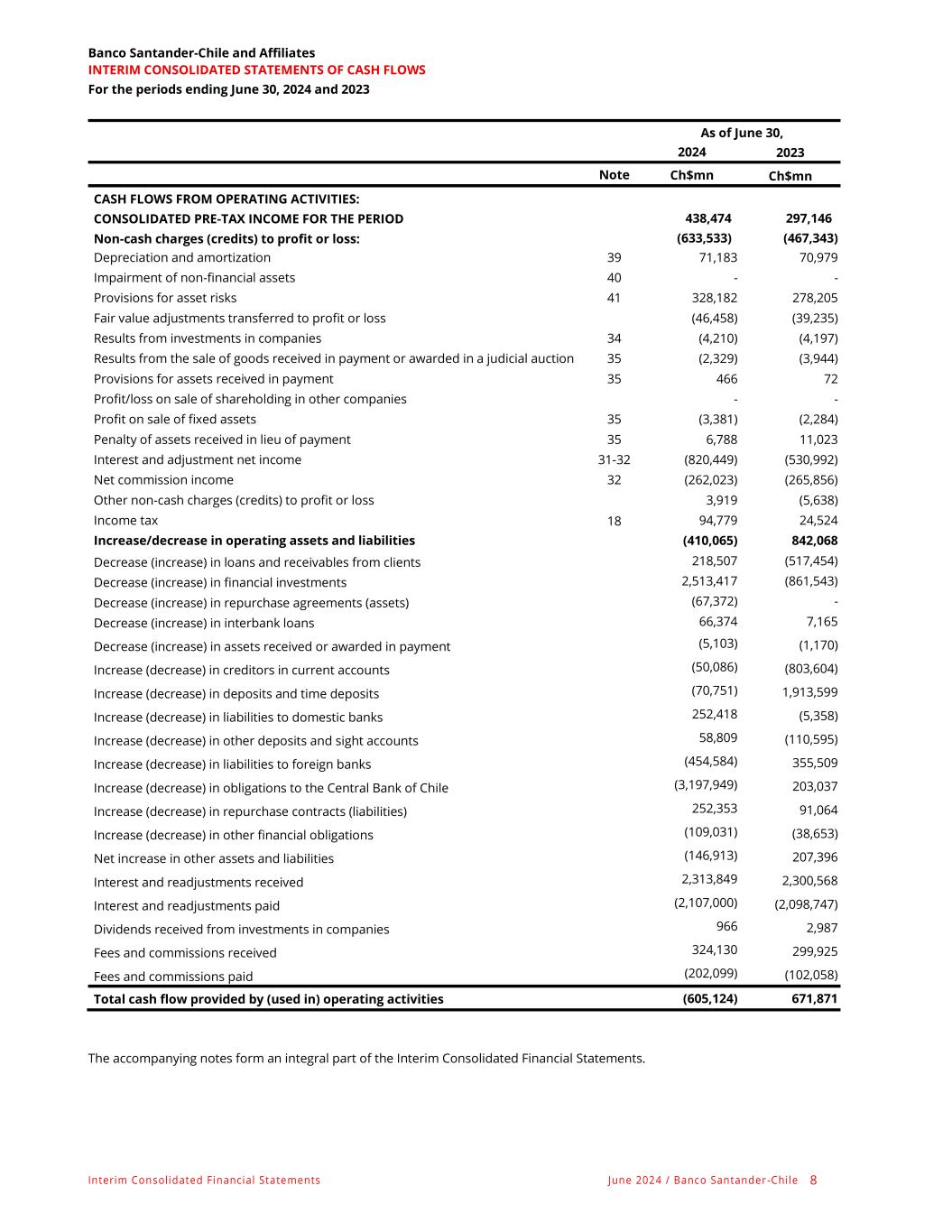 Interim Consolidated Financial Statements June 2024 / Banco Santander -Chile 8 Banco Santander-Chile and Affiliates INTERIM CONSOLIDATED STATEMENTS OF CASH FLOWS For the periods ending June 30, 2024 and 2023 As of June 30, 2024 2023 Note Ch$mn Ch$mn CASH FLOWS FROM OPERATING ACTIVITIES: CONSOLIDATED PRE-TAX INCOME FOR THE PERIOD 438,474 297,146 Non-cash charges (credits) to profit or loss: (633,533) (467,343) Depreciation and amortization 39 71,183 70,979 Impairment of non-financial assets 40 - - Provisions for asset risks 41 328,182 278,205 Fair value adjustments transferred to profit or loss (46,458) (39,235) Results from investments in companies 34 (4,210) (4,197) Results from the sale of goods received in payment or awarded in a judicial auction 35 (2,329) (3,944) Provisions for assets received in payment 35 466 72 Profit/loss on sale of shareholding in other companies - - Profit on sale of fixed assets 35 (3,381) (2,284) Penalty of assets received in lieu of payment 35 6,788 11,023 Interest and adjustment net income 31-32 (820,449) (530,992) Net commission income 32 (262,023) (265,856) Other non-cash charges (credits) to profit or loss 3,919 (5,638) Income tax 18 94,779 24,524 Increase/decrease in operating assets and liabilities (410,065) 842,068 Decrease (increase) in loans and receivables from clients 218,507 (517,454) Decrease (increase) in financial investments 2,513,417 (861,543) Decrease (increase) in repurchase agreements (assets) (67,372) - Decrease (increase) in interbank loans 66,374 7,165 Decrease (increase) in assets received or awarded in payment (5,103) (1,170) Increase (decrease) in creditors in current accounts (50,086) (803,604) Increase (decrease) in deposits and time deposits (70,751) 1,913,599 Increase (decrease) in liabilities to domestic banks 252,418 (5,358) Increase (decrease) in other deposits and sight accounts 58,809 (110,595) Increase (decrease) in liabilities to foreign banks (454,584) 355,509 Increase (decrease) in obligations to the Central Bank of Chile (3,197,949) 203,037 Increase (decrease) in repurchase contracts (liabilities) 252,353 91,064 Increase (decrease) in other financial obligations (109,031) (38,653) Net increase in other assets and liabilities (146,913) 207,396 Interest and readjustments received 2,313,849 2,300,568 Interest and readjustments paid (2,107,000) (2,098,747) Dividends received from investments in companies 966 2,987 Fees and commissions received 324,130 299,925 Fees and commissions paid (202,099) (102,058) Total cash flow provided by (used in) operating activities (605,124) 671,871 The accompanying notes form an integral part of the Interim Consolidated Financial Statements.