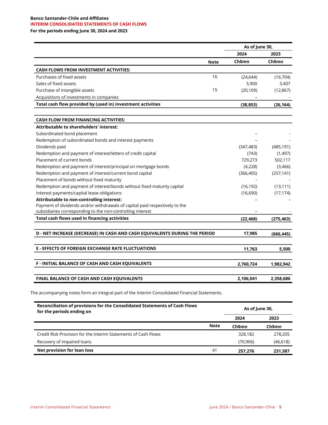 Interim Consolidated Financial Statements June 2024 / Banco Santander -Chile 9 Banco Santander-Chile and Affiliates INTERIM CONSOLIDATED STATEMENTS OF CASH FLOWS For the periods ending June 30, 2024 and 2023 As of June 30, 2024 2023 Note Ch$mn Ch$mn CASH FLOWS FROM INVESTMENT ACTIVITIES: Purchases of fixed assets 16 (24,644) (16,704) Sales of fixed assets 5,900 3,407 Purchase of intangible assets 15 (20,109) (12,867) Acquisitions of investments in companies – - Total cash flow provided by (used in) investment activities (38,853) (26,164) CASH FLOW FROM FINANCING ACTIVITIES: Attributable to shareholders' interest: Subordinated bond placement – - Redemption of subordinated bonds and interest payments – - Dividends paid (347,483) (485,191) Redemption and payment of interest/letters of credit capital (743) (1,497) Placement of current bonds 729,273 502,117 Redemption and payment of interest/principal on mortgage bonds (4,228) (3,466) Redemption and payment of interest/current bond capital (366,405) (257,141) Placement of bonds without fixed maturity - - Redemption and payment of interest/bonds without fixed maturity capital (16,192) (13,111) Interest payments/capital lease obligations (16,690) (17,174) Attributable to non-controlling interest: – - Payment of dividends and/or withdrawals of capital paid respectively to the subsidiaries corresponding to the non-controlling interest – - Total cash flows used in financing activities (22,468) (275,463) D - NET INCREASE (DECREASE) IN CASH AND CASH EQUIVALENTS DURING THE PERIOD 17,985 (666,445) E - EFFECTS OF FOREIGN EXCHANGE RATE FLUCTUATIONS 11,763 5,500 F - INITIAL BALANCE OF CASH AND CASH EQUIVALENTS 2,760,724 1,982,942 FINAL BALANCE OF CASH AND CASH EQUIVALENTS 2,106,041 2,358,686 The accompanying notes form an integral part of the Interim Consolidated Financial Statements. Reconciliation of provisions for the Consolidated Statements of Cash Flows for the periods ending on As of June 30, 2024 2023 Note Ch$mn Ch$mn Credit Risk Provision for the Interim Statements of Cash Flows 328,182 278,205 Recovery of impaired loans (70,906) (46,618) Net provision for loan loss 41 257,276 231,587
