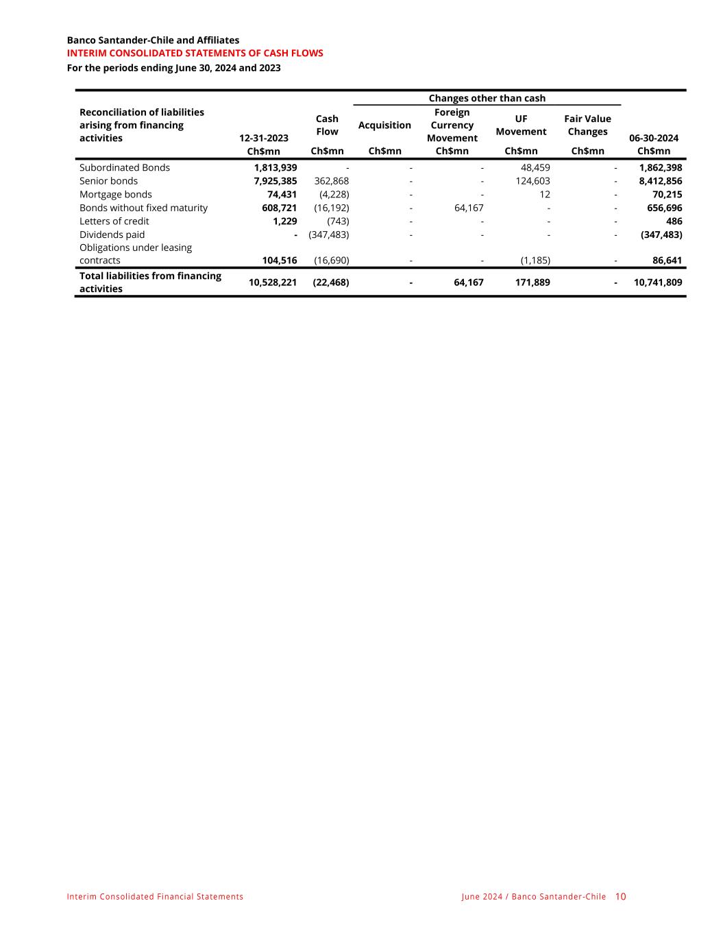 Interim Consolidated Financial Statements June 2024 / Banco Santander -Chile 10 Banco Santander-Chile and Affiliates INTERIM CONSOLIDATED STATEMENTS OF CASH FLOWS For the periods ending June 30, 2024 and 2023 Changes other than cash Reconciliation of liabilities arising from financing activities 12-31-2023 Cash Flow Acquisition Foreign Currency Movement UF Movement Fair Value Changes 06-30-2024 Ch$mn Ch$mn Ch$mn Ch$mn Ch$mn Ch$mn Ch$mn Subordinated Bonds 1,813,939 - - - 48,459 - 1,862,398 Senior bonds 7,925,385 362,868 - - 124,603 - 8,412,856 Mortgage bonds 74,431 (4,228) - - 12 - 70,215 Bonds without fixed maturity 608,721 (16,192) - 64,167 - - 656,696 Letters of credit 1,229 (743) - - - - 486 Dividends paid - (347,483) - - - - (347,483) Obligations under leasing contracts 104,516 (16,690) - - (1,185) - 86,641 Total liabilities from financing activities 10,528,221 (22,468) - 64,167 171,889 - 10,741,809