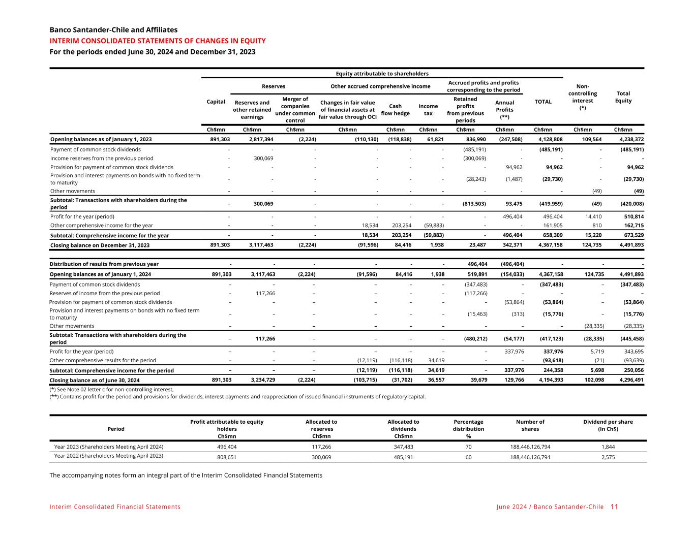 Interim Consolidated Financial Statements June 2024 / Banco Santander-Chile 11 Banco Santander-Chile and Affiliates INTERIM CONSOLIDATED STATEMENTS OF CHANGES IN EQUITY For the periods ended June 30, 2024 and December 31, 2023 Equity attributable to shareholders Non- controlling interest (*) Total Equity Capital Reserves Other accrued comprehensive income Accrued profits and profits corresponding to the period TOTAL Reserves and other retained earnings Merger of companies under common control Changes in fair value of financial assets at fair value through OCI Cash flow hedge Income tax Retained profits from previous periods Annual Profits (**) Ch$mn Ch$mn Ch$mn Ch$mn Ch$mn Ch$mn Ch$mn Ch$mn Ch$mn Ch$mn Ch$mn Opening balances as of January 1, 2023 891,303 2,817,394 (2,224) (110,130) (118,838) 61,821 836,990 (247,508) 4,128,808 109,564 4,238,372 Payment of common stock dividends - - - - - - (485,191) - (485,191) - (485,191) Income reserves from the previous period - 300,069 - - - - (300,069) - - - - Provision for payment of common stock dividends - - - - - - - 94,962 94,962 - 94,962 Provision and interest payments on bonds with no fixed term to maturity - - - - - - (28,243) (1,487) (29,730) - (29,730) Other movements - - - - - - - - - (49) (49) Subtotal: Transactions with shareholders during the period - 300,069 - - - - (813,503) 93,475 (419,959) (49) (420,008) Profit for the year (period) - - - - - - - 496,404 496,404 14,410 510,814 Other comprehensive income for the year - - - 18,534 203,254 (59,883) - - 161,905 810 162,715 Subtotal: Comprehensive income for the year - - - 18,534 203,254 (59,883) - 496,404 658,309 15,220 673,529 Closing balance on December 31, 2023 891,303 3,117,463 (2,224) (91,596) 84,416 1,938 23,487 342,371 4,367,158 124,735 4,491,893 Distribution of results from previous year - - - - - - 496,404 (496,404) - - - Opening balances as of January 1, 2024 891,303 3,117,463 (2,224) (91,596) 84,416 1,938 519,891 (154,033) 4,367,158 124,735 4,491,893 Payment of common stock dividends – – – – – – (347,483) – (347,483) – (347,483) Reserves of income from the previous period – 117,266 – – – – (117,266) – – – – Provision for payment of common stock dividends – – – – – – – (53,864) (53,864) – (53,864) Provision and interest payments on bonds with no fixed term to maturity – – – – – – (15,463) (313) (15,776) – (15,776) Other movements – – – – – – – – – (28,335) (28,335) Subtotal: Transactions with shareholders during the period – 117,266 – – – – (480,212) (54,177) (417,123) (28,335) (445,458) Profit for the year (period) – – – – – – – 337,976 337,976 5,719 343,695 Other comprehensive results for the period – – – (12,119) (116,118) 34,619 – – (93,618) (21) (93,639) Subtotal: Comprehensive income for the period – – – (12,119) (116,118) 34,619 – 337,976 244,358 5,698 250,056 Closing balance as of June 30, 2024 891,303 3,234,729 (2,224) (103,715) (31,702) 36,557 39,679 129,766 4,194,393 102,098 4,296,491 (*) See Note 02 letter c for non-controlling interest, (**) Contains profit for the period and provisions for dividends, interest payments and reappreciation of issued financial instruments of regulatory capital. Period Profit attributable to equity holders Allocated to reserves Allocated to dividends Percentage distribution Number of shares Dividend per share (In Ch$) Ch$mn Ch$mn Ch$mn % Year 2023 (Shareholders Meeting April 2024) 496,404 117,266 347,483 70 188,446,126,794 1,844 Year 2022 (Shareholders Meeting April 2023) 808,651 300,069 485,191 60 188,446,126,794 2,575 The accompanying notes form an integral part of the Interim Consolidated Financial Statements