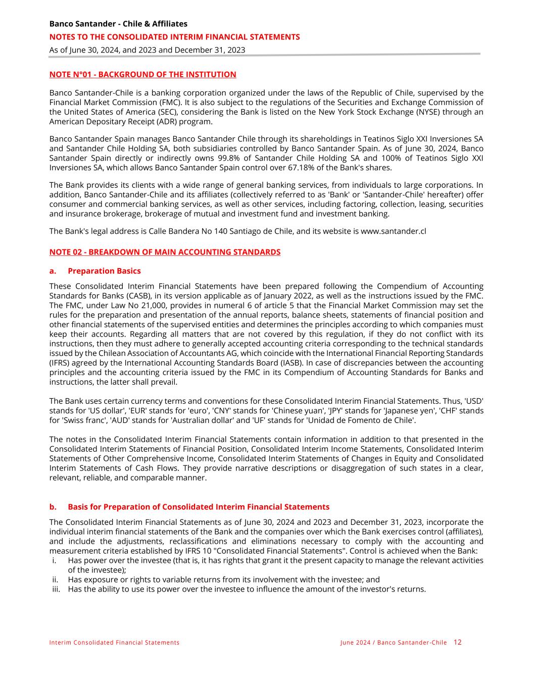 Banco Santander - Chile & Affiliates NOTES TO THE CONSOLIDATED INTERIM FINANCIAL STATEMENTS As of June 30, 2024, and 2023 and December 31, 2023 Interim Consolidated Financial Statements June 2024 / Banco Santander -Chile 12 NOTE N°01 - BACKGROUND OF THE INSTITUTION Banco Santander-Chile is a banking corporation organized under the laws of the Republic of Chile, supervised by the Financial Market Commission (FMC). It is also subject to the regulations of the Securities and Exchange Commission of the United States of America (SEC), considering the Bank is listed on the New York Stock Exchange (NYSE) through an American Depositary Receipt (ADR) program. Banco Santander Spain manages Banco Santander Chile through its shareholdings in Teatinos Siglo XXI Inversiones SA and Santander Chile Holding SA, both subsidiaries controlled by Banco Santander Spain. As of June 30, 2024, Banco Santander Spain directly or indirectly owns 99.8% of Santander Chile Holding SA and 100% of Teatinos Siglo XXI Inversiones SA, which allows Banco Santander Spain control over 67.18% of the Bank's shares. The Bank provides its clients with a wide range of general banking services, from individuals to large corporations. In addition, Banco Santander-Chile and its affiliates (collectively referred to as 'Bank' or 'Santander-Chile' hereafter) offer consumer and commercial banking services, as well as other services, including factoring, collection, leasing, securities and insurance brokerage, brokerage of mutual and investment fund and investment banking. The Bank's legal address is Calle Bandera No 140 Santiago de Chile, and its website is www.santander.cl NOTE 02 - BREAKDOWN OF MAIN ACCOUNTING STANDARDS a. Preparation Basics These Consolidated Interim Financial Statements have been prepared following the Compendium of Accounting Standards for Banks (CASB), in its version applicable as of January 2022, as well as the instructions issued by the FMC. The FMC, under Law No 21,000, provides in numeral 6 of article 5 that the Financial Market Commission may set the rules for the preparation and presentation of the annual reports, balance sheets, statements of financial position and other financial statements of the supervised entities and determines the principles according to which companies must keep their accounts. Regarding all matters that are not covered by this regulation, if they do not conflict with its instructions, then they must adhere to generally accepted accounting criteria corresponding to the technical standards issued by the Chilean Association of Accountants AG, which coincide with the International Financial Reporting Standards (IFRS) agreed by the International Accounting Standards Board (IASB). In case of discrepancies between the accounting principles and the accounting criteria issued by the FMC in its Compendium of Accounting Standards for Banks and instructions, the latter shall prevail. The Bank uses certain currency terms and conventions for these Consolidated Interim Financial Statements. Thus, 'USD' stands for 'US dollar', 'EUR' stands for 'euro', 'CNY' stands for 'Chinese yuan', 'JPY' stands for 'Japanese yen', 'CHF' stands for 'Swiss franc', 'AUD' stands for 'Australian dollar' and 'UF' stands for 'Unidad de Fomento de Chile'. The notes in the Consolidated Interim Financial Statements contain information in addition to that presented in the Consolidated Interim Statements of Financial Position, Consolidated Interim Income Statements, Consolidated Interim Statements of Other Comprehensive Income, Consolidated Interim Statements of Changes in Equity and Consolidated Interim Statements of Cash Flows. They provide narrative descriptions or disaggregation of such states in a clear, relevant, reliable, and comparable manner. b. Basis for Preparation of Consolidated Interim Financial Statements The Consolidated Interim Financial Statements as of June 30, 2024 and 2023 and December 31, 2023, incorporate the individual interim financial statements of the Bank and the companies over which the Bank exercises control (affiliates), and include the adjustments, reclassifications and eliminations necessary to comply with the accounting and measurement criteria established by IFRS 10 "Consolidated Financial Statements". Control is achieved when the Bank: i. Has power over the investee (that is, it has rights that grant it the present capacity to manage the relevant activities of the investee); ii. Has exposure or rights to variable returns from its involvement with the investee; and iii. Has the ability to use its power over the investee to influence the amount of the investor's returns.