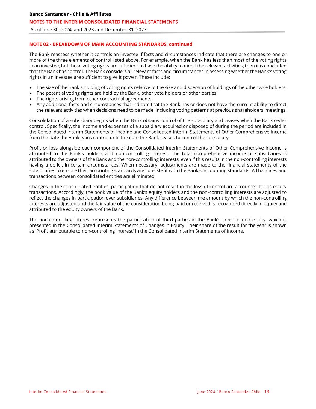 Banco Santander - Chile & Affiliates NOTES TO THE INTERIM CONSOLIDATED FINANCIAL STATEMENTS As of June 30, 2024, and 2023 and December 31, 2023 Interim Consolidated Financial Statements June 2024 / Banco Santander -Chile 13 NOTE 02 - BREAKDOWN OF MAIN ACCOUNTING STANDARDS, continued The Bank reassess whether it controls an investee if facts and circumstances indicate that there are changes to one or more of the three elements of control listed above. For example, when the Bank has less than most of the voting rights in an investee, but those voting rights are sufficient to have the ability to direct the relevant activities, then it is concluded that the Bank has control. The Bank considers all relevant facts and circumstances in assessing whether the Bank's voting rights in an investee are sufficient to give it power. These include: • The size of the Bank's holding of voting rights relative to the size and dispersion of holdings of the other vote holders. • The potential voting rights are held by the Bank, other vote holders or other parties. • The rights arising from other contractual agreements. • Any additional facts and circumstances that indicate that the Bank has or does not have the current ability to direct the relevant activities when decisions need to be made, including voting patterns at previous shareholders' meetings. Consolidation of a subsidiary begins when the Bank obtains control of the subsidiary and ceases when the Bank cedes control. Specifically, the income and expenses of a subsidiary acquired or disposed of during the period are included in the Consolidated Interim Statements of Income and Consolidated Interim Statements of Other Comprehensive Income from the date the Bank gains control until the date the Bank ceases to control the subsidiary. Profit or loss alongside each component of the Consolidated Interim Statements of Other Comprehensive Income is attributed to the Bank's holders and non-controlling interest. The total comprehensive income of subsidiaries is attributed to the owners of the Bank and the non-controlling interests, even if this results in the non-controlling interests having a deficit in certain circumstances. When necessary, adjustments are made to the financial statements of the subsidiaries to ensure their accounting standards are consistent with the Bank's accounting standards. All balances and transactions between consolidated entities are eliminated. Changes in the consolidated entities' participation that do not result in the loss of control are accounted for as equity transactions. Accordingly, the book value of the Bank’s equity holders and the non-controlling interests are adjusted to reflect the changes in participation over subsidiaries. Any difference between the amount by which the non-controlling interests are adjusted and the fair value of the consideration being paid or received is recognized directly in equity and attributed to the equity owners of the Bank. The non-controlling interest represents the participation of third parties in the Bank's consolidated equity, which is presented in the Consolidated Interim Statements of Changes in Equity. Their share of the result for the year is shown as 'Profit attributable to non-controlling interest' in the Consolidated Interim Statements of Income.