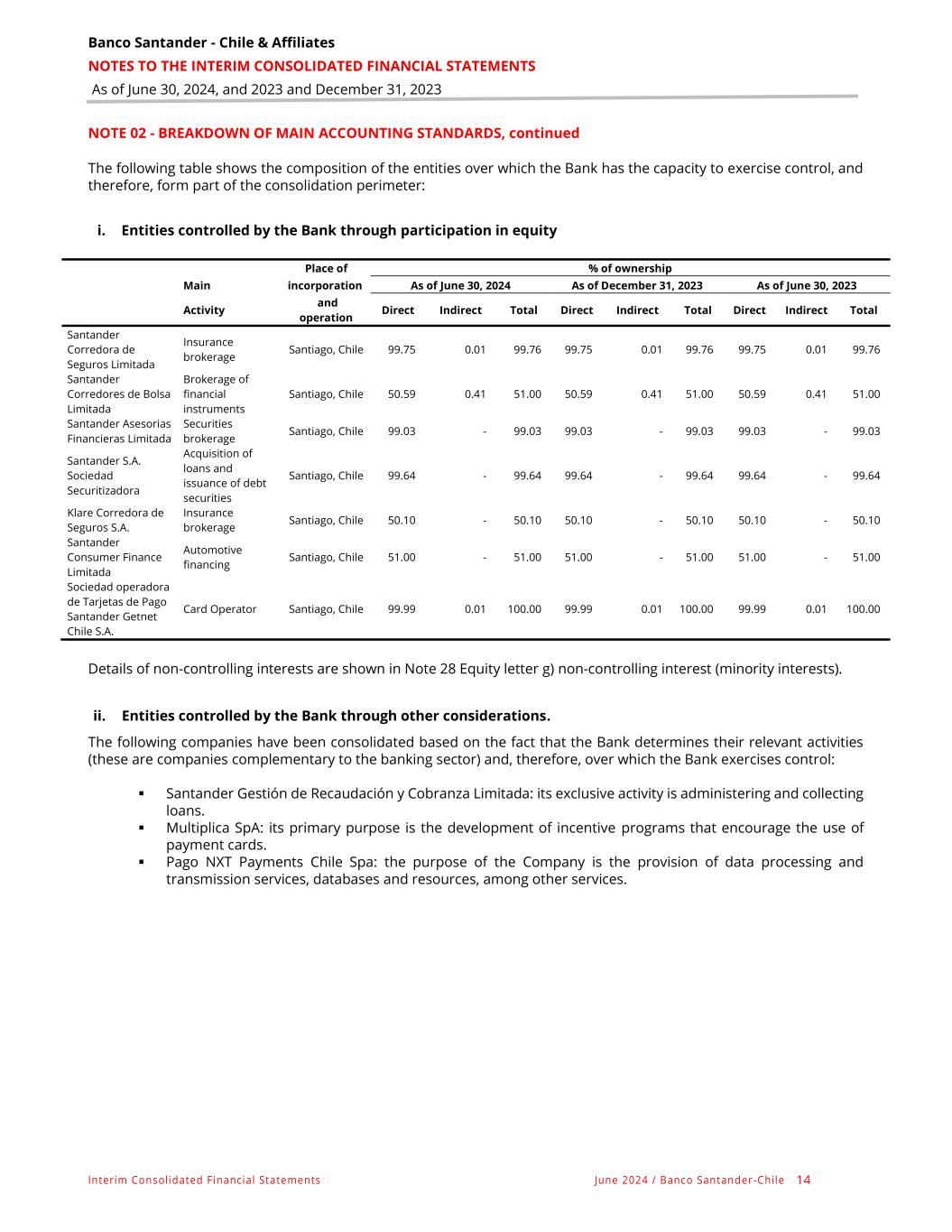 Banco Santander - Chile & Affiliates NOTES TO THE INTERIM CONSOLIDATED FINANCIAL STATEMENTS As of June 30, 2024, and 2023 and December 31, 2023 Interim Consolidated Financial Statements June 2024 / Banco Santander -Chile 14 NOTE 02 - BREAKDOWN OF MAIN ACCOUNTING STANDARDS, continued The following table shows the composition of the entities over which the Bank has the capacity to exercise control, and therefore, form part of the consolidation perimeter: i. Entities controlled by the Bank through participation in equity Place of % of ownership Main incorporation As of June 30, 2024 As of December 31, 2023 As of June 30, 2023 Activity and operation Direct Indirect Total Direct Indirect Total Direct Indirect Total Santander Corredora de Seguros Limitada Insurance brokerage Santiago, Chile 99.75 0.01 99.76 99.75 0.01 99.76 99.75 0.01 99.76 Santander Corredores de Bolsa Limitada Brokerage of financial instruments Santiago, Chile 50.59 0.41 51.00 50.59 0.41 51.00 50.59 0.41 51.00 Santander Asesorias Financieras Limitada Securities brokerage Santiago, Chile 99.03 - 99.03 99.03 - 99.03 99.03 - 99.03 Santander S.A. Sociedad Securitizadora Acquisition of loans and issuance of debt securities Santiago, Chile 99.64 - 99.64 99.64 - 99.64 99.64 - 99.64 Klare Corredora de Seguros S.A. Insurance brokerage Santiago, Chile 50.10 - 50.10 50.10 - 50.10 50.10 - 50.10 Santander Consumer Finance Limitada Automotive financing Santiago, Chile 51.00 - 51.00 51.00 - 51.00 51.00 - 51.00 Sociedad operadora de Tarjetas de Pago Santander Getnet Chile S.A. Card Operator Santiago, Chile 99.99 0.01 100.00 99.99 0.01 100.00 99.99 0.01 100.00 Details of non-controlling interests are shown in Note 28 Equity letter g) non-controlling interest (minority interests). ii. Entities controlled by the Bank through other considerations. The following companies have been consolidated based on the fact that the Bank determines their relevant activities (these are companies complementary to the banking sector) and, therefore, over which the Bank exercises control: ▪ Santander Gestión de Recaudación y Cobranza Limitada: its exclusive activity is administering and collecting loans. ▪ Multiplica SpA: its primary purpose is the development of incentive programs that encourage the use of payment cards. ▪ Pago NXT Payments Chile Spa: the purpose of the Company is the provision of data processing and transmission services, databases and resources, among other services.