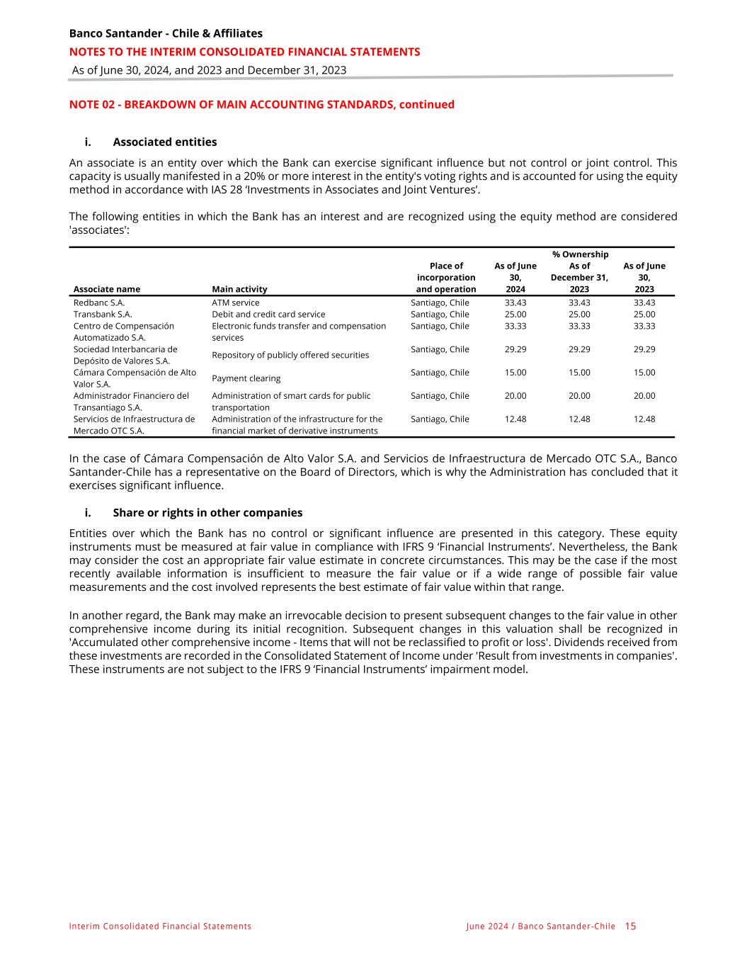 Banco Santander - Chile & Affiliates NOTES TO THE INTERIM CONSOLIDATED FINANCIAL STATEMENTS As of June 30, 2024, and 2023 and December 31, 2023 Interim Consolidated Financial Statements June 2024 / Banco Santander -Chile 15 NOTE 02 - BREAKDOWN OF MAIN ACCOUNTING STANDARDS, continued i. Associated entities An associate is an entity over which the Bank can exercise significant influence but not control or joint control. This capacity is usually manifested in a 20% or more interest in the entity's voting rights and is accounted for using the equity method in accordance with IAS 28 ‘Investments in Associates and Joint Ventures’. The following entities in which the Bank has an interest and are recognized using the equity method are considered 'associates': % Ownership Place of incorporation As of June 30, As of December 31, As of June 30, Associate name Main activity and operation 2024 2023 2023 Redbanc S.A. ATM service Santiago, Chile 33.43 33.43 33.43 Transbank S.A. Debit and credit card service Santiago, Chile 25.00 25.00 25.00 Centro de Compensación Automatizado S.A. Electronic funds transfer and compensation services Santiago, Chile 33.33 33.33 33.33 Sociedad Interbancaria de Depósito de Valores S.A. Repository of publicly offered securities Santiago, Chile 29.29 29.29 29.29 Cámara Compensación de Alto Valor S.A. Payment clearing Santiago, Chile 15.00 15.00 15.00 Administrador Financiero del Transantiago S.A. Administration of smart cards for public transportation Santiago, Chile 20.00 20.00 20.00 Servicios de Infraestructura de Mercado OTC S.A. Administration of the infrastructure for the financial market of derivative instruments Santiago, Chile 12.48 12.48 12.48 In the case of Cámara Compensación de Alto Valor S.A. and Servicios de Infraestructura de Mercado OTC S.A., Banco Santander-Chile has a representative on the Board of Directors, which is why the Administration has concluded that it exercises significant influence. i. Share or rights in other companies Entities over which the Bank has no control or significant influence are presented in this category. These equity instruments must be measured at fair value in compliance with IFRS 9 ‘Financial Instruments’. Nevertheless, the Bank may consider the cost an appropriate fair value estimate in concrete circumstances. This may be the case if the most recently available information is insufficient to measure the fair value or if a wide range of possible fair value measurements and the cost involved represents the best estimate of fair value within that range. In another regard, the Bank may make an irrevocable decision to present subsequent changes to the fair value in other comprehensive income during its initial recognition. Subsequent changes in this valuation shall be recognized in 'Accumulated other comprehensive income - Items that will not be reclassified to profit or loss'. Dividends received from these investments are recorded in the Consolidated Statement of Income under 'Result from investments in companies'. These instruments are not subject to the IFRS 9 ‘Financial Instruments’ impairment model.
