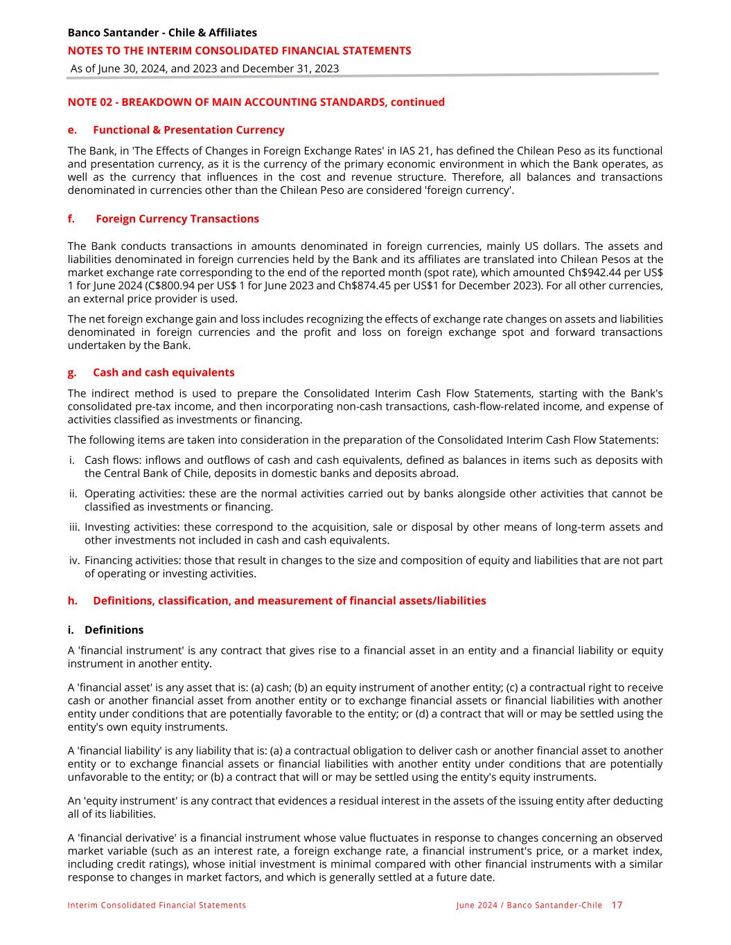 Banco Santander - Chile & Affiliates NOTES TO THE INTERIM CONSOLIDATED FINANCIAL STATEMENTS As of June 30, 2024, and 2023 and December 31, 2023 Interim Consolidated Financial Statements June 2024 / Banco Santander -Chile 17 NOTE 02 - BREAKDOWN OF MAIN ACCOUNTING STANDARDS, continued e. Functional & Presentation Currency The Bank, in 'The Effects of Changes in Foreign Exchange Rates' in IAS 21, has defined the Chilean Peso as its functional and presentation currency, as it is the currency of the primary economic environment in which the Bank operates, as well as the currency that influences in the cost and revenue structure. Therefore, all balances and transactions denominated in currencies other than the Chilean Peso are considered 'foreign currency'. f. Foreign Currency Transactions The Bank conducts transactions in amounts denominated in foreign currencies, mainly US dollars. The assets and liabilities denominated in foreign currencies held by the Bank and its affiliates are translated into Chilean Pesos at the market exchange rate corresponding to the end of the reported month (spot rate), which amounted Ch$942.44 per US$ 1 for June 2024 (C$800.94 per US$ 1 for June 2023 and Ch$874.45 per US$1 for December 2023). For all other currencies, an external price provider is used. The net foreign exchange gain and loss includes recognizing the effects of exchange rate changes on assets and liabilities denominated in foreign currencies and the profit and loss on foreign exchange spot and forward transactions undertaken by the Bank. g. Cash and cash equivalents The indirect method is used to prepare the Consolidated Interim Cash Flow Statements, starting with the Bank's consolidated pre-tax income, and then incorporating non-cash transactions, cash-flow-related income, and expense of activities classified as investments or financing. The following items are taken into consideration in the preparation of the Consolidated Interim Cash Flow Statements: i. Cash flows: inflows and outflows of cash and cash equivalents, defined as balances in items such as deposits with the Central Bank of Chile, deposits in domestic banks and deposits abroad. ii. Operating activities: these are the normal activities carried out by banks alongside other activities that cannot be classified as investments or financing. iii. Investing activities: these correspond to the acquisition, sale or disposal by other means of long-term assets and other investments not included in cash and cash equivalents. iv. Financing activities: those that result in changes to the size and composition of equity and liabilities that are not part of operating or investing activities. h. Definitions, classification, and measurement of financial assets/liabilities i. Definitions A 'financial instrument' is any contract that gives rise to a financial asset in an entity and a financial liability or equity instrument in another entity. A 'financial asset' is any asset that is: (a) cash; (b) an equity instrument of another entity; (c) a contractual right to receive cash or another financial asset from another entity or to exchange financial assets or financial liabilities with another entity under conditions that are potentially favorable to the entity; or (d) a contract that will or may be settled using the entity's own equity instruments. A 'financial liability' is any liability that is: (a) a contractual obligation to deliver cash or another financial asset to another entity or to exchange financial assets or financial liabilities with another entity under conditions that are potentially unfavorable to the entity; or (b) a contract that will or may be settled using the entity's equity instruments. An 'equity instrument' is any contract that evidences a residual interest in the assets of the issuing entity after deducting all of its liabilities. A 'financial derivative' is a financial instrument whose value fluctuates in response to changes concerning an observed market variable (such as an interest rate, a foreign exchange rate, a financial instrument's price, or a market index, including credit ratings), whose initial investment is minimal compared with other financial instruments with a similar response to changes in market factors, and which is generally settled at a future date.