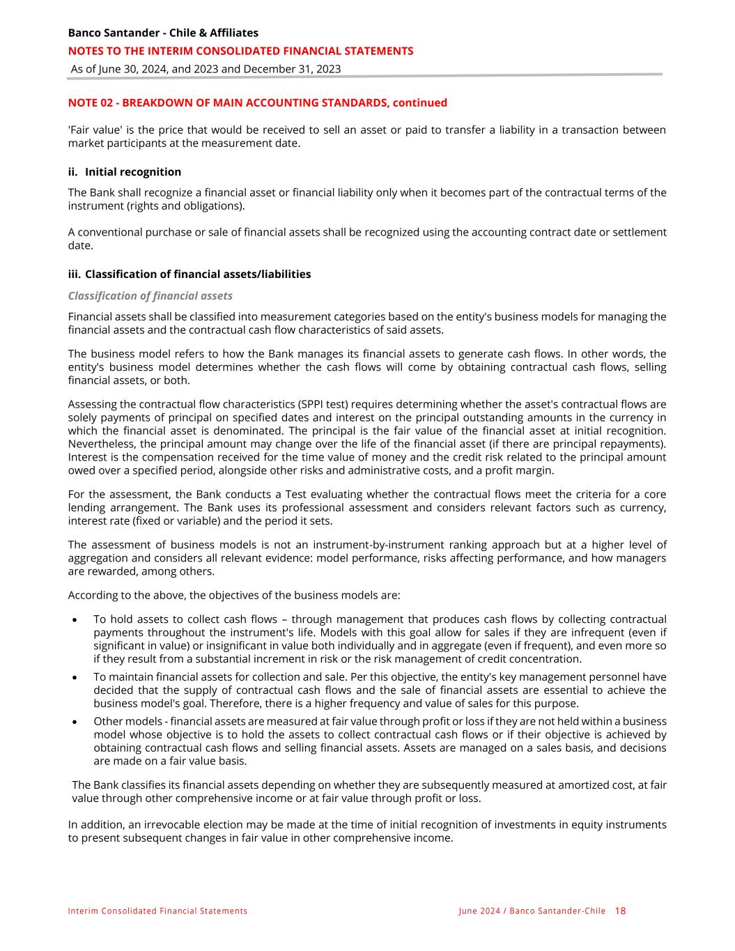 Banco Santander - Chile & Affiliates NOTES TO THE INTERIM CONSOLIDATED FINANCIAL STATEMENTS As of June 30, 2024, and 2023 and December 31, 2023 Interim Consolidated Financial Statements June 2024 / Banco Santander -Chile 18 NOTE 02 - BREAKDOWN OF MAIN ACCOUNTING STANDARDS, continued 'Fair value' is the price that would be received to sell an asset or paid to transfer a liability in a transaction between market participants at the measurement date. ii. Initial recognition The Bank shall recognize a financial asset or financial liability only when it becomes part of the contractual terms of the instrument (rights and obligations). A conventional purchase or sale of financial assets shall be recognized using the accounting contract date or settlement date. iii. Classification of financial assets/liabilities Classification of financial assets Financial assets shall be classified into measurement categories based on the entity's business models for managing the financial assets and the contractual cash flow characteristics of said assets. The business model refers to how the Bank manages its financial assets to generate cash flows. In other words, the entity's business model determines whether the cash flows will come by obtaining contractual cash flows, selling financial assets, or both. Assessing the contractual flow characteristics (SPPI test) requires determining whether the asset's contractual flows are solely payments of principal on specified dates and interest on the principal outstanding amounts in the currency in which the financial asset is denominated. The principal is the fair value of the financial asset at initial recognition. Nevertheless, the principal amount may change over the life of the financial asset (if there are principal repayments). Interest is the compensation received for the time value of money and the credit risk related to the principal amount owed over a specified period, alongside other risks and administrative costs, and a profit margin. For the assessment, the Bank conducts a Test evaluating whether the contractual flows meet the criteria for a core lending arrangement. The Bank uses its professional assessment and considers relevant factors such as currency, interest rate (fixed or variable) and the period it sets. The assessment of business models is not an instrument-by-instrument ranking approach but at a higher level of aggregation and considers all relevant evidence: model performance, risks affecting performance, and how managers are rewarded, among others. According to the above, the objectives of the business models are: • To hold assets to collect cash flows – through management that produces cash flows by collecting contractual payments throughout the instrument's life. Models with this goal allow for sales if they are infrequent (even if significant in value) or insignificant in value both individually and in aggregate (even if frequent), and even more so if they result from a substantial increment in risk or the risk management of credit concentration. • To maintain financial assets for collection and sale. Per this objective, the entity's key management personnel have decided that the supply of contractual cash flows and the sale of financial assets are essential to achieve the business model's goal. Therefore, there is a higher frequency and value of sales for this purpose. • Other models - financial assets are measured at fair value through profit or loss if they are not held within a business model whose objective is to hold the assets to collect contractual cash flows or if their objective is achieved by obtaining contractual cash flows and selling financial assets. Assets are managed on a sales basis, and decisions are made on a fair value basis. The Bank classifies its financial assets depending on whether they are subsequently measured at amortized cost, at fair value through other comprehensive income or at fair value through profit or loss. In addition, an irrevocable election may be made at the time of initial recognition of investments in equity instruments to present subsequent changes in fair value in other comprehensive income.