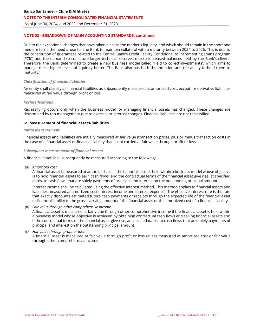 Banco Santander - Chile & Affiliates NOTES TO THE INTERIM CONSOLIDATED FINANCIAL STATEMENTS As of June 30, 2024, and 2023 and December 31, 2023 Interim Consolidated Financial Statements June 2024 / Banco Santander -Chile 19 NOTE 02 - BREAKDOWN OF MAIN ACCOUNTING STANDARDS, continued Due to the exceptional changes that have taken place in the market's liquidity, and which should remain in the short and medium term, the need arose for the Bank to maintain collateral with a maturity between 2024 to 2026. This is due to the constitution of guarantees related to the Central Bank's Credit Facility Conditional to Incrementing Loans program (FCIC) and the demand to constitute larger technical reserves due to increased balances held by the Bank's clients. Therefore, the Bank determined to create a new business model called 'Held to collect investments', which aims to manage these higher levels of liquidity better. The Bank also has both the intention and the ability to hold them to maturity. Classification of financial liabilities An entity shall classify all financial liabilities as subsequently measured at amortized cost, except for derivative liabilities measured at fair value through profit or loss. Reclassifications Reclassifying occurs only when the business model for managing financial assets has changed. These changes are determined by top management due to external or internal changes. Financial liabilities are not reclassified. iv. Measurement of financial assets/liabilities Initial measurement Financial assets and liabilities are initially measured at fair value (transaction price), plus or minus transaction costs in the case of a financial asset or financial liability that is not carried at fair value through profit or loss. Subsequent measurement of financial assets A financial asset shall subsequently be measured according to the following: (a) Amortized cost A financial asset is measured at amortized cost if the financial asset is held within a business model whose objective is to hold financial assets to earn cash flows, and the contractual terms of the financial asset give rise, at specified dates, to cash flows that are solely payments of principal and interest on the outstanding principal amount. Interest income shall be calculated using the effective interest method. This method applies to financial assets and liabilities measured at amortized cost (interest income and interest expense). The effective interest rate is the rate that exactly discounts estimated future cash payments or receipts through the expected life of the financial asset or financial liability to the gross carrying amount of the financial asset or the amortized cost of a financial liability. (b) Fair value through other comprehensive income A financial asset is measured at fair value through other comprehensive income if the financial asset is held within a business model whose objective is achieved by obtaining contractual cash flows and selling financial assets and if the contractual terms of the financial asset give rise, at specified dates, to cash flows that are solely payments of principal and interest on the outstanding principal amount. (c) Fair value through profit or loss A financial asset is measured at fair value through profit or loss unless measured at amortized cost or fair value through other comprehensive income.
