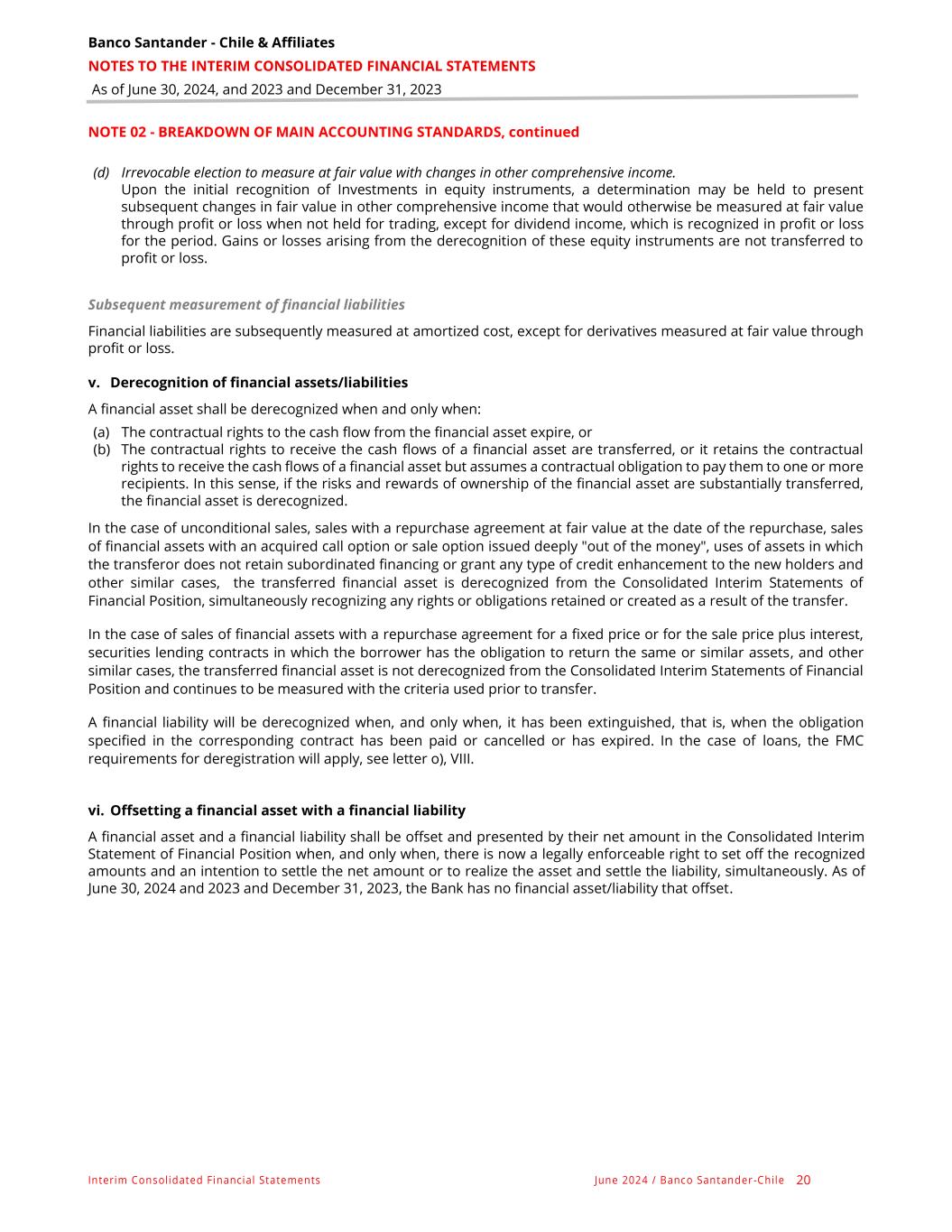 Banco Santander - Chile & Affiliates NOTES TO THE INTERIM CONSOLIDATED FINANCIAL STATEMENTS As of June 30, 2024, and 2023 and December 31, 2023 Interim Consolidated Financial Statements June 2024 / Banco Santander -Chile 20 NOTE 02 - BREAKDOWN OF MAIN ACCOUNTING STANDARDS, continued (d) Irrevocable election to measure at fair value with changes in other comprehensive income. Upon the initial recognition of Investments in equity instruments, a determination may be held to present subsequent changes in fair value in other comprehensive income that would otherwise be measured at fair value through profit or loss when not held for trading, except for dividend income, which is recognized in profit or loss for the period. Gains or losses arising from the derecognition of these equity instruments are not transferred to profit or loss. Subsequent measurement of financial liabilities Financial liabilities are subsequently measured at amortized cost, except for derivatives measured at fair value through profit or loss. v. Derecognition of financial assets/liabilities A financial asset shall be derecognized when and only when: (a) The contractual rights to the cash flow from the financial asset expire, or (b) The contractual rights to receive the cash flows of a financial asset are transferred, or it retains the contractual rights to receive the cash flows of a financial asset but assumes a contractual obligation to pay them to one or more recipients. In this sense, if the risks and rewards of ownership of the financial asset are substantially transferred, the financial asset is derecognized. In the case of unconditional sales, sales with a repurchase agreement at fair value at the date of the repurchase, sales of financial assets with an acquired call option or sale option issued deeply "out of the money", uses of assets in which the transferor does not retain subordinated financing or grant any type of credit enhancement to the new holders and other similar cases, the transferred financial asset is derecognized from the Consolidated Interim Statements of Financial Position, simultaneously recognizing any rights or obligations retained or created as a result of the transfer. In the case of sales of financial assets with a repurchase agreement for a fixed price or for the sale price plus interest, securities lending contracts in which the borrower has the obligation to return the same or similar assets, and other similar cases, the transferred financial asset is not derecognized from the Consolidated Interim Statements of Financial Position and continues to be measured with the criteria used prior to transfer. A financial liability will be derecognized when, and only when, it has been extinguished, that is, when the obligation specified in the corresponding contract has been paid or cancelled or has expired. In the case of loans, the FMC requirements for deregistration will apply, see letter o), VIII. vi. Offsetting a financial asset with a financial liability A financial asset and a financial liability shall be offset and presented by their net amount in the Consolidated Interim Statement of Financial Position when, and only when, there is now a legally enforceable right to set off the recognized amounts and an intention to settle the net amount or to realize the asset and settle the liability, simultaneously. As of June 30, 2024 and 2023 and December 31, 2023, the Bank has no financial asset/liability that offset.
