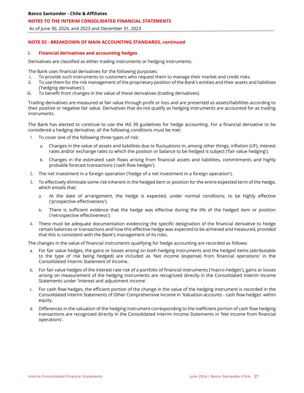 Banco Santander - Chile & Affiliates NOTES TO THE INTERIM CONSOLIDATED FINANCIAL STATEMENTS As of June 30, 2024, and 2023 and December 31, 2023 Interim Consolidated Financial Statements June 2024 / Banco Santander -Chile 21 NOTE 02 - BREAKDOWN OF MAIN ACCOUNTING STANDARDS, continued i. Financial derivatives and accounting hedges Derivatives are classified as either trading instruments or hedging instruments. The Bank uses financial derivatives for the following purposes: i. To provide such instruments to customers who request them to manage their market and credit risks. ii. To use them for the risk management of the proprietary position of the Bank's entities and their assets and liabilities ('hedging derivatives'). iii. To benefit from changes in the value of these derivatives (trading derivatives). Trading derivatives are measured at fair value through profit or loss and are presented as assets/liabilities according to their positive or negative fair value. Derivatives that do not qualify as hedging instruments are accounted for as trading instruments. The Bank has elected to continue to use the IAS 39 guidelines for hedge accounting. For a financial derivative to be considered a hedging derivative, all the following conditions must be met: 1. To cover one of the following three types of risk: a. Changes in the value of assets and liabilities due to fluctuations in, among other things, inflation (UF), interest rates and/or exchange rates to which the position or balance to be hedged is subject ('fair value hedging'). b. Changes in the estimated cash flows arising from financial assets and liabilities, commitments and highly probable forecast transactions ('cash flow hedges'). 2. The net investment in a foreign operation ('hedge of a net investment in a foreign operation'). 3. To effectively eliminate some risk inherent in the hedged item or position for the entire expected term of the hedge, which entails that: a. At the date of arrangement, the hedge is expected, under normal conditions, to be highly effective ('prospective effectiveness'). b. There is sufficient evidence that the hedge was effective during the life of the hedged item or position ('retrospective effectiveness'). 4. There must be adequate documentation evidencing the specific designation of the financial derivative to hedge certain balances or transactions and how this effective hedge was expected to be achieved and measured, provided that this is consistent with the Bank's management of its risks. The changes in the value of financial instruments qualifying for hedge accounting are recorded as follows: a. For fair value hedges, the gains or losses arising on both hedging instruments and the hedged items (attributable to the type of risk being hedged) are included as 'Net income (expense) from financial operations' in the Consolidated Interim Statement of Income. b. For fair value hedges of the interest rate risk of a portfolio of financial instruments ('macro-hedges'), gains or losses arising on measurement of the hedging instruments are recognized directly in the Consolidated Interim Income Statements under 'Interest and adjustment income'. c. For cash flow hedges, the efficient portion of the change in the value of the hedging instrument is recorded in the Consolidated Interim Statements of Other Comprehensive Income in 'Valuation accounts - cash flow hedges' within equity. d. Differences in the valuation of the hedging instrument corresponding to the inefficient portion of cash flow hedging transactions are recognized directly in the Consolidated Interim Income Statements in 'Net income from financial operations'.