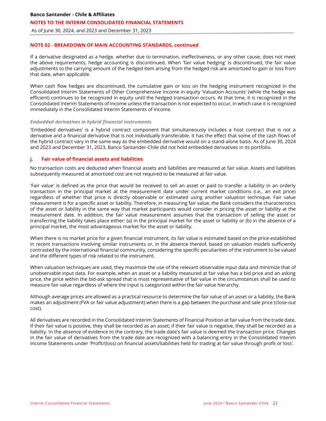 Banco Santander - Chile & Affiliates NOTES TO THE INTERIM CONSOLIDATED FINANCIAL STATEMENTS As of June 30, 2024, and 2023 and December 31, 2023 Interim Consolidated Financial Statements June 2024 / Banco Santander -Chile 22 NOTE 02 - BREAKDOWN OF MAIN ACCOUNTING STANDARDS, continued If a derivative designated as a hedge, whether due to termination, ineffectiveness, or any other cause, does not meet the above requirements, hedge accounting is discontinued. When 'fair value hedging' is discontinued, the fair value adjustments to the carrying amount of the hedged item arising from the hedged risk are amortized to gain or loss from that date, when applicable. When cash flow hedges are discontinued, the cumulative gain or loss on the hedging instrument recognized in the Consolidated Interim Statements of Other Comprehensive Income in equity 'Valuation Accounts' (while the hedge was efficient) continues to be recognized in equity until the hedged transaction occurs. At that time, it is recognized in the Consolidated Interim Statements of Income unless the transaction is not expected to occur, in which case it is recognized immediately in the Consolidated Interim Statements of Income. Embedded derivatives in hybrid financial instruments 'Embedded derivatives' is a hybrid contract component that simultaneously includes a host contract that is not a derivative and a financial derivative that is not individually transferable. It has the effect that some of the cash flows of the hybrid contract vary in the same way as the embedded derivative would on a stand-alone basis. As of June 30, 2024 and 2023 and December 31, 2023, Banco Santander-Chile did not hold embedded derivatives in its portfolio. j. Fair value of financial assets and liabilities No transaction costs are deducted when financial assets and liabilities are measured at fair value. Assets and liabilities subsequently measured at amortized cost are not required to be measured at fair value. 'Fair value' is defined as the price that would be received to sell an asset or paid to transfer a liability in an orderly transaction in the principal market at the measurement date under current market conditions (i.e., an exit price) regardless of whether that price is directly observable or estimated using another valuation technique. Fair value measurement is for a specific asset or liability. Therefore, in measuring fair value, the Bank considers the characteristics of the asset or liability in the same way that market participants would consider in pricing the asset or liability at the measurement date. In addition, the fair value measurement assumes that the transaction of selling the asset or transferring the liability takes place either: (a) in the principal market for the asset or liability or (b) in the absence of a principal market, the most advantageous market for the asset or liability. When there is no market price for a given financial instrument, its fair value is estimated based on the price established in recent transactions involving similar instruments or, in the absence thereof, based on valuation models sufficiently contrasted by the international financial community, considering the specific peculiarities of the instrument to be valued and the different types of risk related to the instrument. When valuation techniques are used, they maximize the use of the relevant observable input data and minimize that of unobservable input data. For example, when an asset or a liability measured at fair value has a bid price and an asking price, the price within the bid-ask spread that is most representative of fair value in the circumstances shall be used to measure fair value regardless of where the input is categorized within the fair value hierarchy. Although average prices are allowed as a practical resource to determine the fair value of an asset or a liability, the Bank makes an adjustment (FVA or fair value adjustment) when there is a gap between the purchase and sale price (close-out cost). All derivatives are recorded in the Consolidated Interim Statements of Financial Position at fair value from the trade date. If their fair value is positive, they shall be recorded as an asset; if their fair value is negative, they shall be recorded as a liability. In the absence of evidence to the contrary, the trade date's fair value is deemed the transaction price. Changes in the fair value of derivatives from the trade date are recognized with a balancing entry in the Consolidated Interim Income Statements under 'Profit/(loss) on financial assets/liabilities held for trading at fair value through profit or loss'.